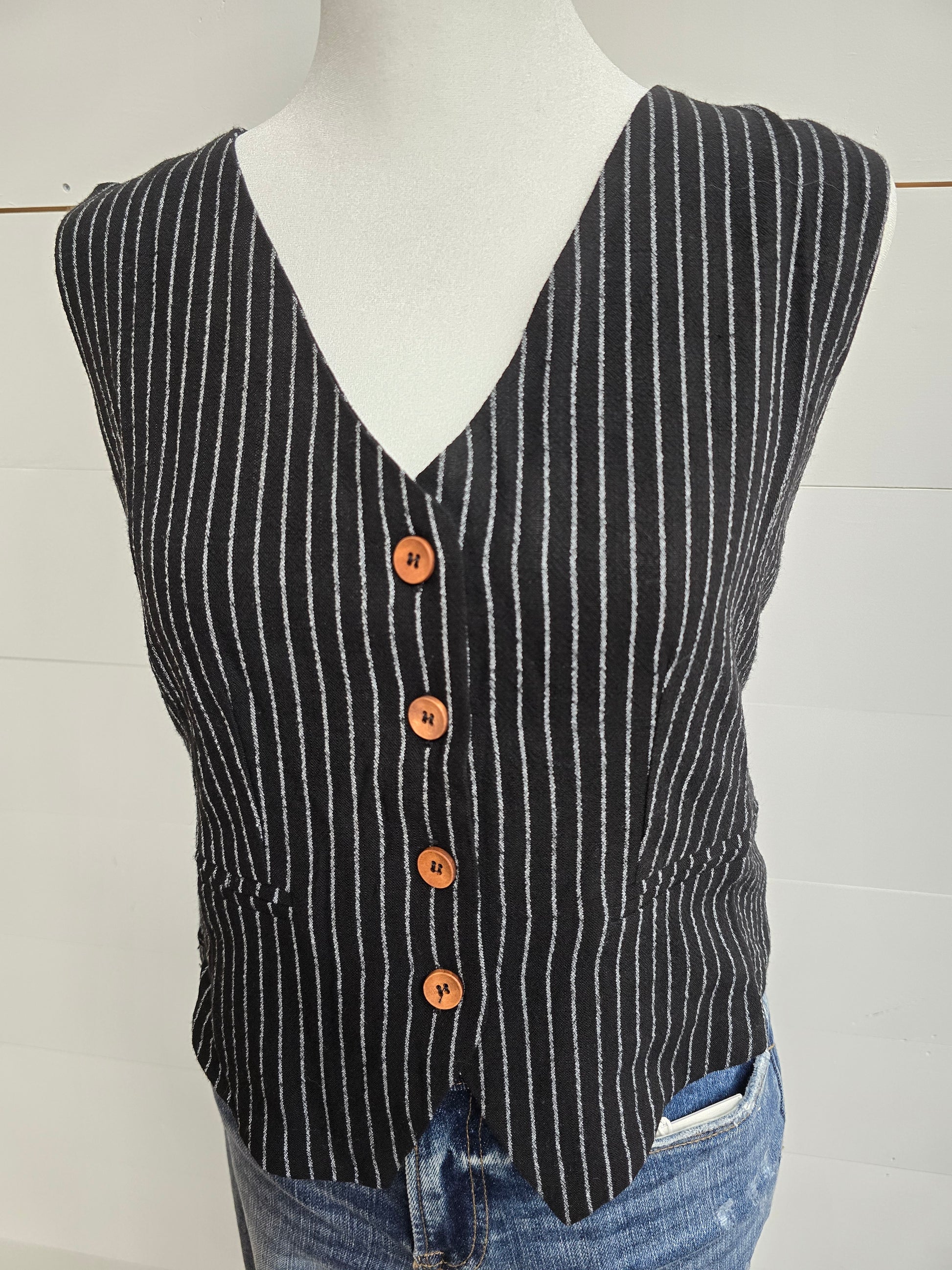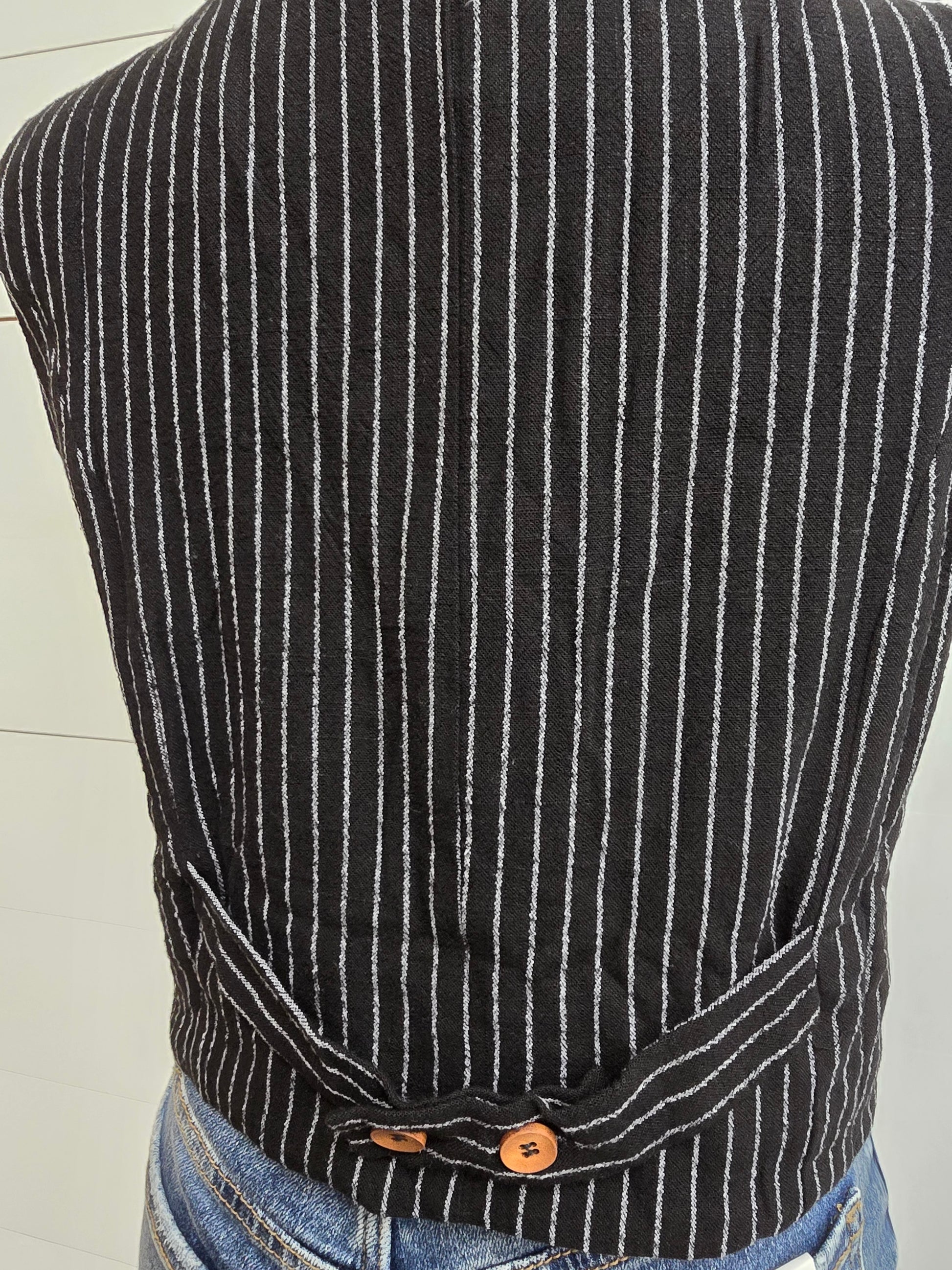 Add a touch of playfulness to your wardrobe with our pinstriped vest top. Featuring a button down front and v-neckline, this top also cinches at the waist for a flattering silhouette. And with faux pockets and a cropped length, it's the perfect blend of style and comfort.