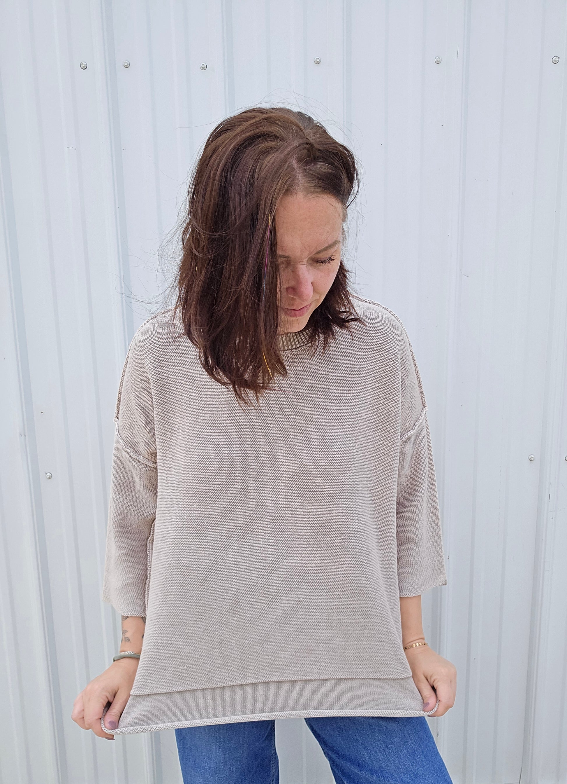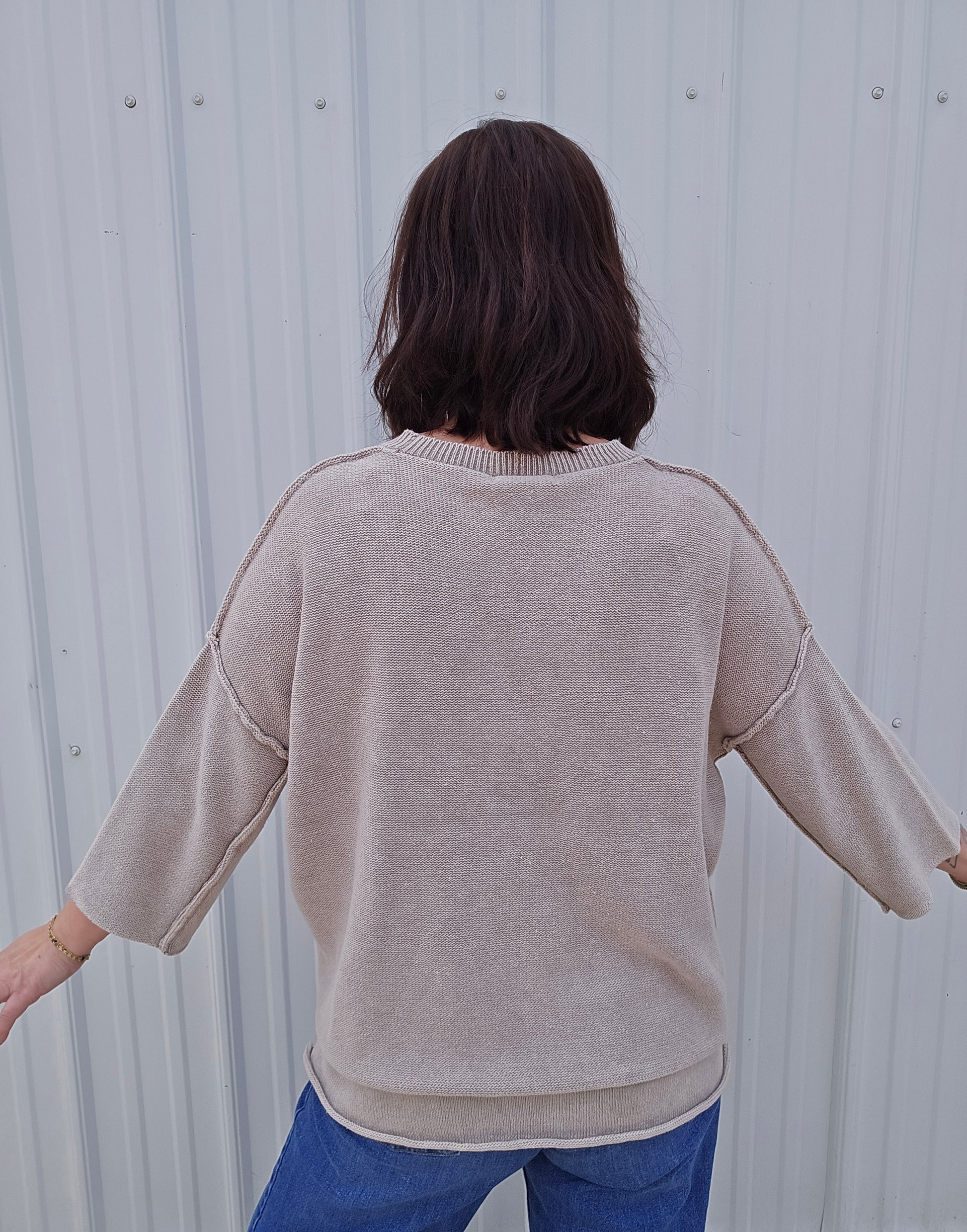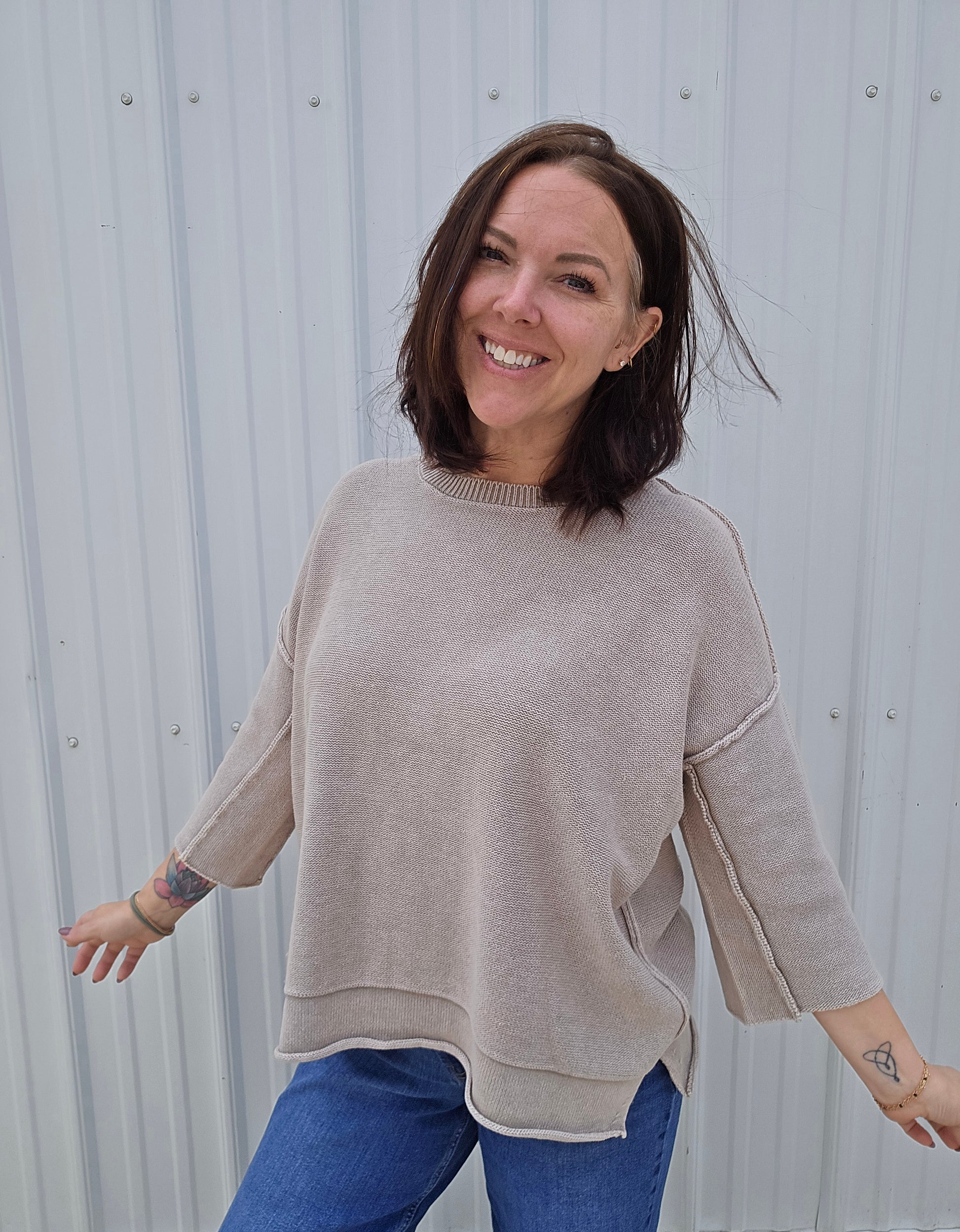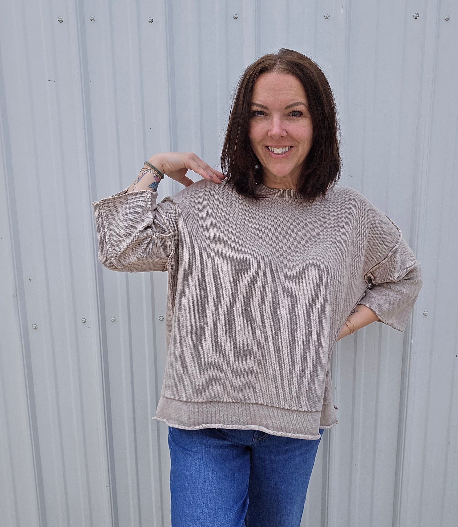 This washed 3/4 sleeve boxy sweater brings effortless cool to your wardrobe. With side slits for extra movement and a relaxed fit, it’s perfect for layering or wearing solo on breezy days. Cozy, casual, and ready to play!