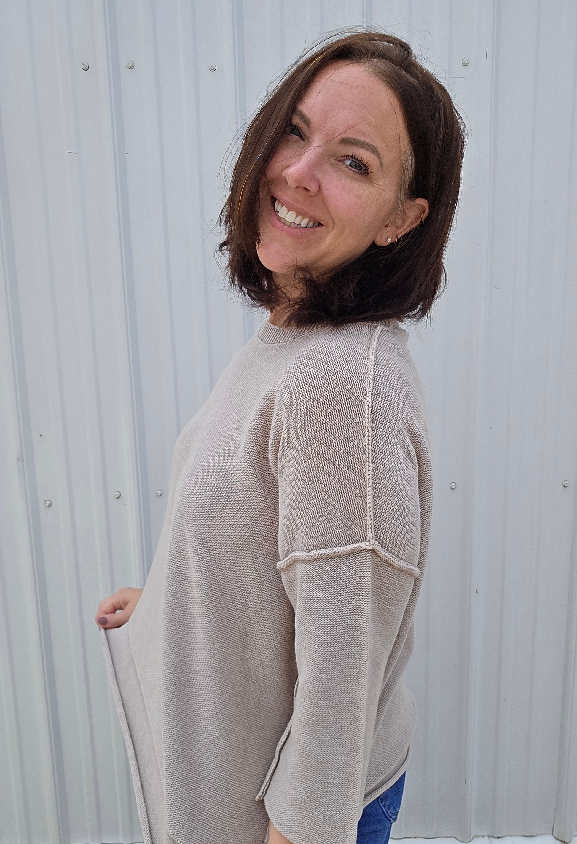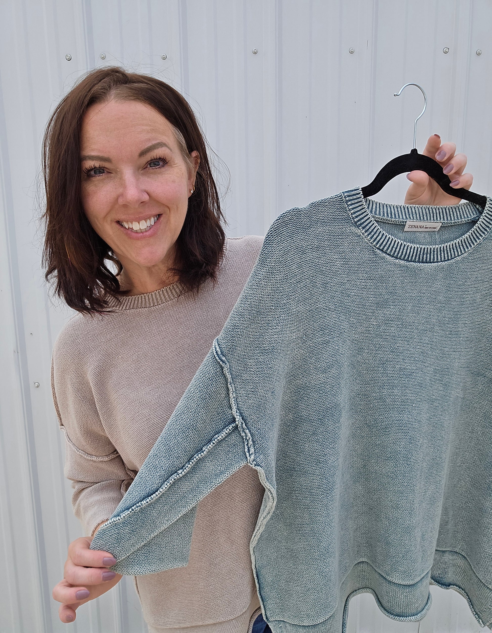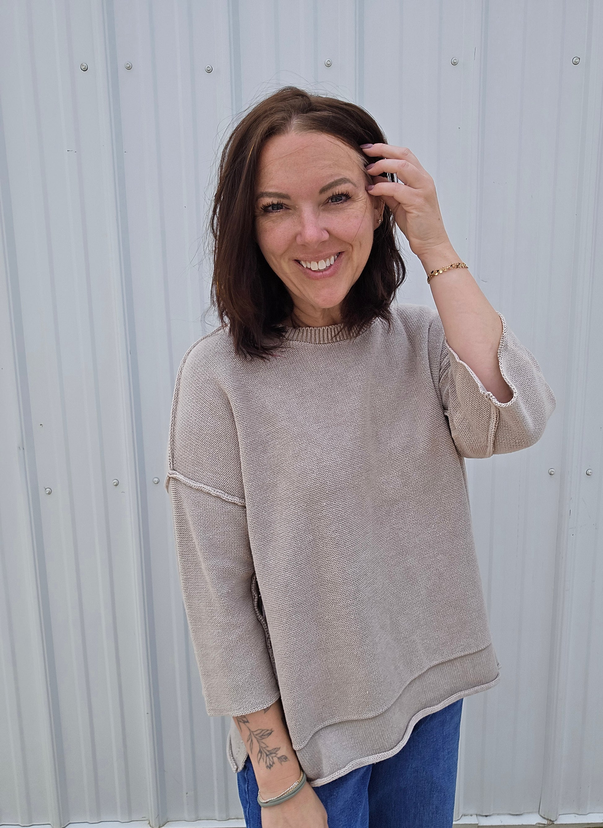 This washed 3/4 sleeve boxy sweater brings effortless cool to your wardrobe. With side slits for extra movement and a relaxed fit, it’s perfect for layering or wearing solo on breezy days. Cozy, casual, and ready to play!