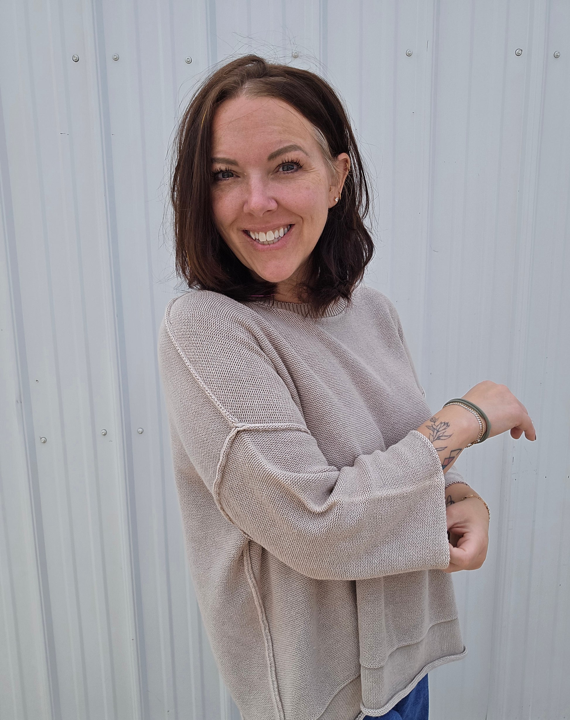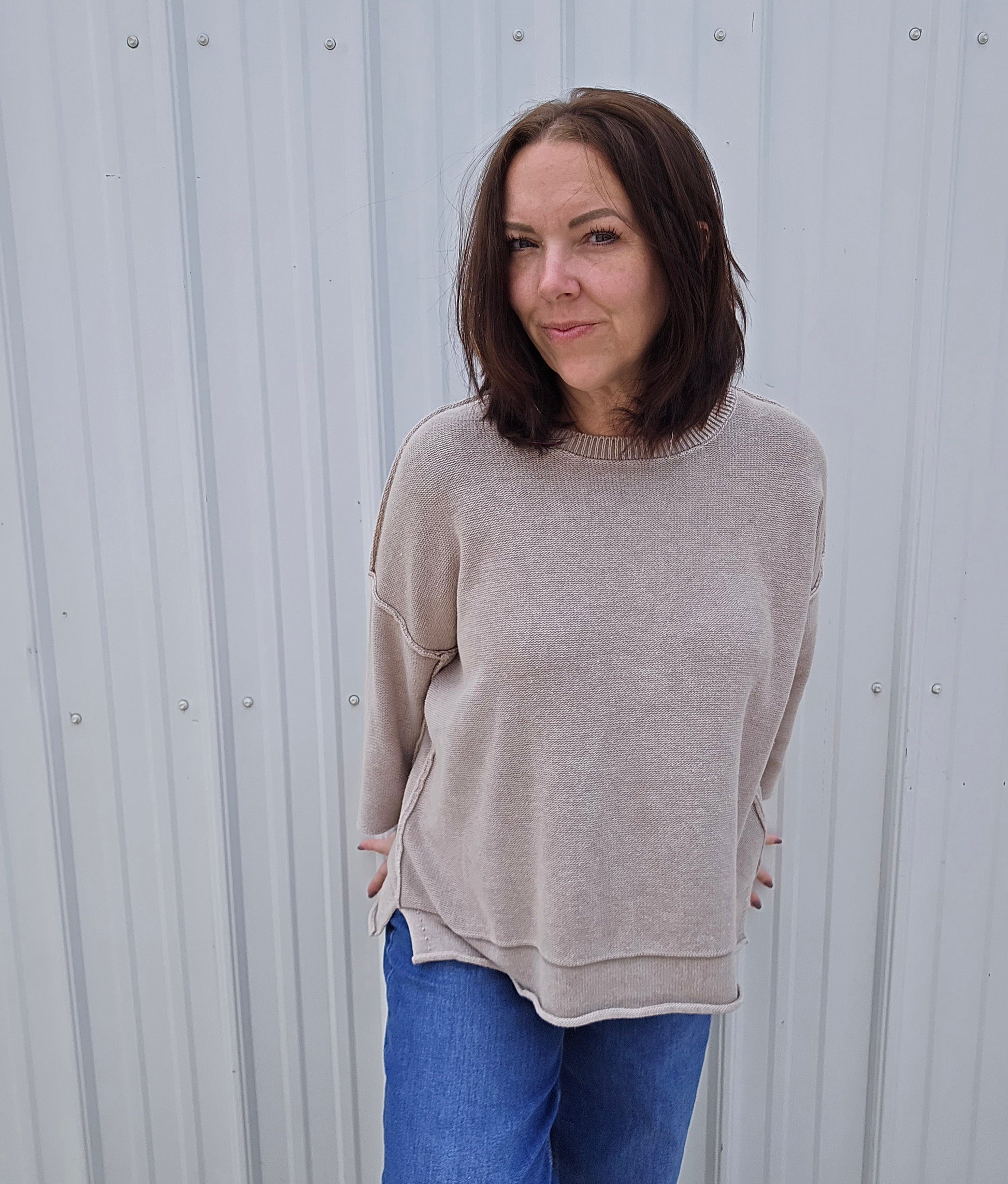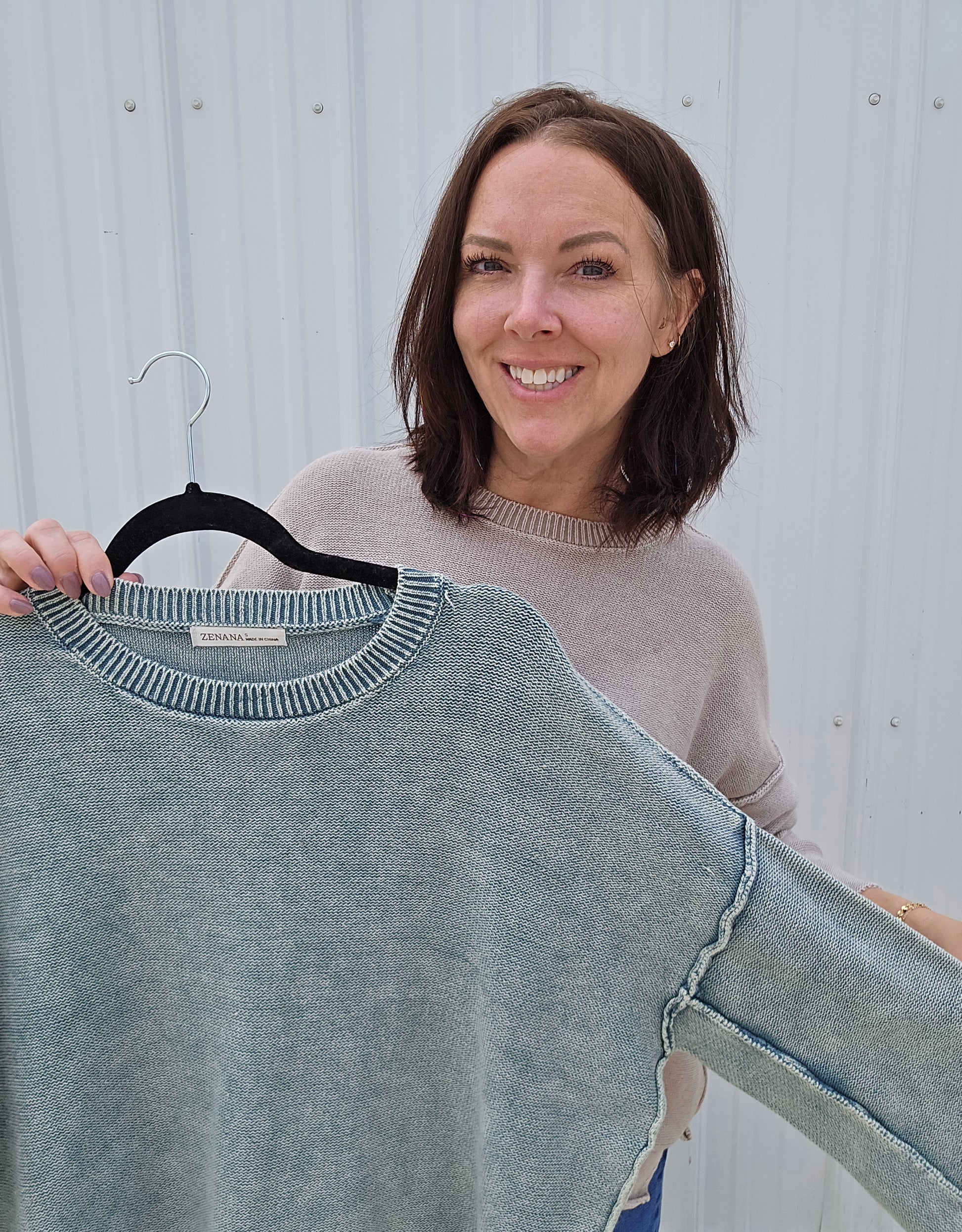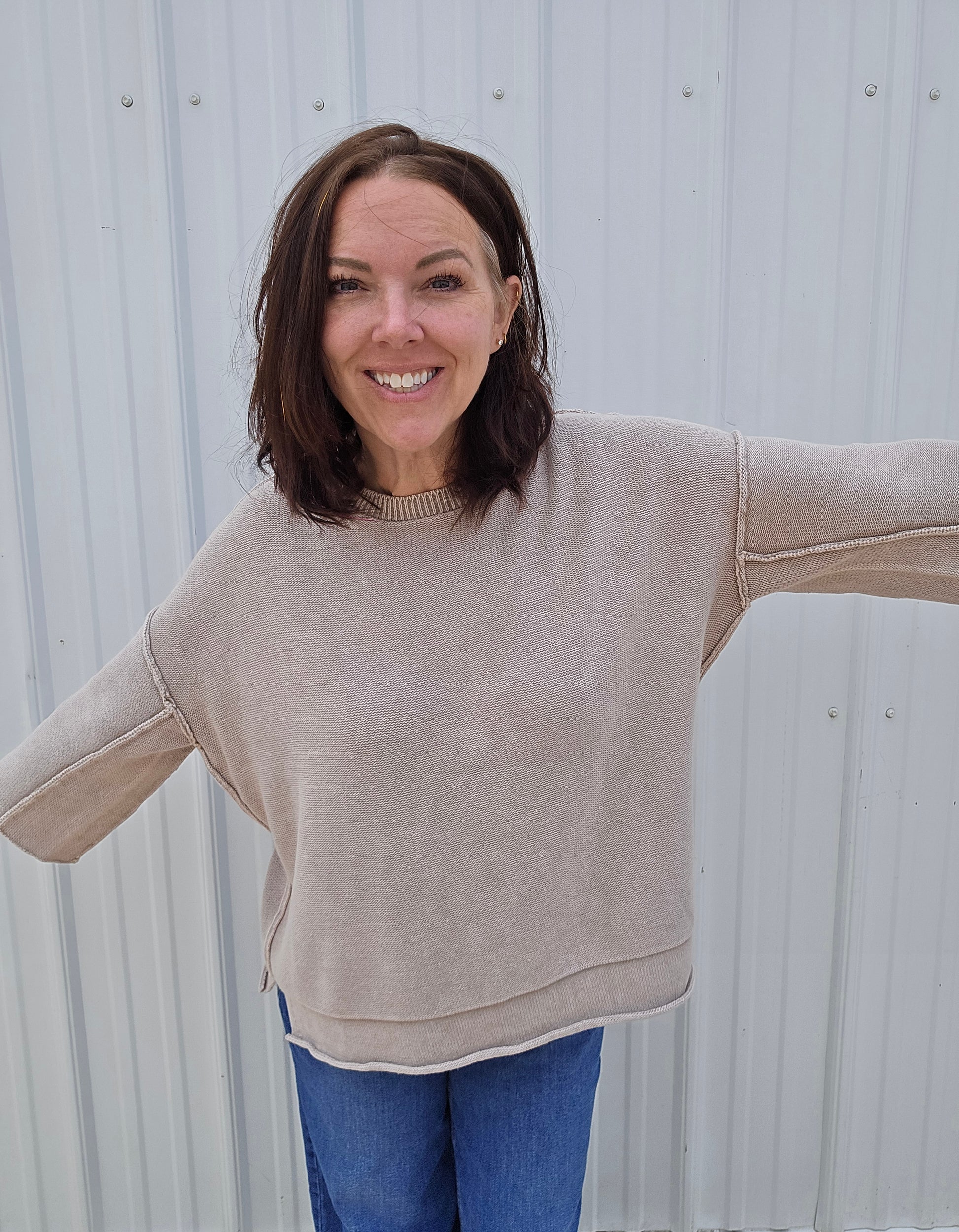 This washed 3/4 sleeve boxy sweater brings effortless cool to your wardrobe. With side slits for extra movement and a relaxed fit, it’s perfect for layering or wearing solo on breezy days. Cozy, casual, and ready to play!