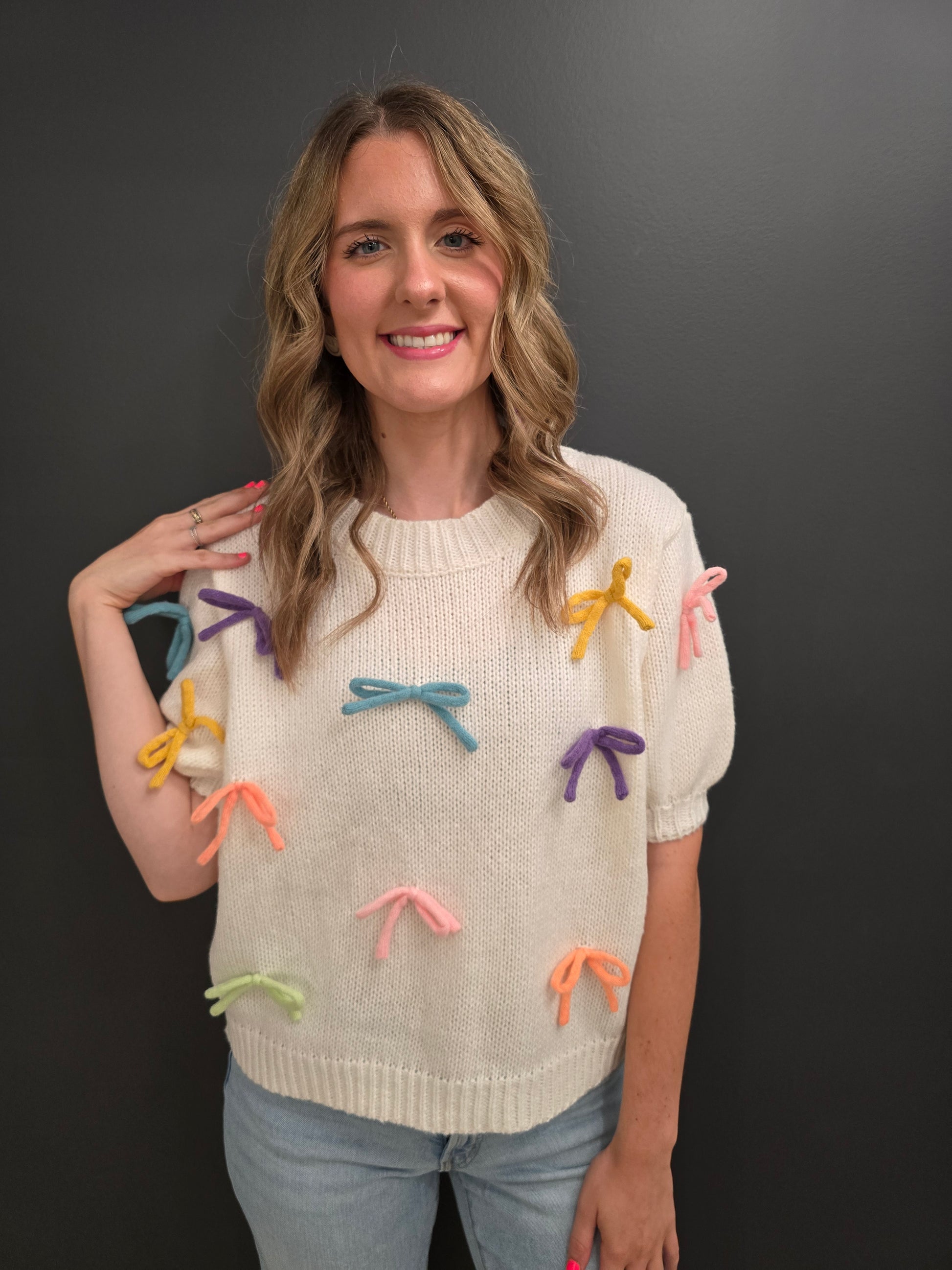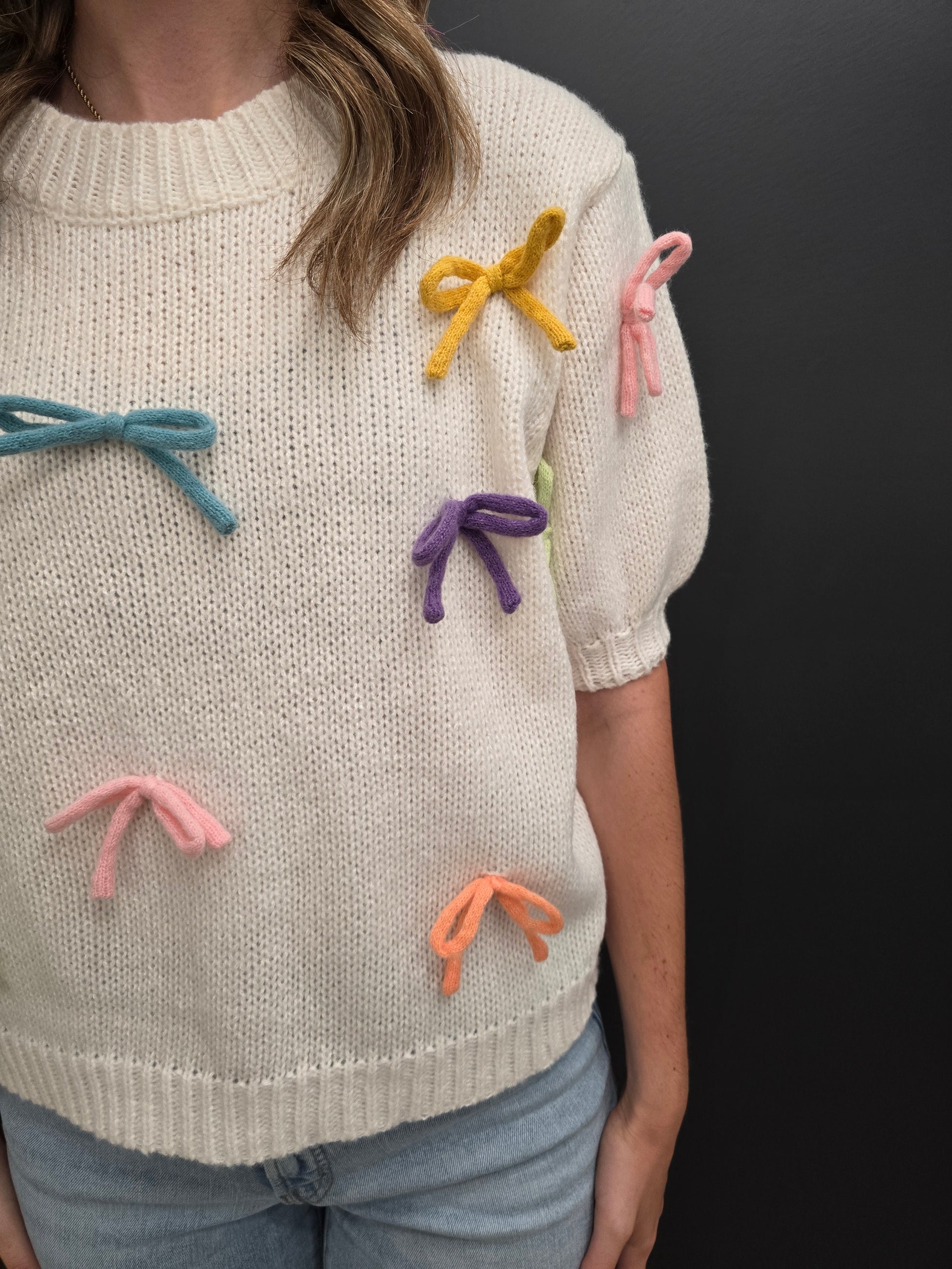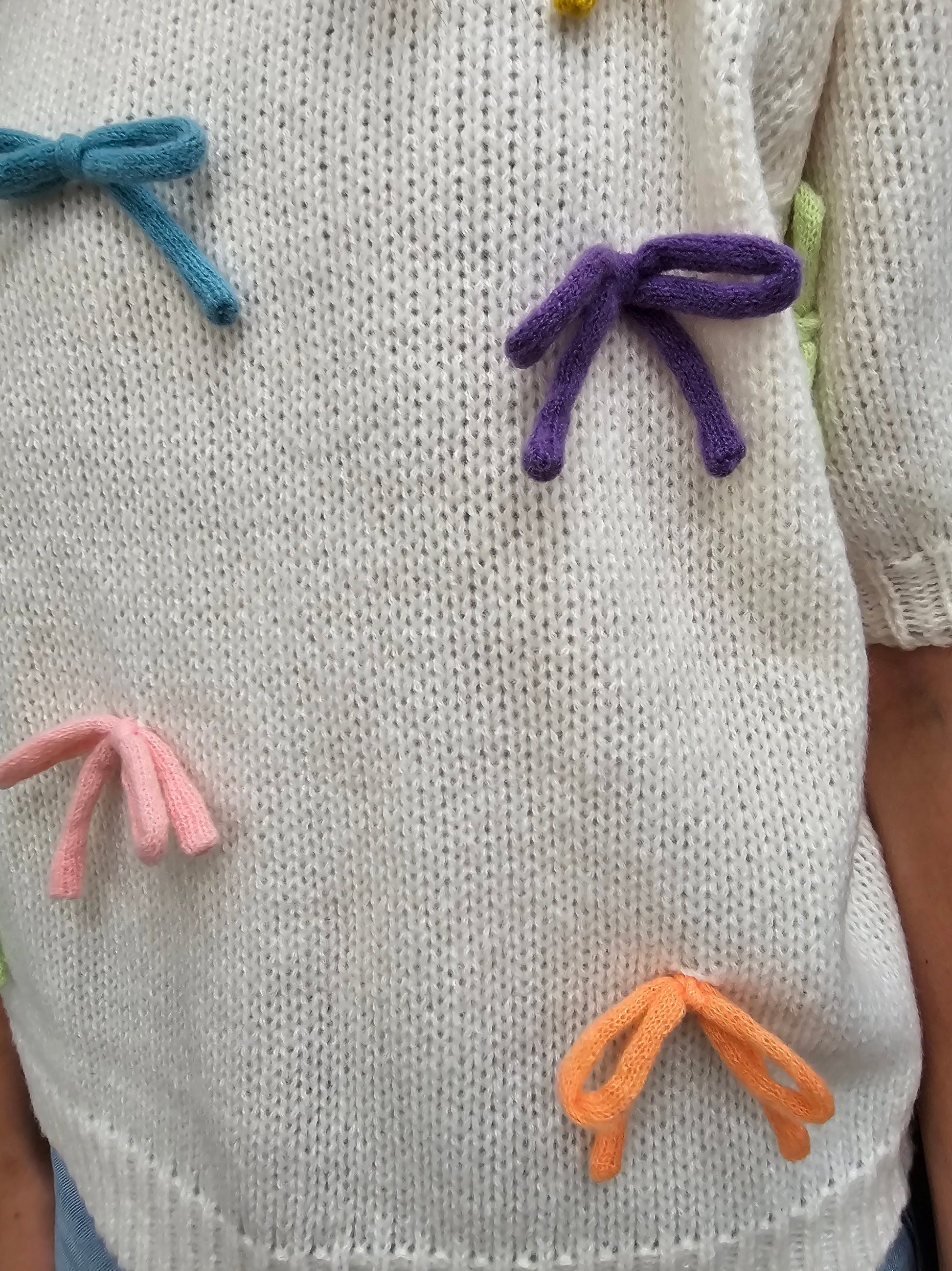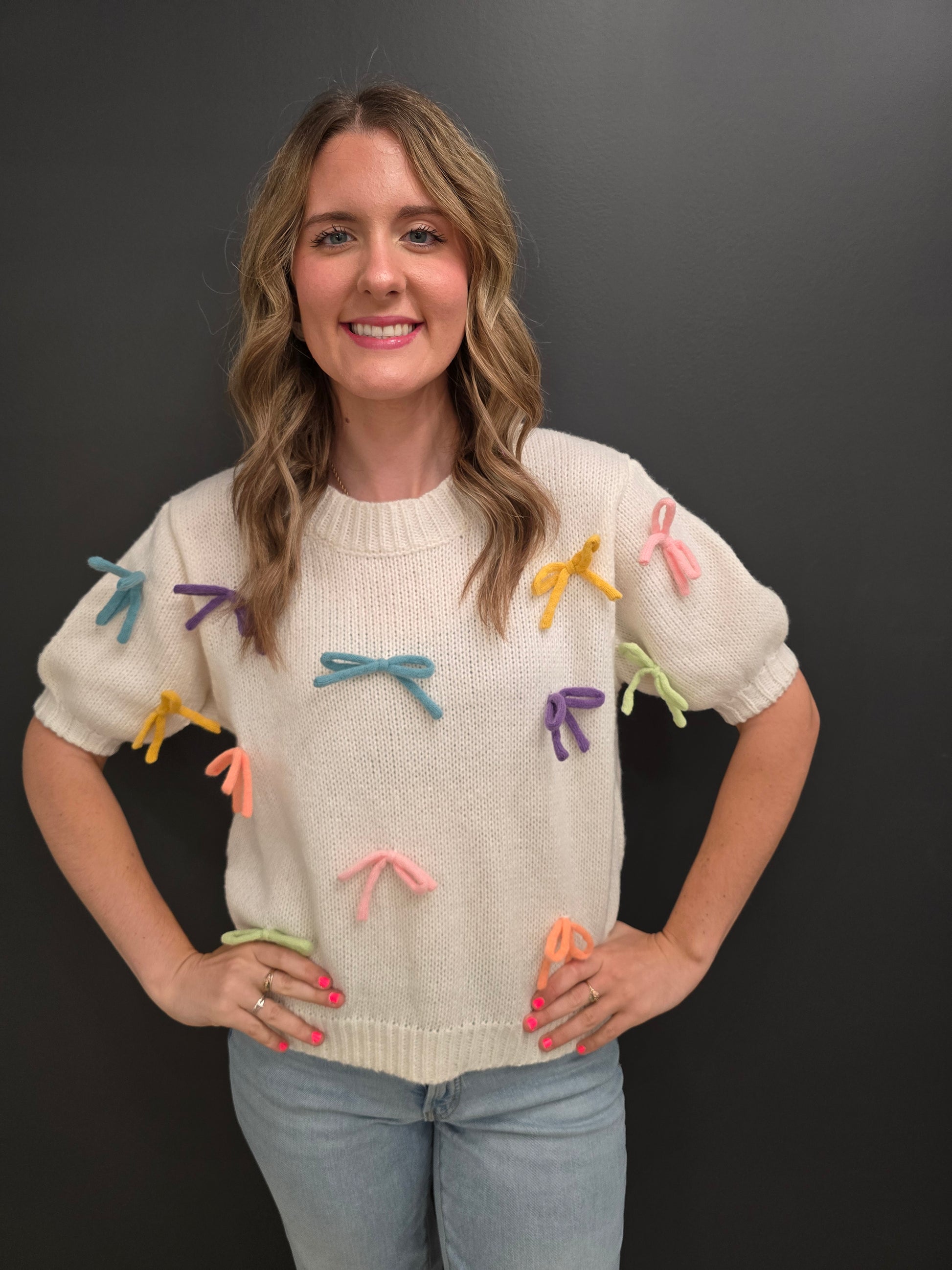 Get ready to add some playful style to your wardrobe with our multi-colored, bow-adorned, puff sleeve sweater! Featuring a unique combination of vibrant colors and charming bow accents, this sweater is the perfect addition to any outfit. Stay cozy and stylish all season long with this must-have piece.