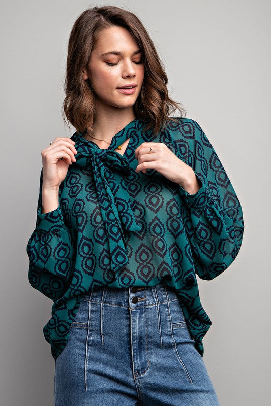 This breezy top features an allover playful pattern and a charming tie neckline that adds a flirty touch. Buttoned cuffs give a polished finish, while the relaxed, loose fit keeps you comfy all day. Made from lightweight, semi-sheer fabric, it’s perfect for layering or wearing on its own when you want to feel effortlessly cool and fun. In a beautiful Green color.
