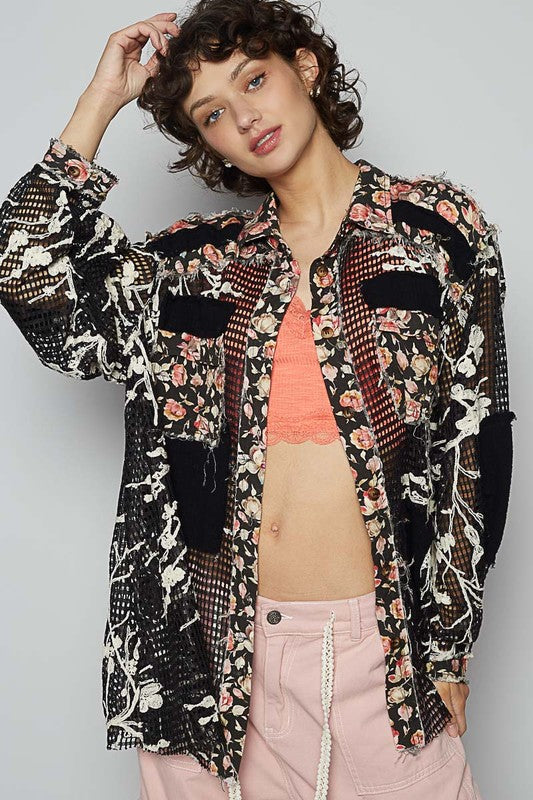Upgrade your wardrobe with our stunning designed in collar shirt. The relaxed fit, balloon sleeve, and crochet lace with raw edge detail adds a touch of elegance to this top. The pointed floral pattern adds a touch of femininity.