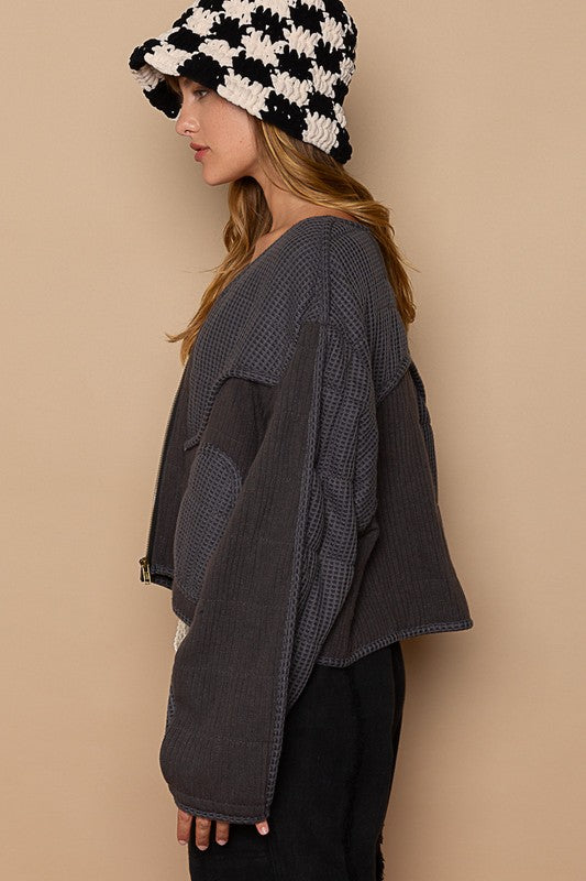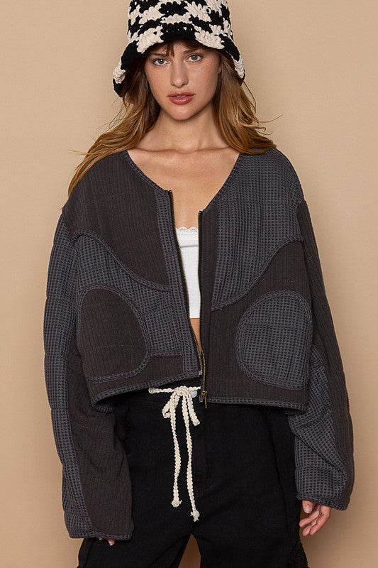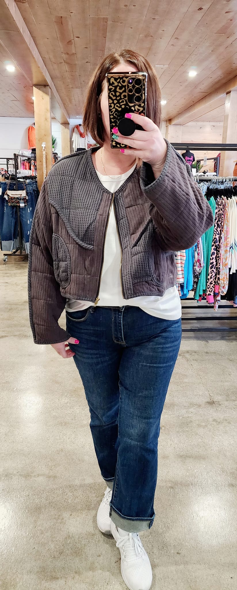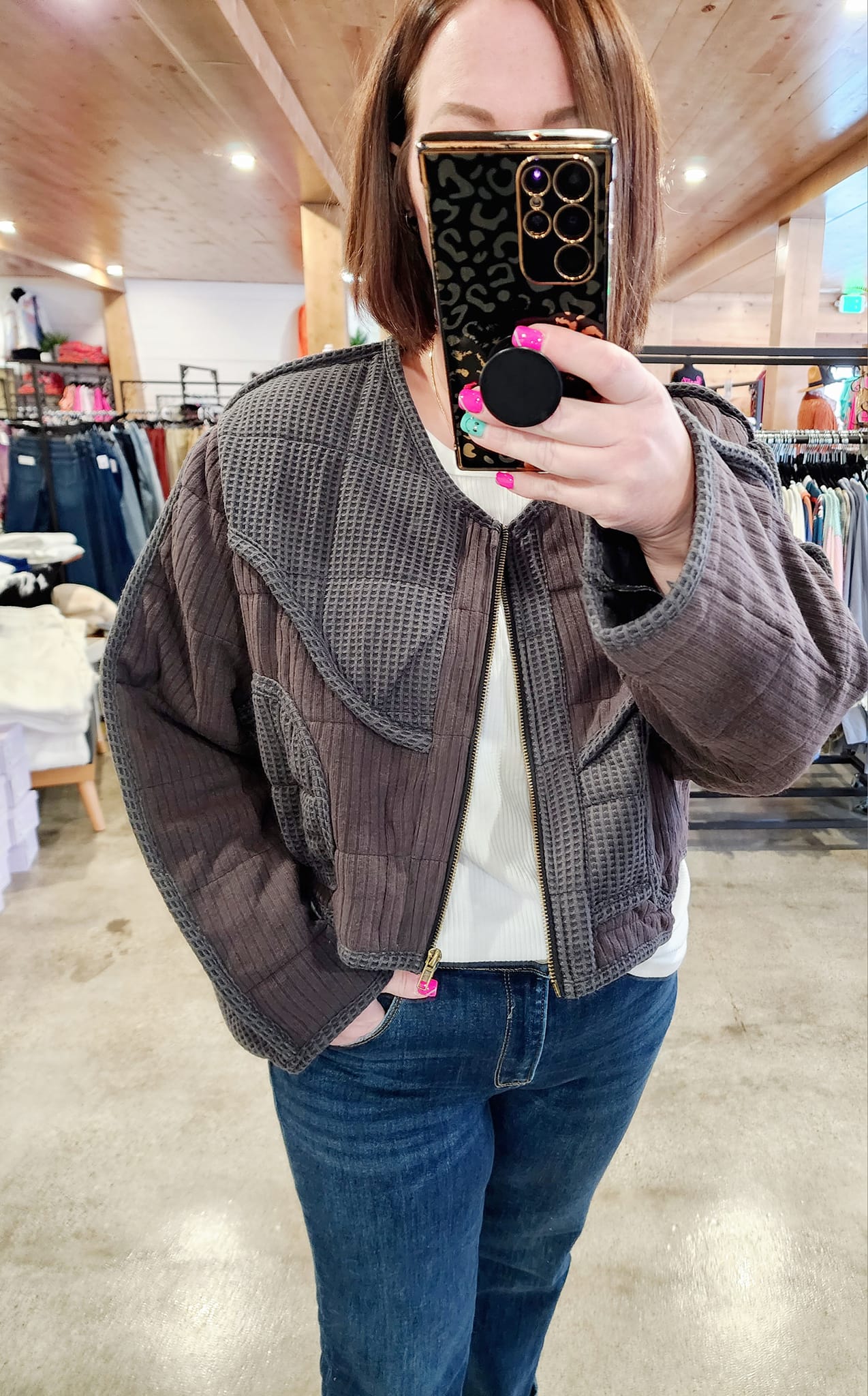Indulge in luxurious comfort quilted shacket! Designed with a regular fit and functional front pockets, this shacket is perfect for any occasion. The viding detailing and patched knit fabric add a touch of elegance and sophistication. Stay cozy and stylish with our zip up top.