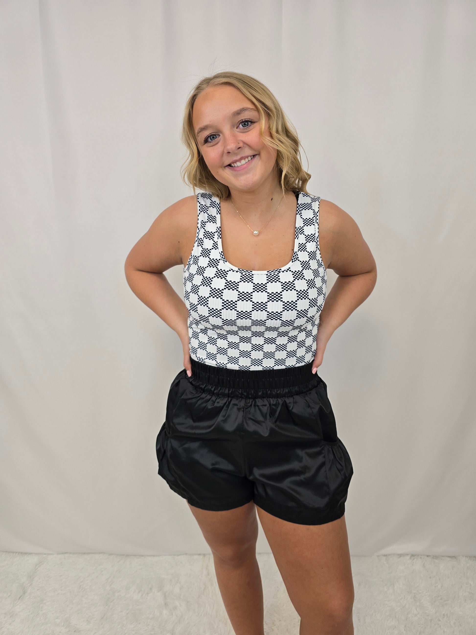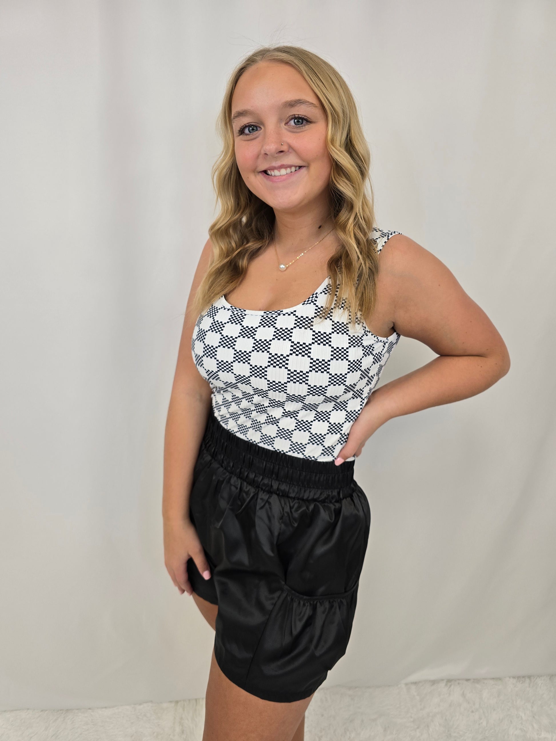 Elevate your style with our Black Checkered Print U Neck Cropped Tank Top! Featuring a stylish checkered print and a flattering U neck design, this tank is a must-have for any fashion-forward wardrobe. Perfect for pairing with high-waisted bottoms, this top will enhance your silhouette and make a statement.
