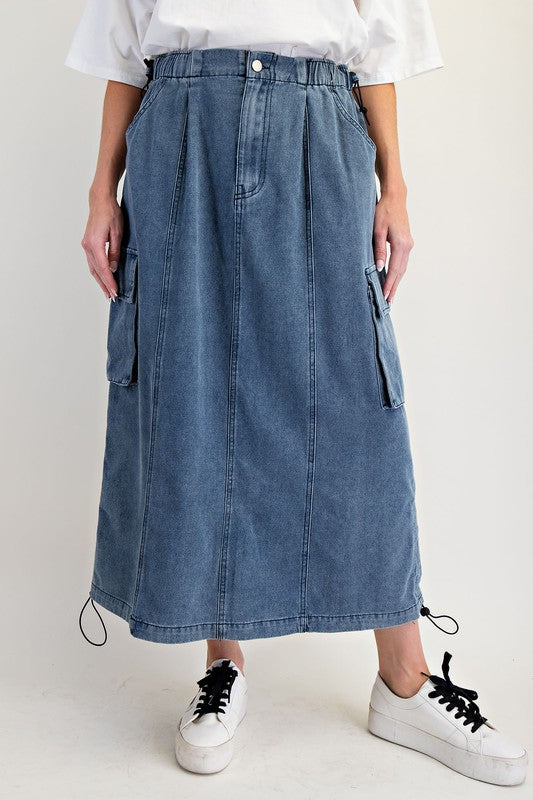 This midi-length denim cargo skirt combines comfort and style with its elastic waist and playful toggle drawstrings on both sides. Featuring a relaxed, loose fit and practical cargo pockets, it’s perfect for adding a casual, fun vibe to your everyday look.