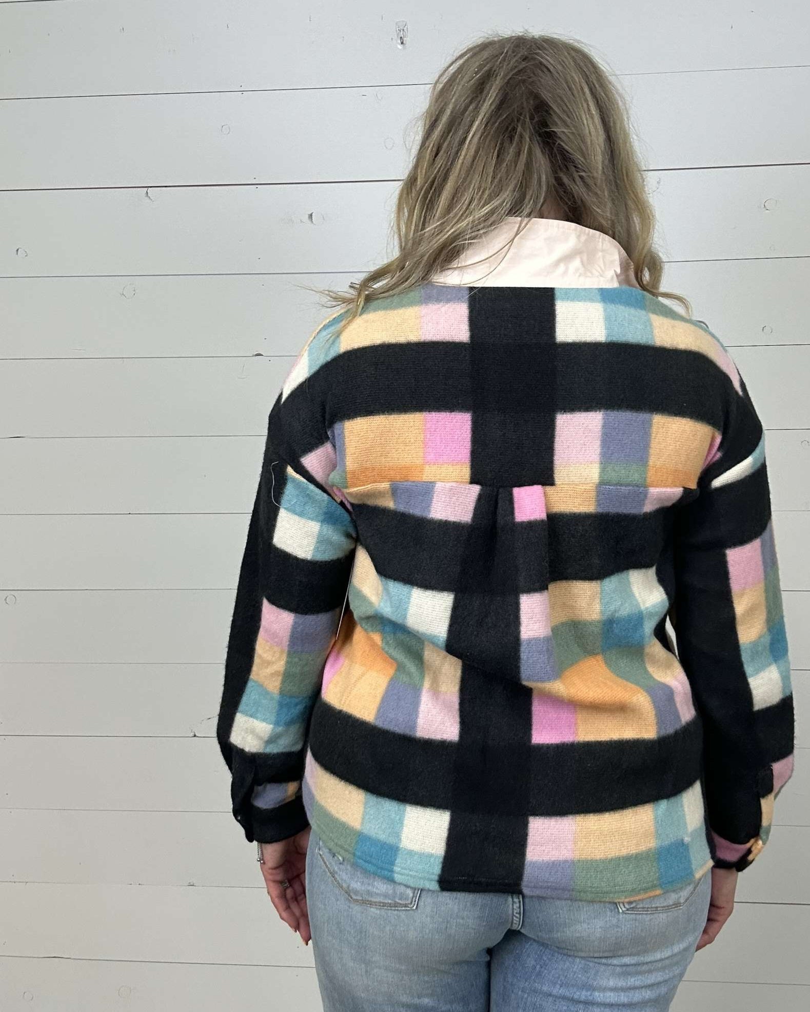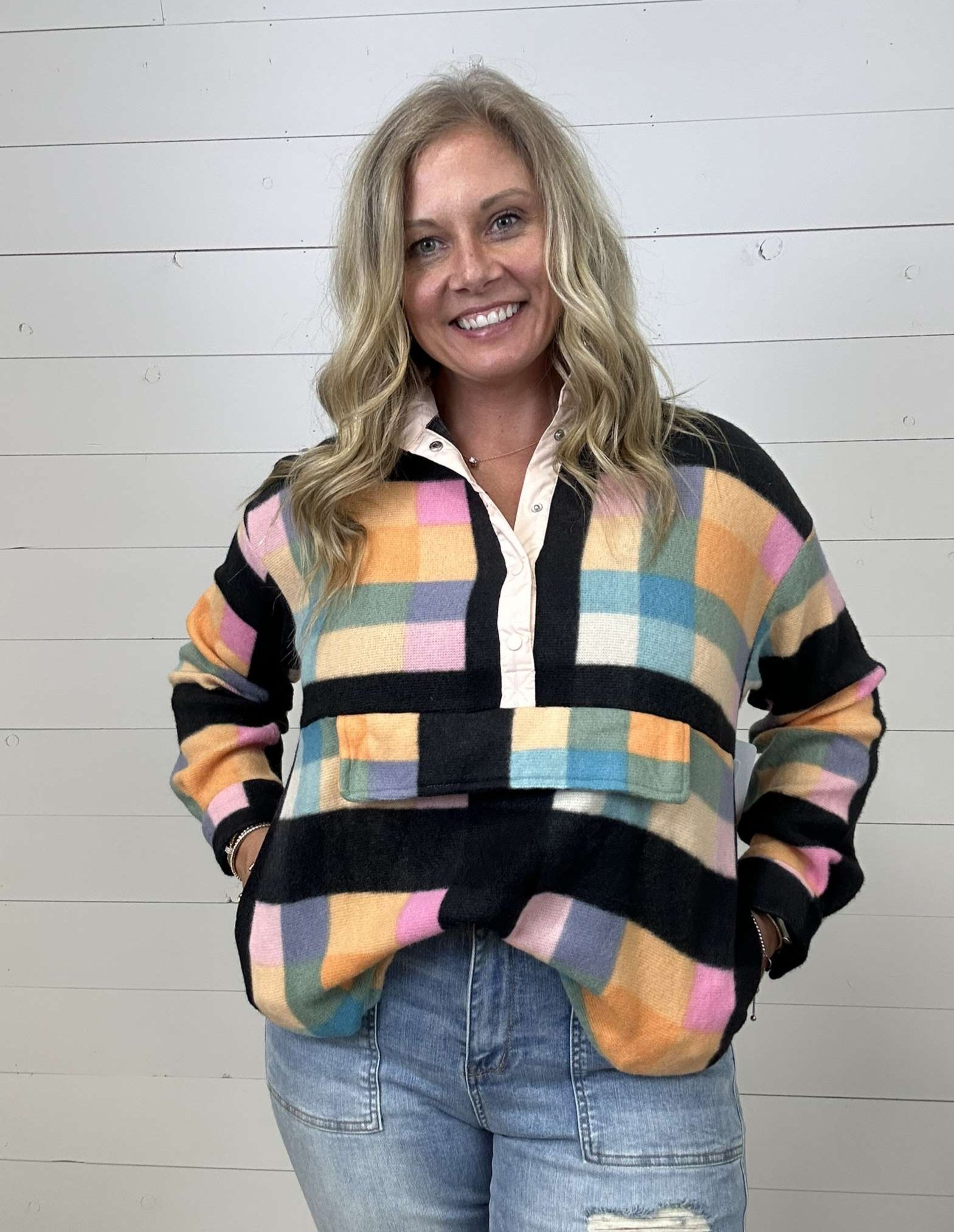 Upgrade your sweatshirt game with this Colorful Plaid Pullover! Featuring a trendy Black Plaid print, functional pockets, and a unique Half Button Collar design, this pullover is perfect for those who value style and convenience.