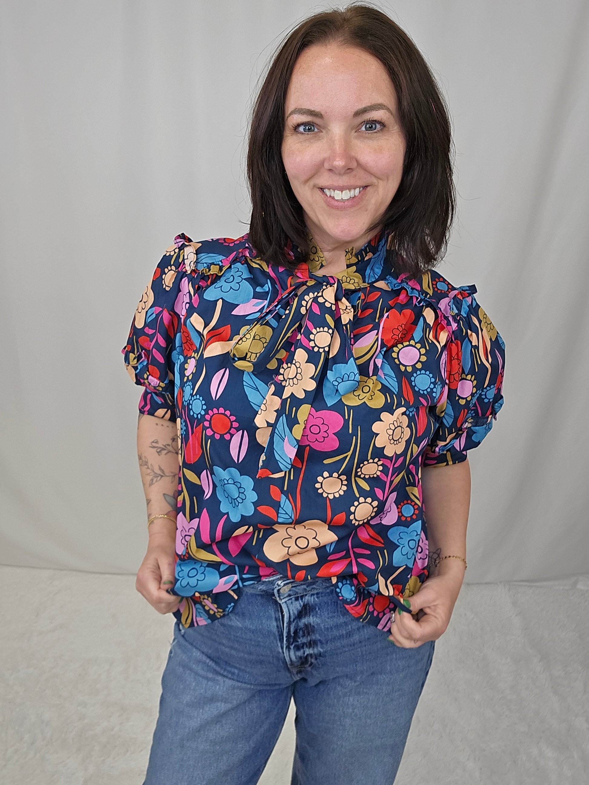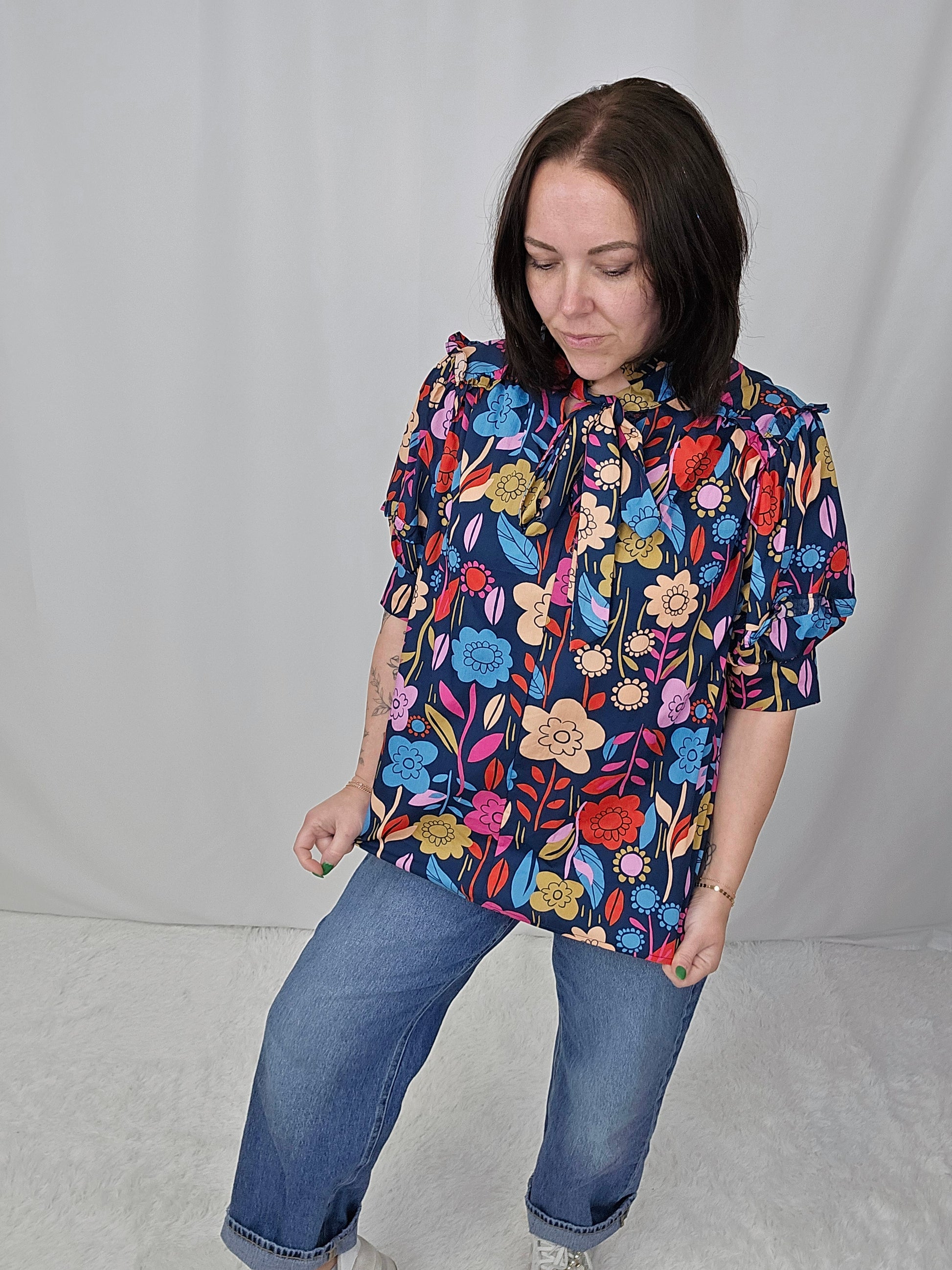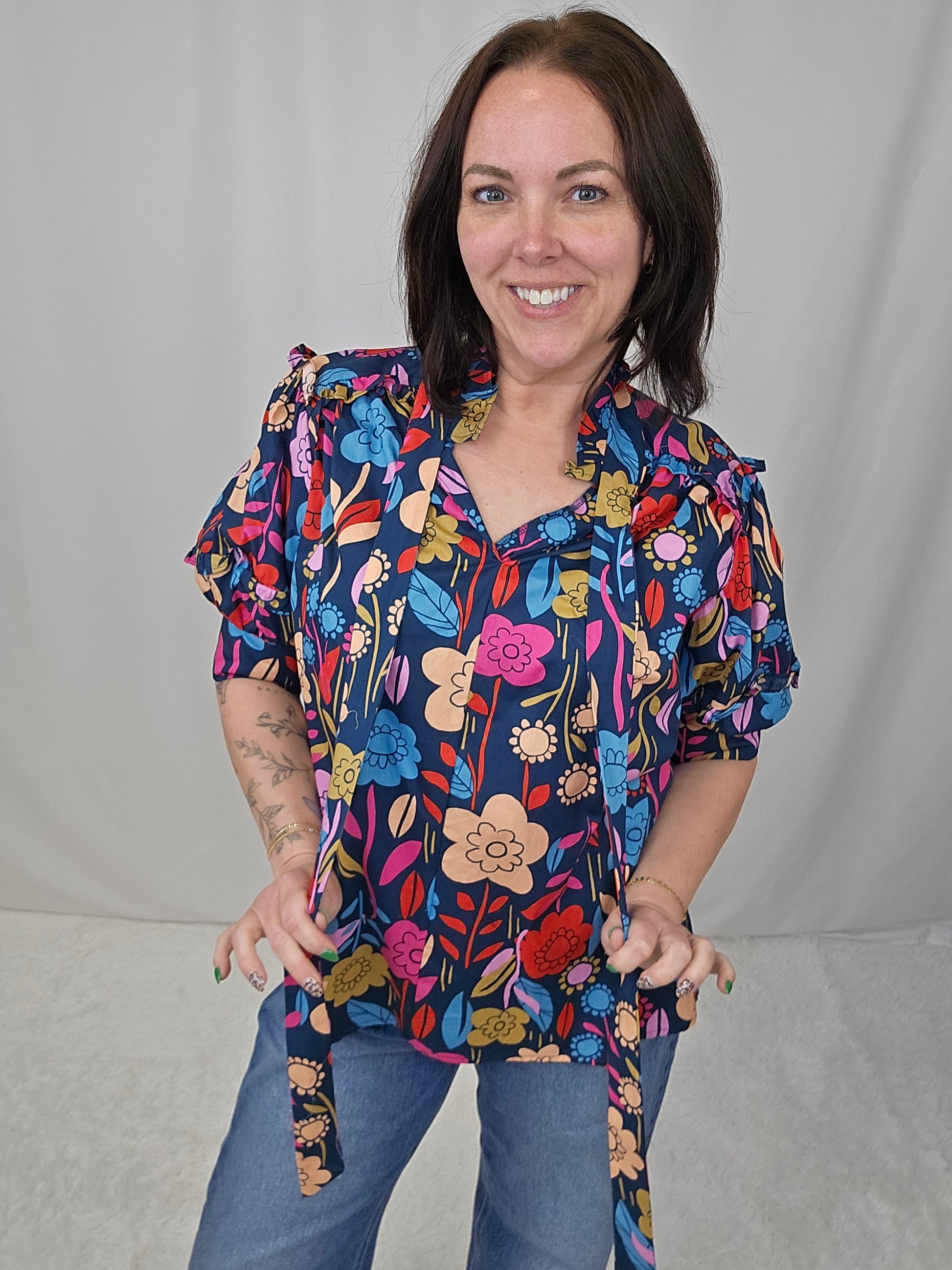 Embrace your playful side with our floral print puff sleeve blouse. The trendy v-neck style is tied for a flirty touch. Perfect for making a statement while staying comfortable. (Get ready to turn heads and feel fabulous!)