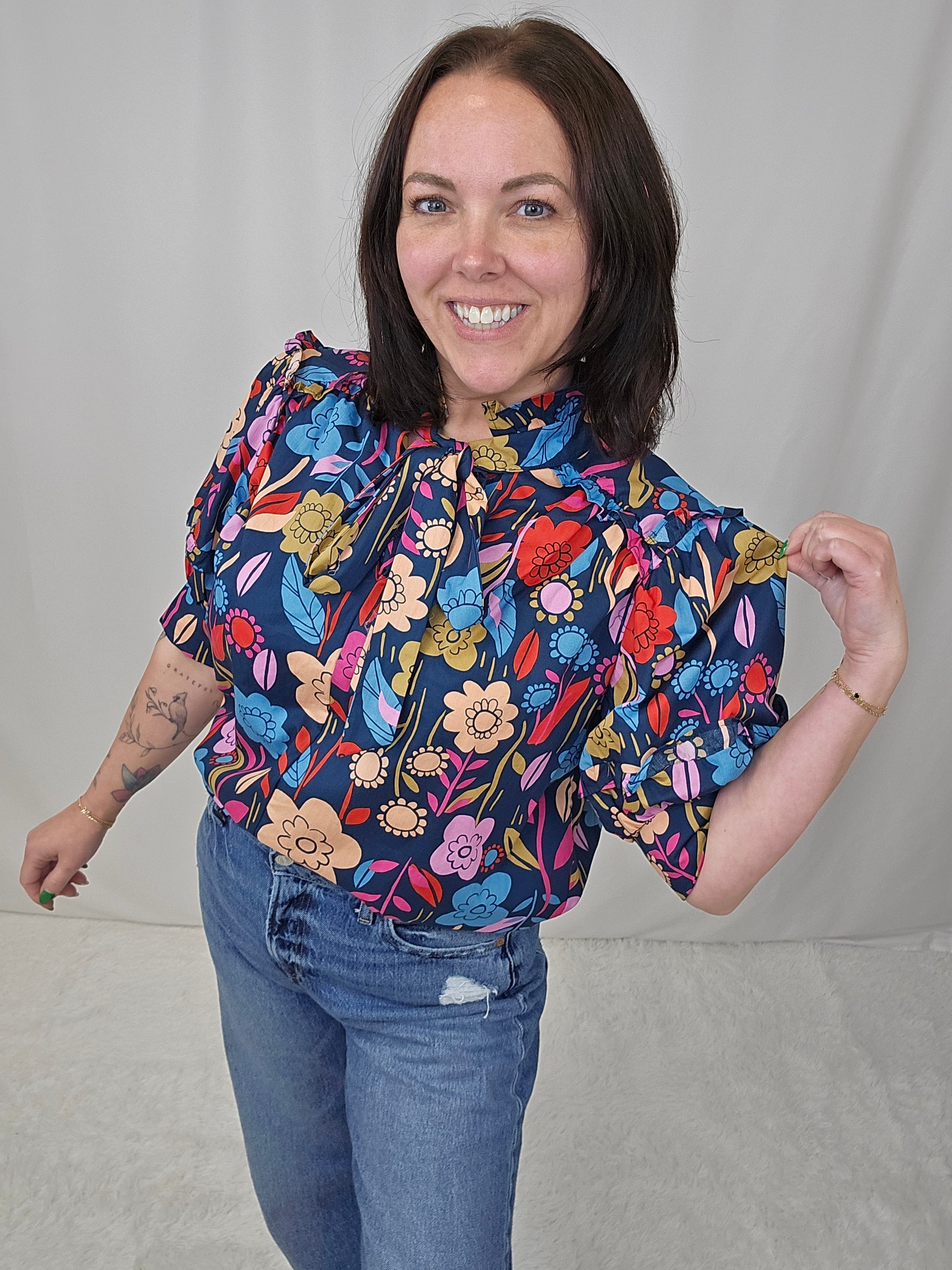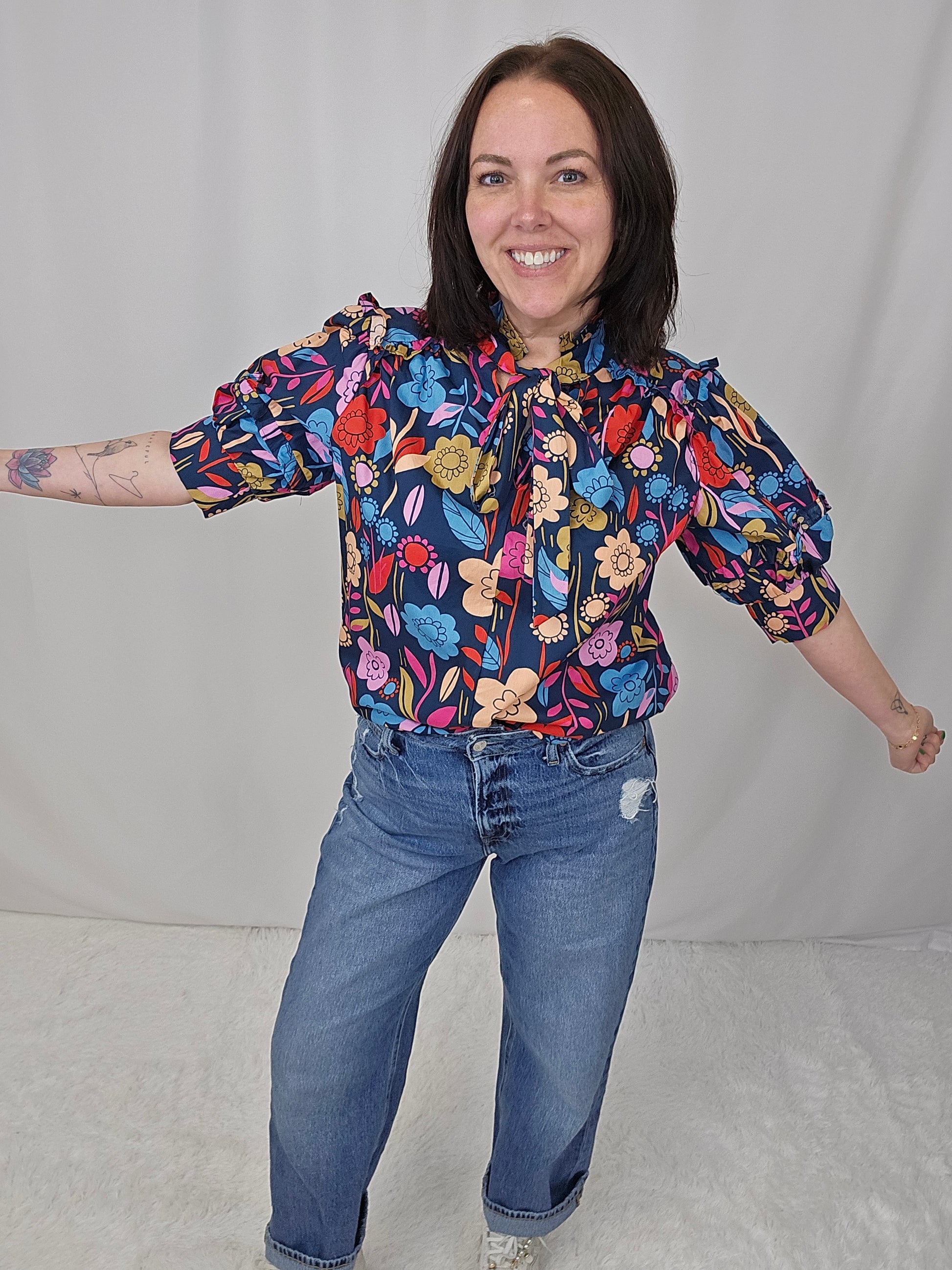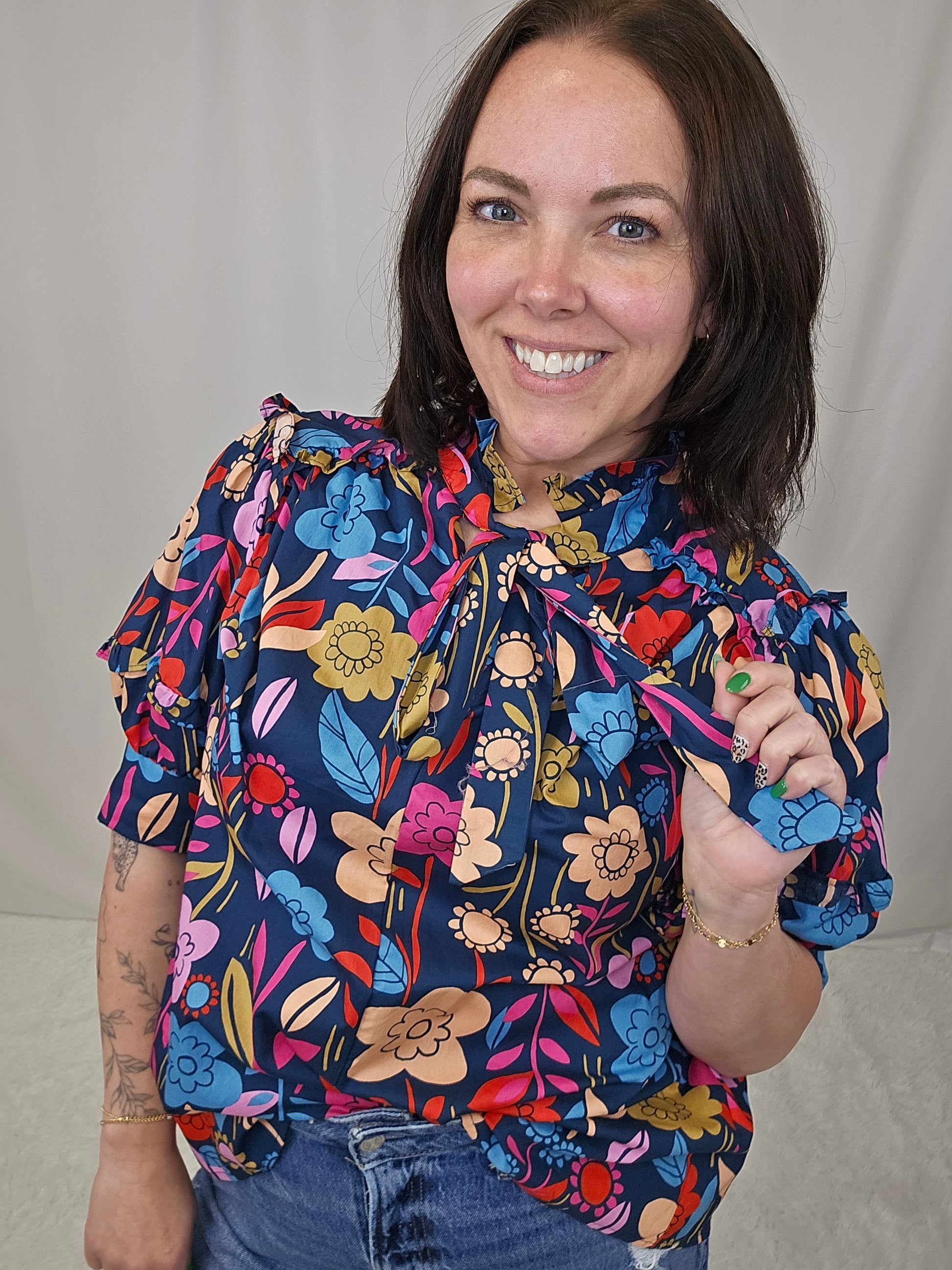 Embrace your playful side with our floral print puff sleeve blouse. The trendy v-neck style is tied for a flirty touch. Perfect for making a statement while staying comfortable. (Get ready to turn heads and feel fabulous!)