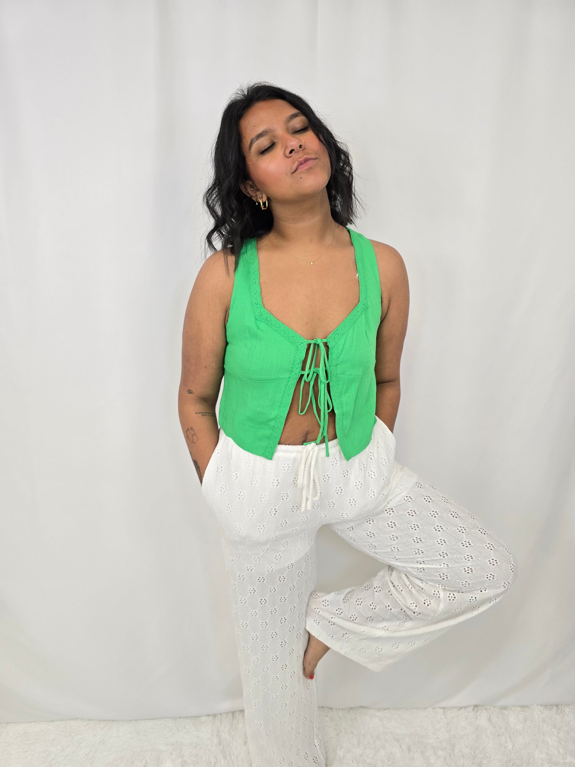 Get ready for a flirty date night with this sweet and soft linen top. With thick shoulder straps and a front tie detail, you'll love the sweetheart neckline.