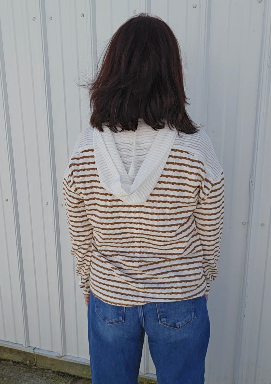 Elevate your casual wardrobe with this khaki stripe textured top, designed for effortless style and comfort. Featuring a hood and a flattering V-neck, it adds a relaxed yet polished touch to any outfit. The long sleeves make it perfect for layering or wearing on cooler days, while the subtle texture and stripes bring understated visual interest. Ideal for casual outings or cozy weekends, this top blends practicality with a trend-forward look you'll reach for again and again.