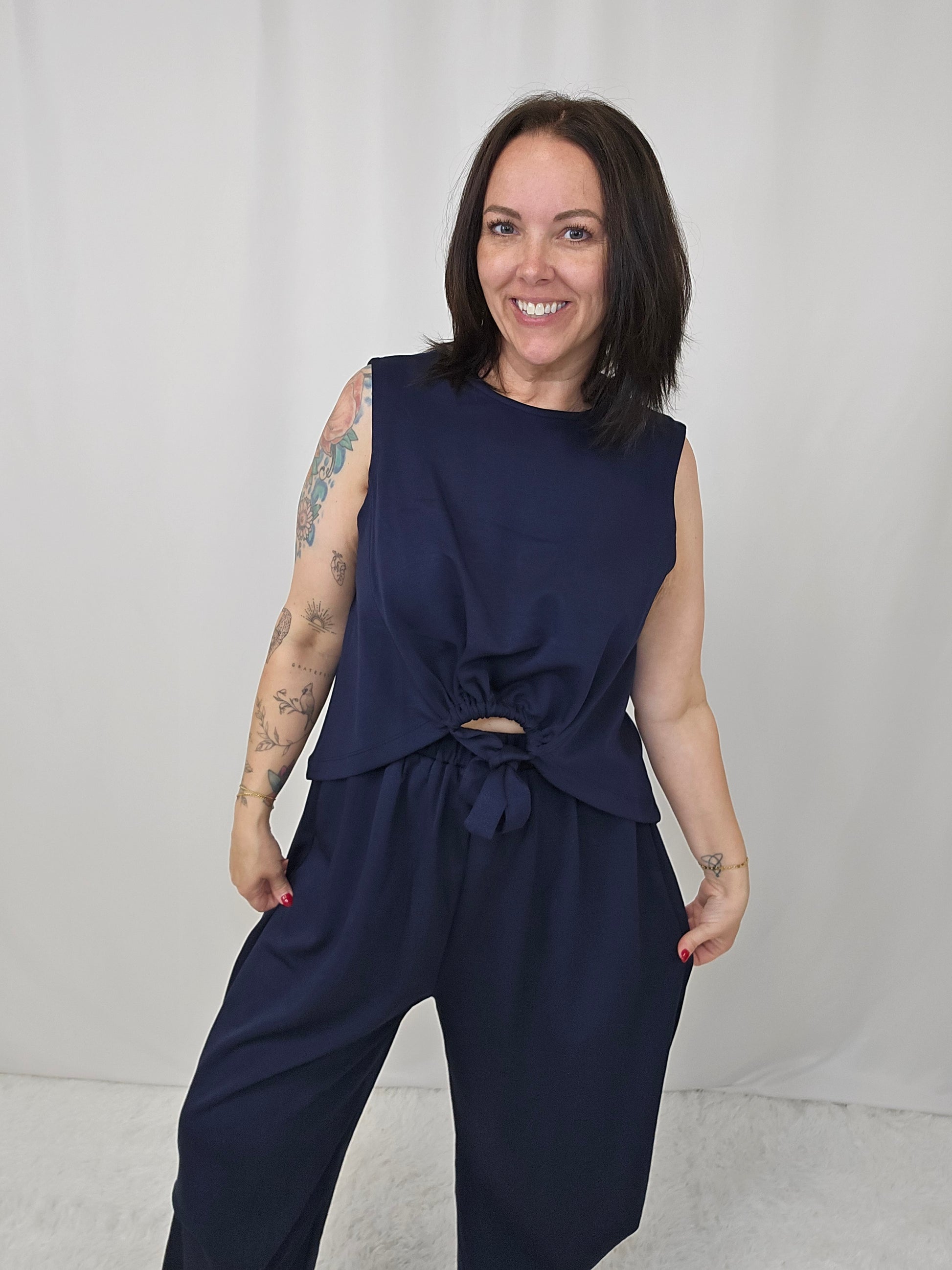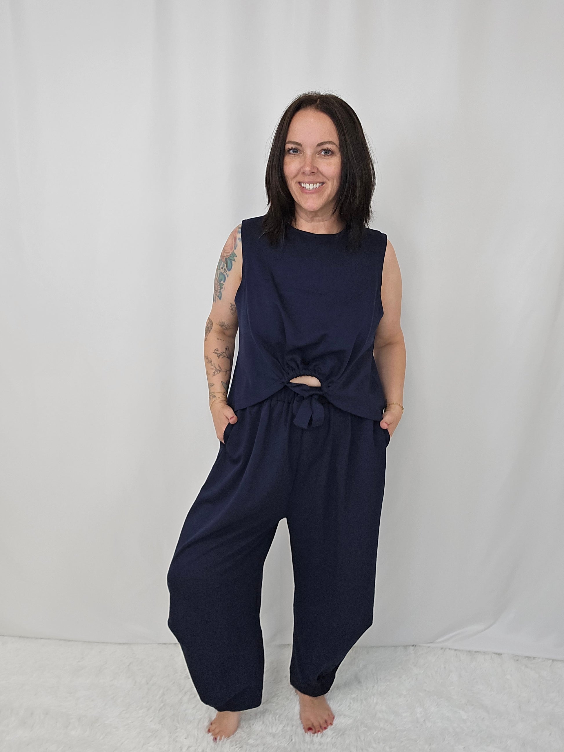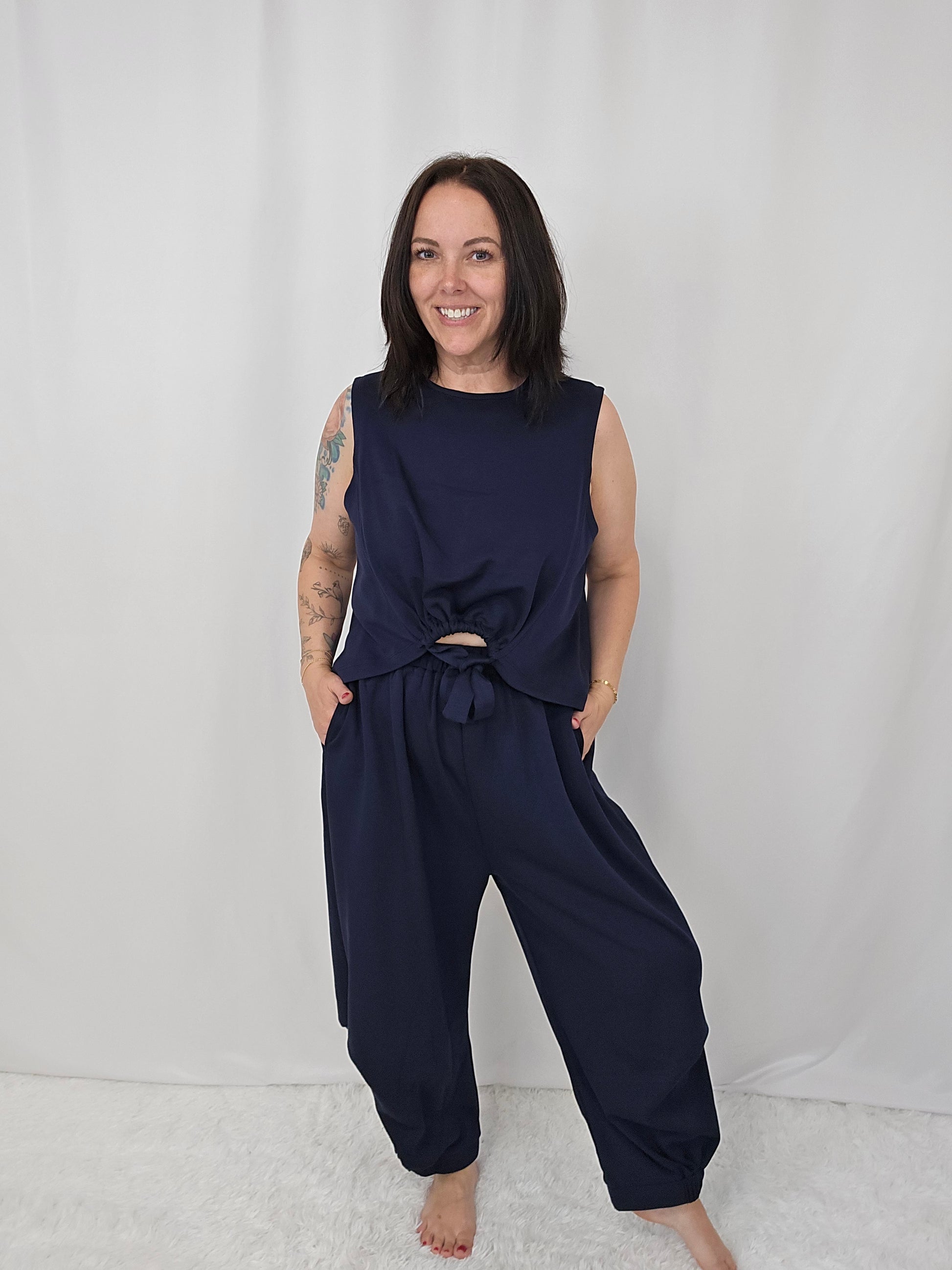 This playful Navy set features a solid crew neck top with capped sleeves and a round bottom hem, complete with a cinch tie detail for a fun, adjustable fit. Paired with semi-harem pants that have an elastic waistband and banded hem, it offers comfort and style perfect for relaxed days or casual outings.