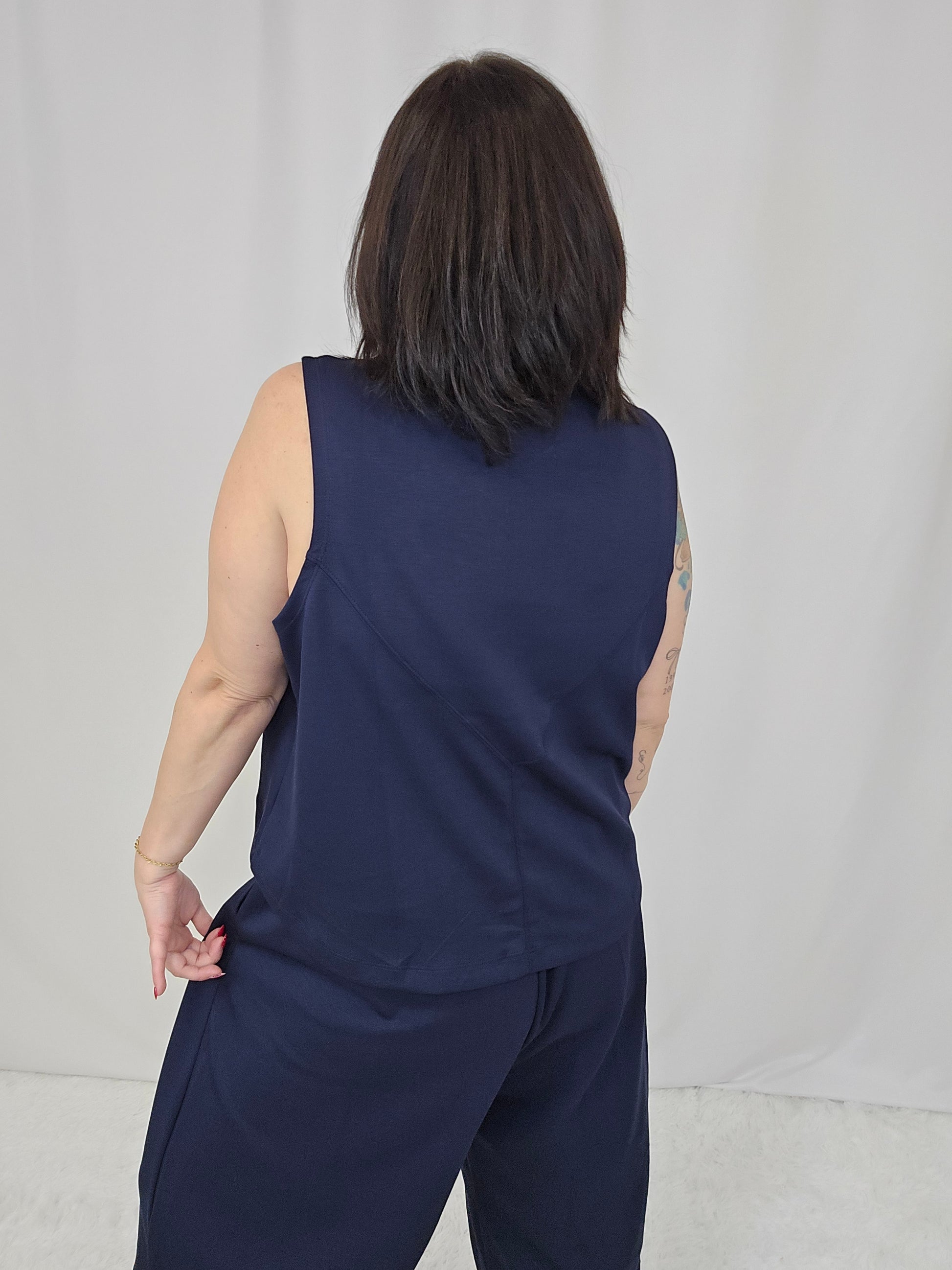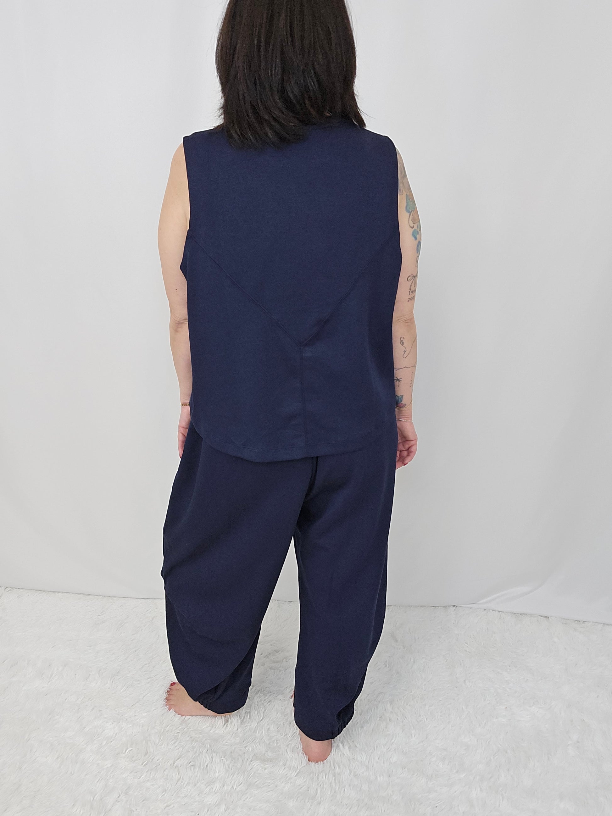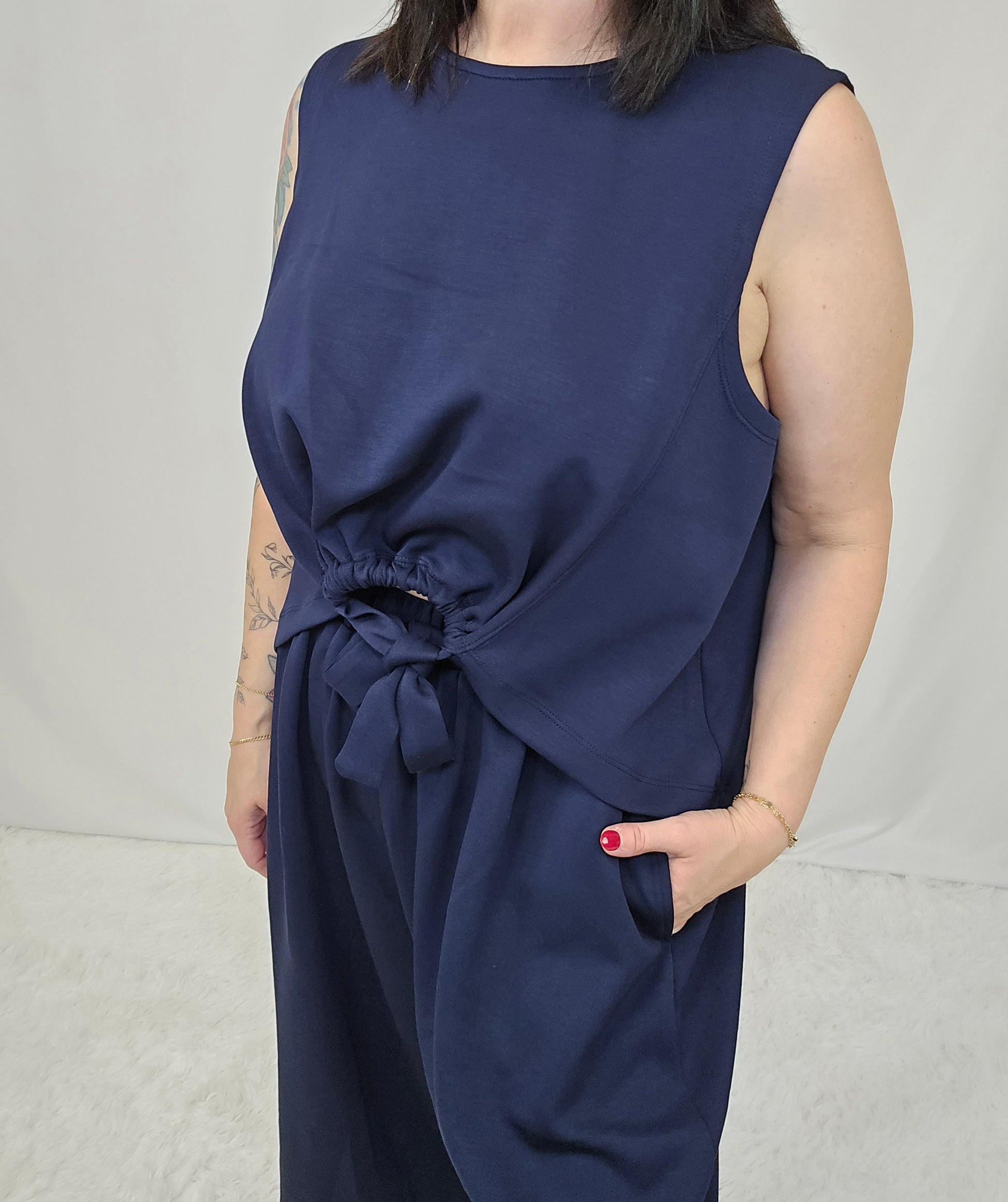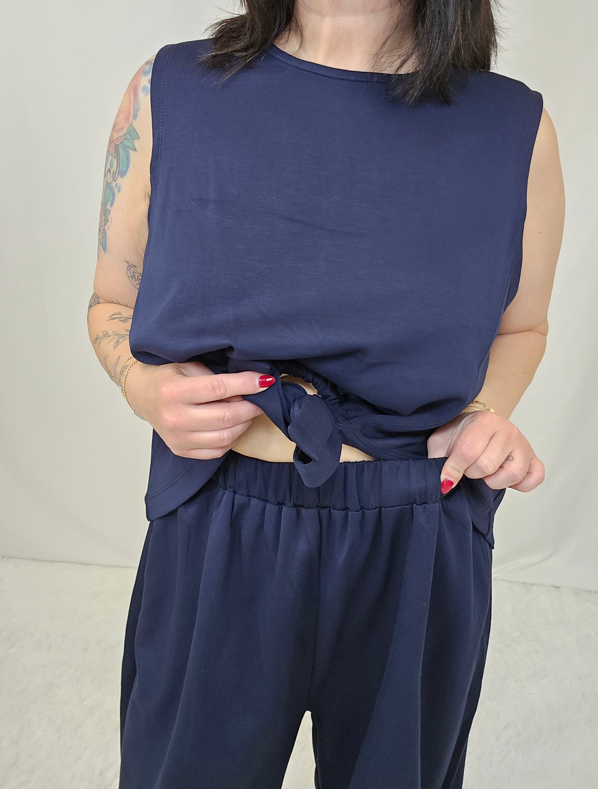 This playful Navy set features a solid crew neck top with capped sleeves and a round bottom hem, complete with a cinch tie detail for a fun, adjustable fit. Paired with semi-harem pants that have an elastic waistband and banded hem, it offers comfort and style perfect for relaxed days or casual outings.