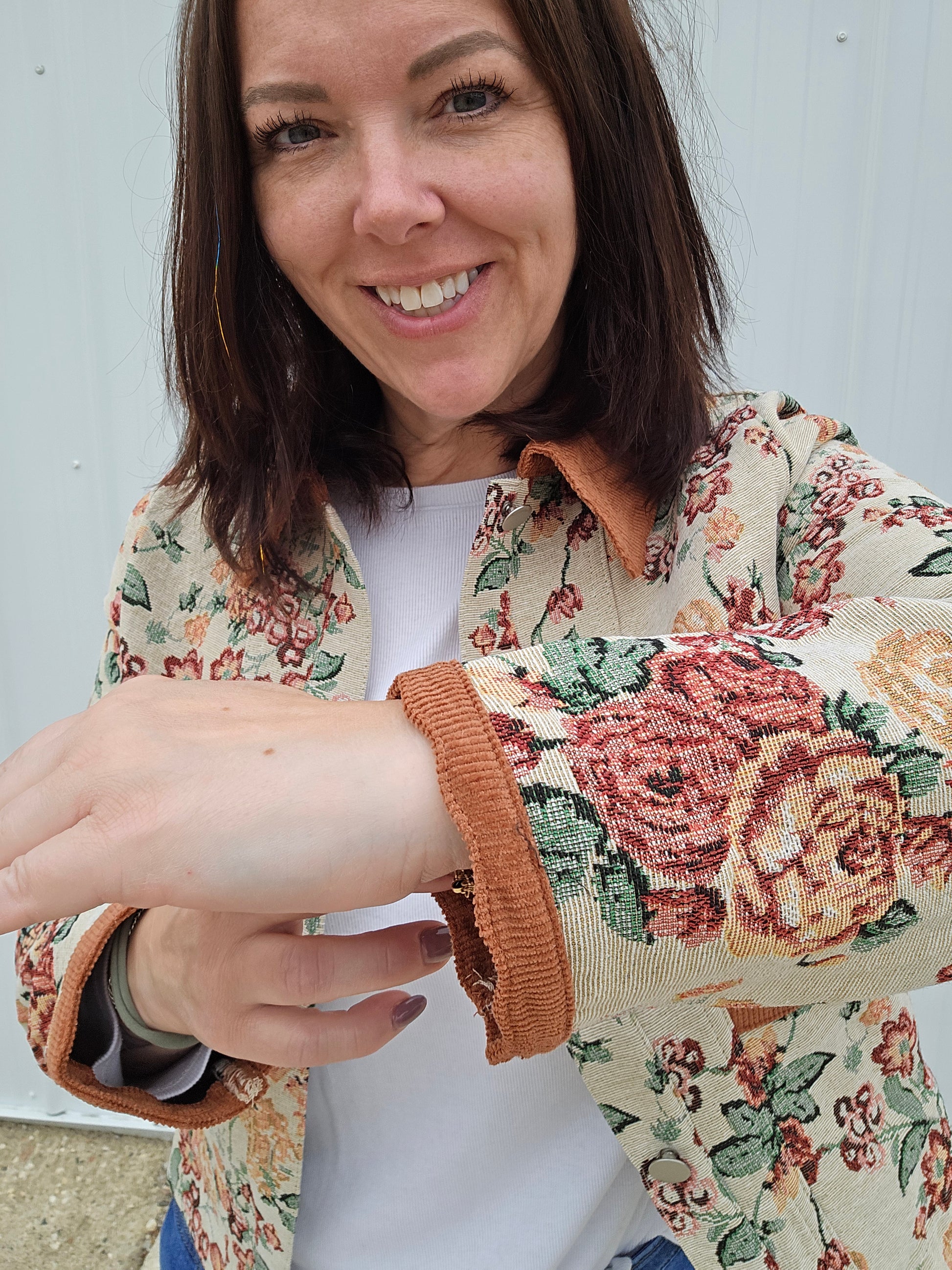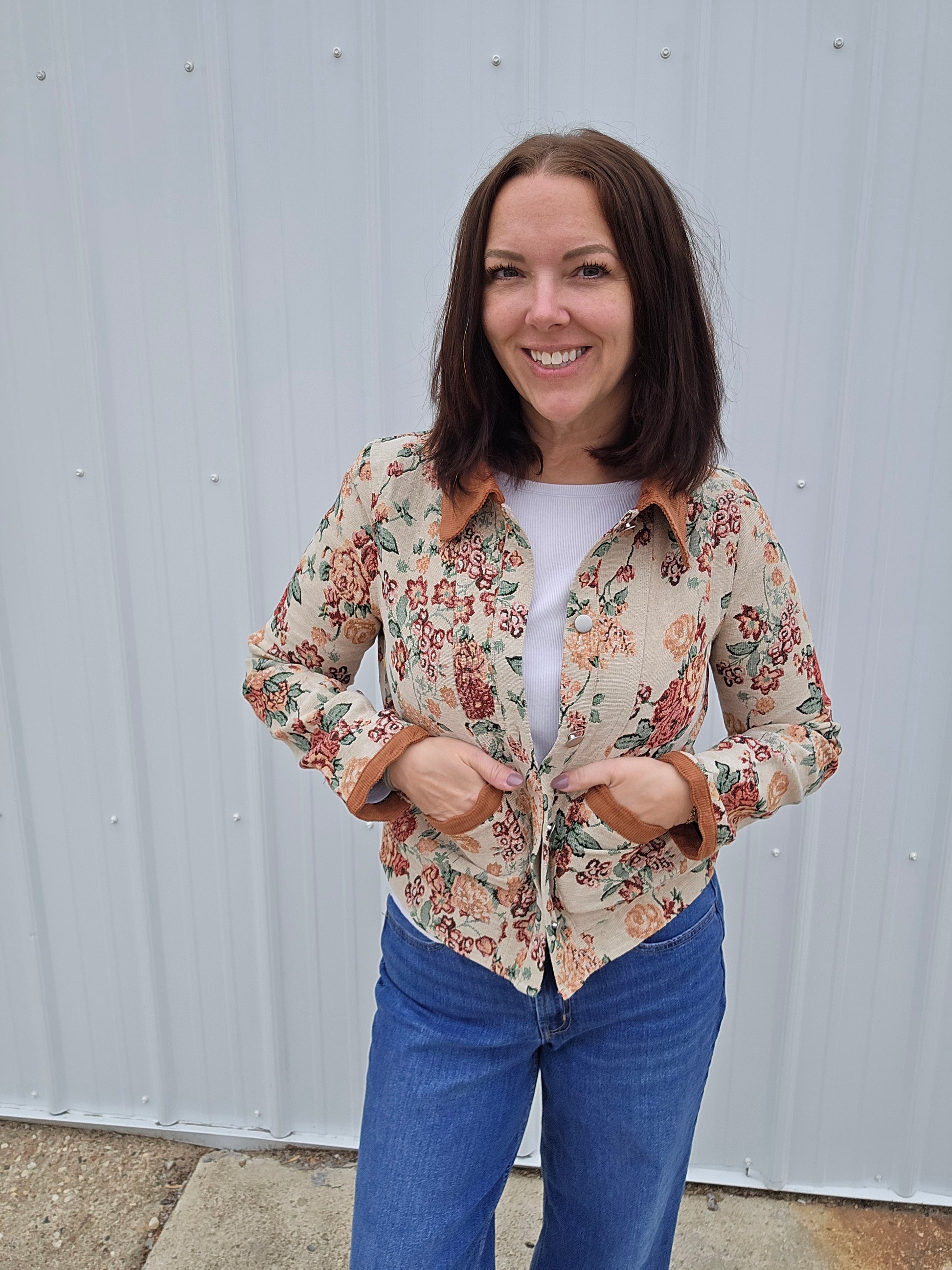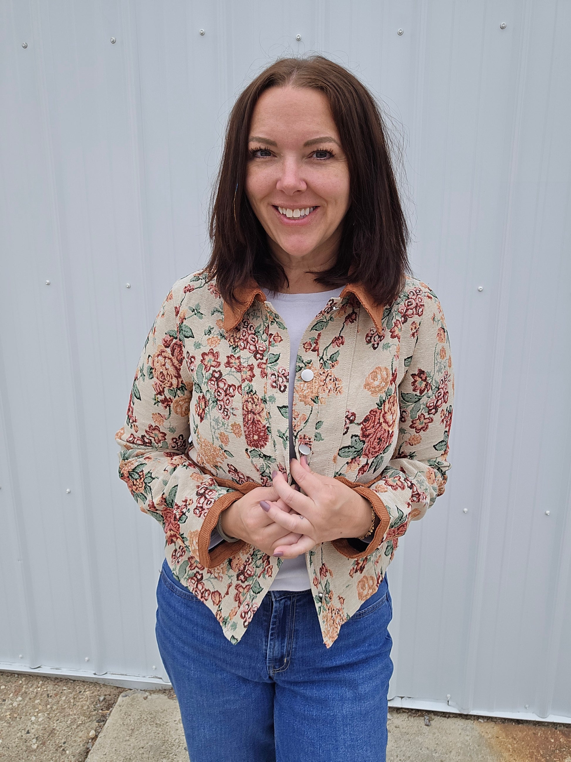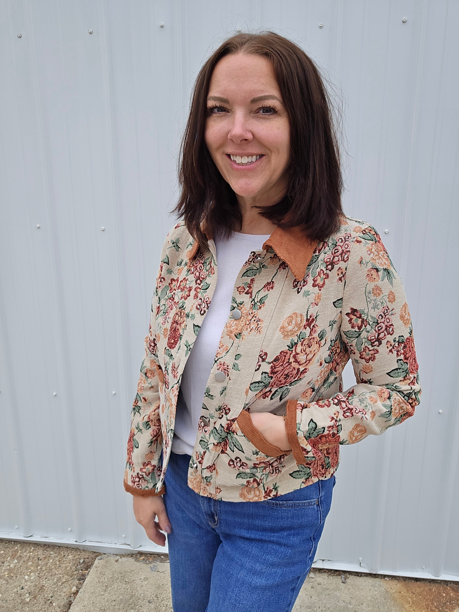 This charming jacket features a playful floral jacquard pattern and a button-front design that adds a touch of whimsy to your outfit. The corduroy scallop edge detail brings a fun, textured twist, making it perfect for those who love a little flair in their wardrobe. Cozy, stylish, and full of personality!
