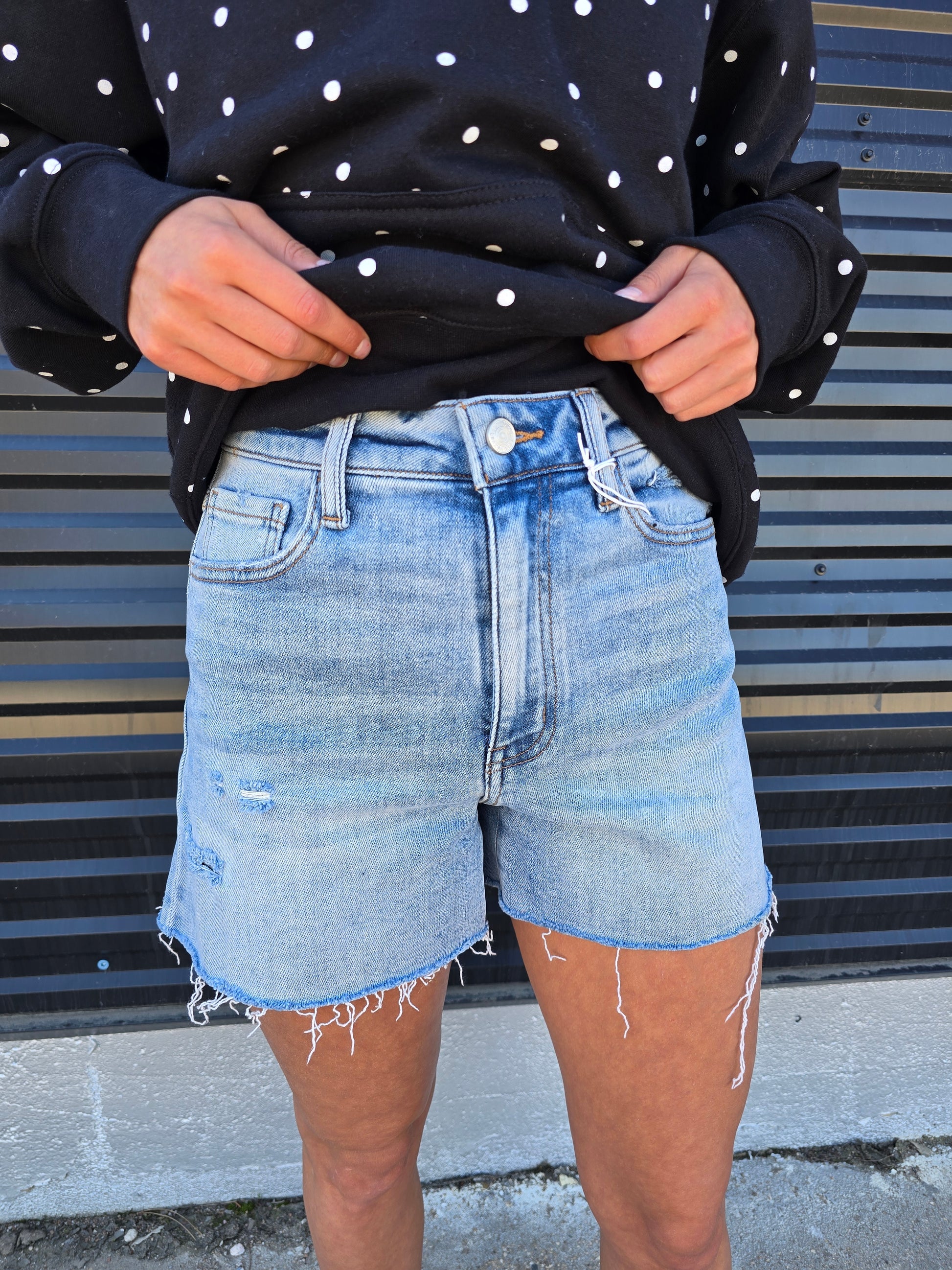 Super high rise distressed A-line shorts crafted from comfort stretch denim. Features an 11" front rise with a 3 3/4" inseam for a flattering silhouette. Five-pocket construction with distressed detailing and a raw hem finish. Light wash denim offers versatile styling for casual everyday wear. The stretch fabric ensures all-day comfort and ease of movement.
