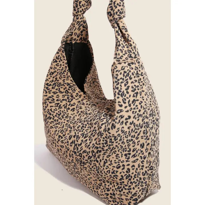 Show off your playful side with this shoulder bag featuring a bold leopard print and a unique knotted strap. Its hobo design adds texture and flair to any outfit, making it a standout accessory. Crafted from 100% polyester, it measures 16" long, 4" deep, and 10" high—just right for carrying your essentials in style. Available in BR and IV, this bag is sold individually to keep your look fresh and fun.