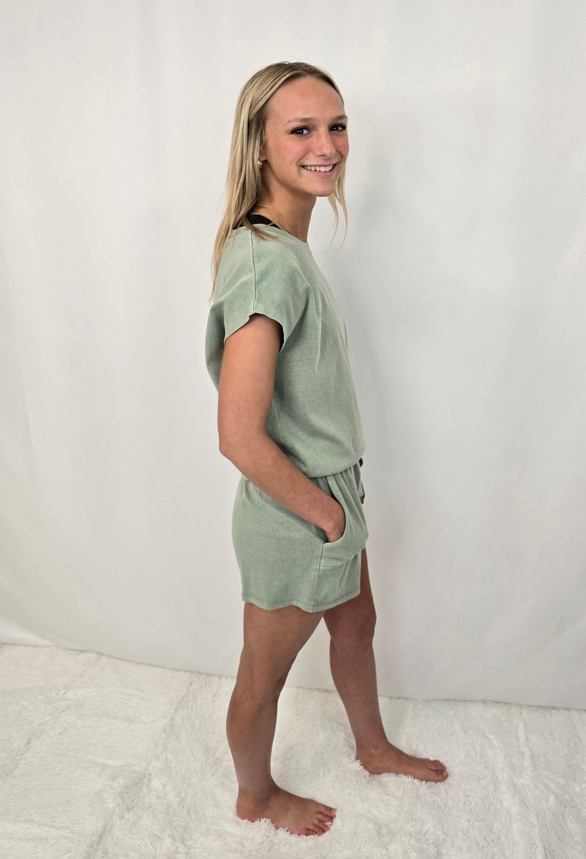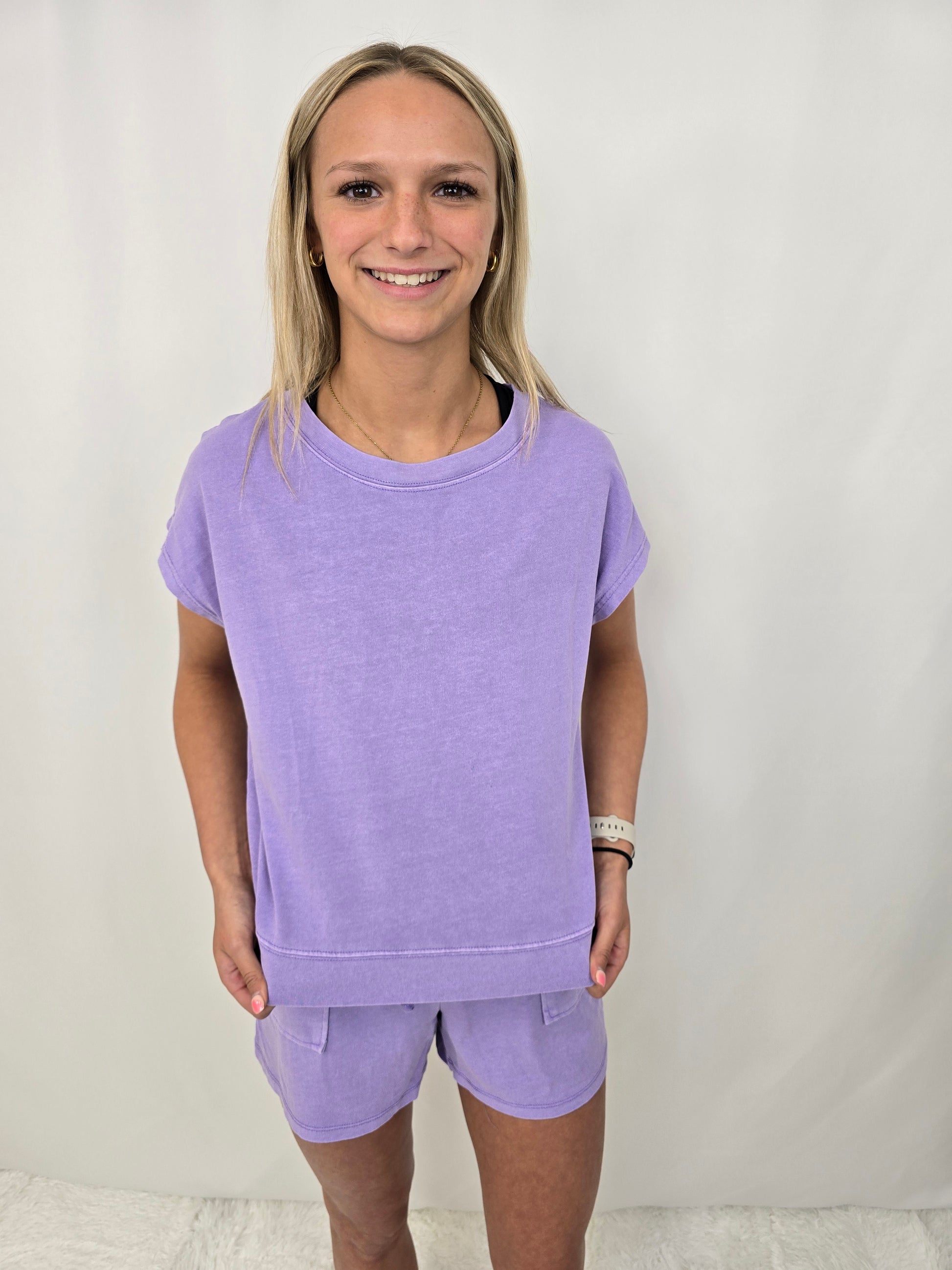 Get comfy and cute with this matching set! The relaxed-fit top features a round neckline and short dolman sleeves, while the matching shorts have an elasticized waist and two front pockets. Perfect for lounging or wearing separately, this set will have you feeling and looking great.