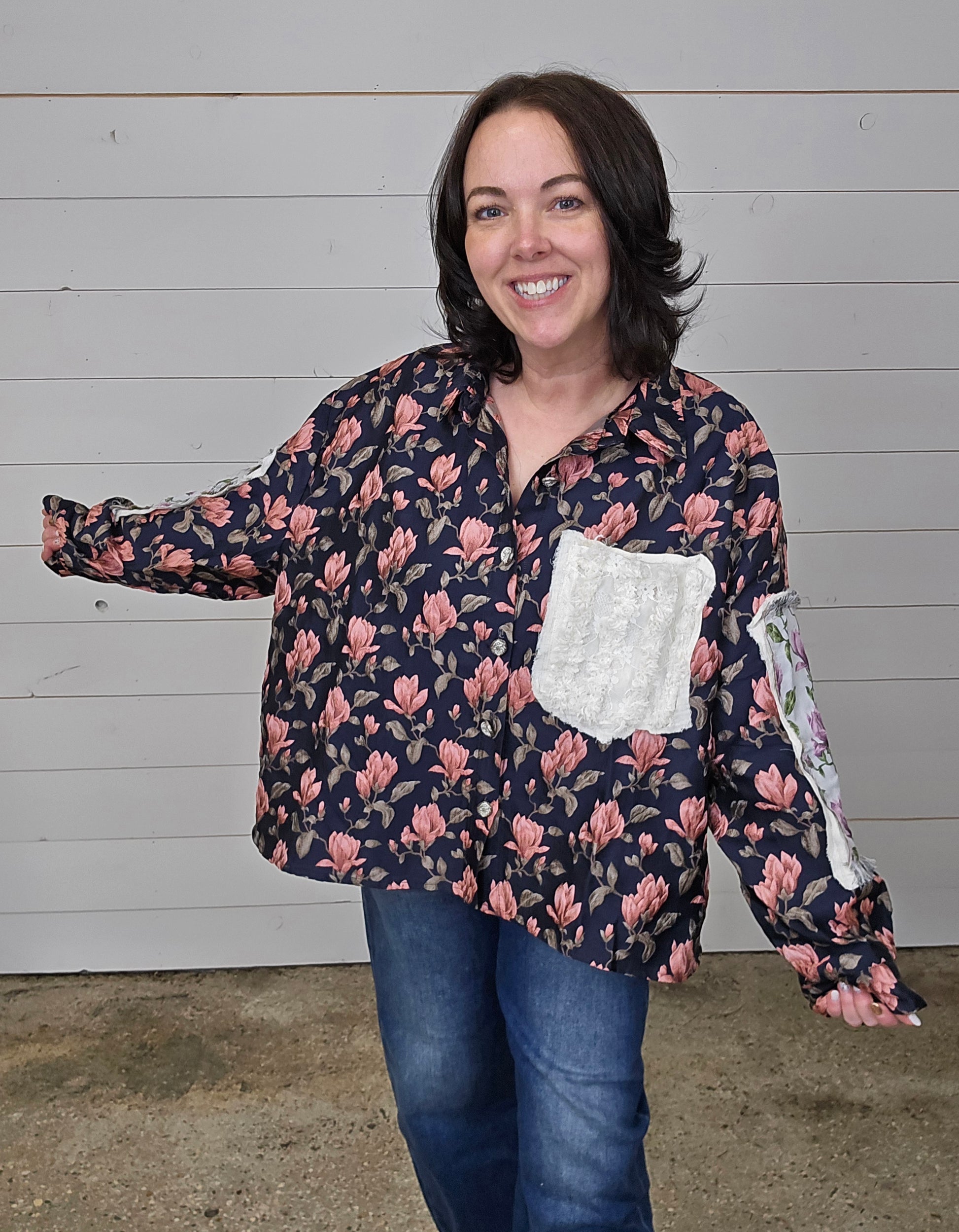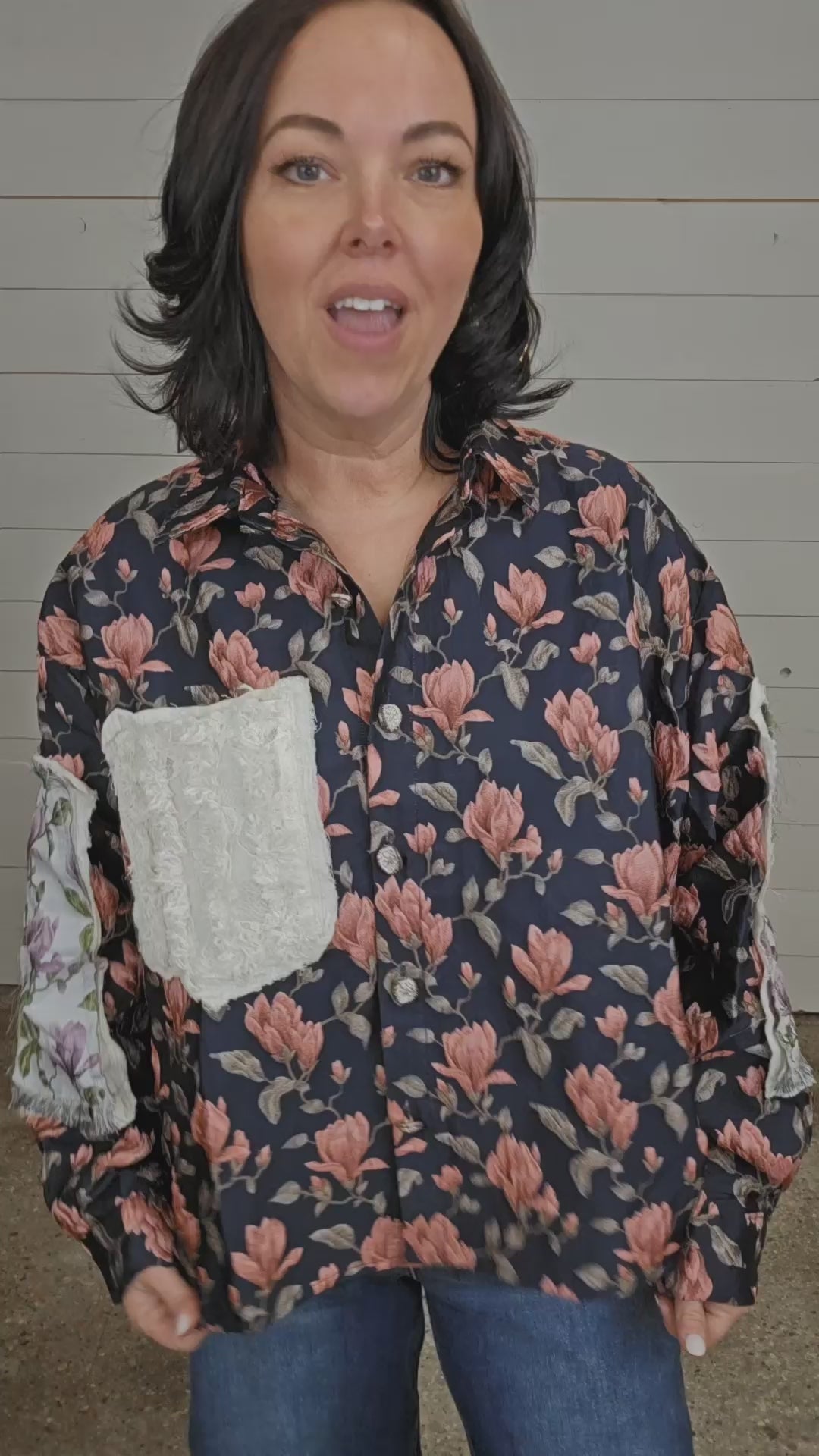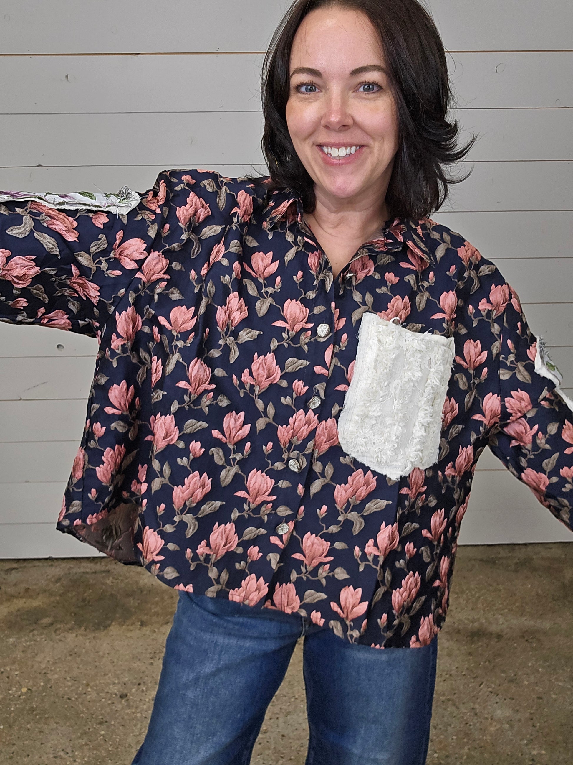 Stunning floral panels in a jacquard pattern elevate this navy shacket to a whole new level of style. Perfect for adding a touch of sophistication to any outfit. Enjoy the versatility of a shirt and jacket in one, with the added softness and comfort of floral fabric.