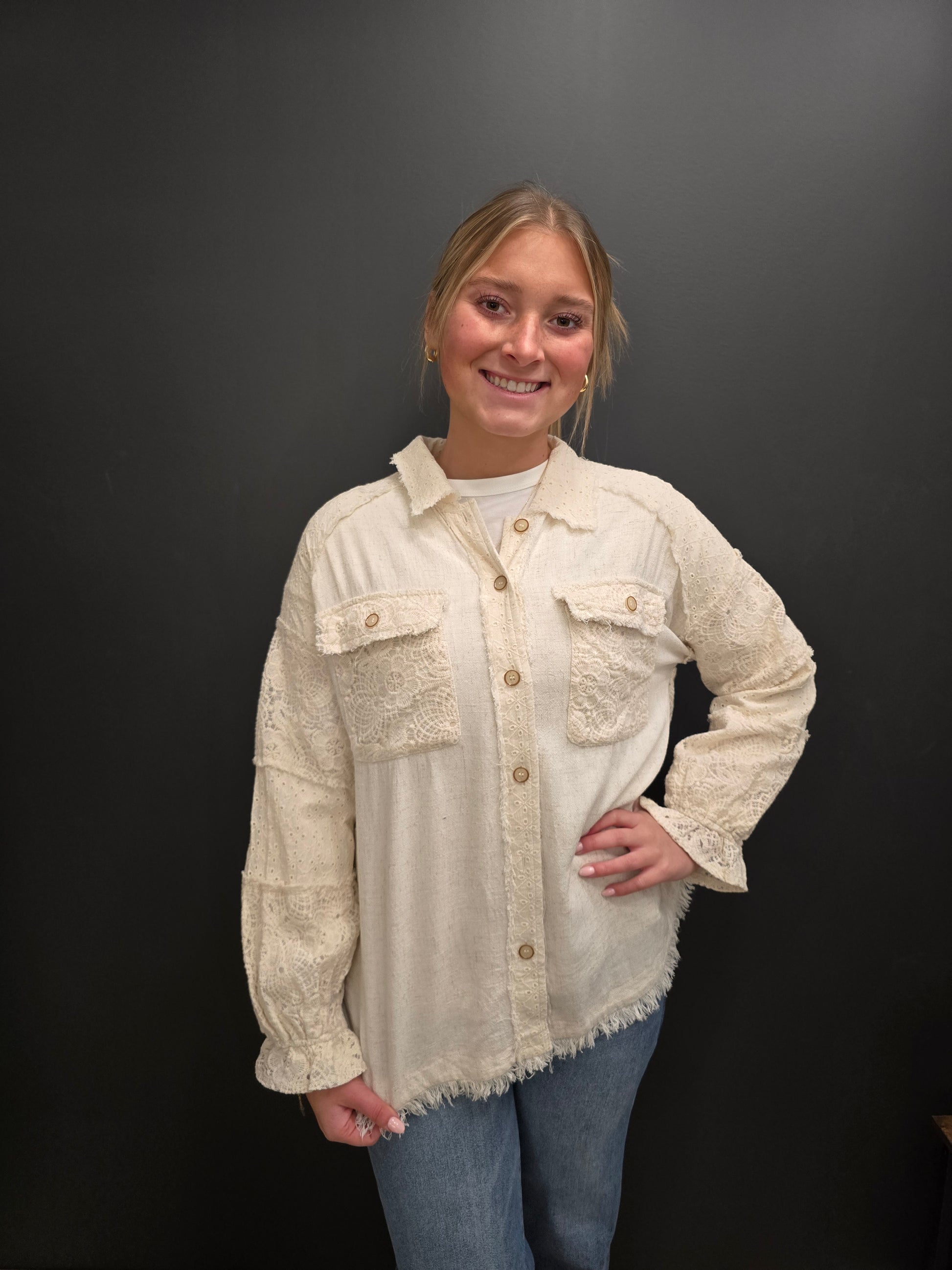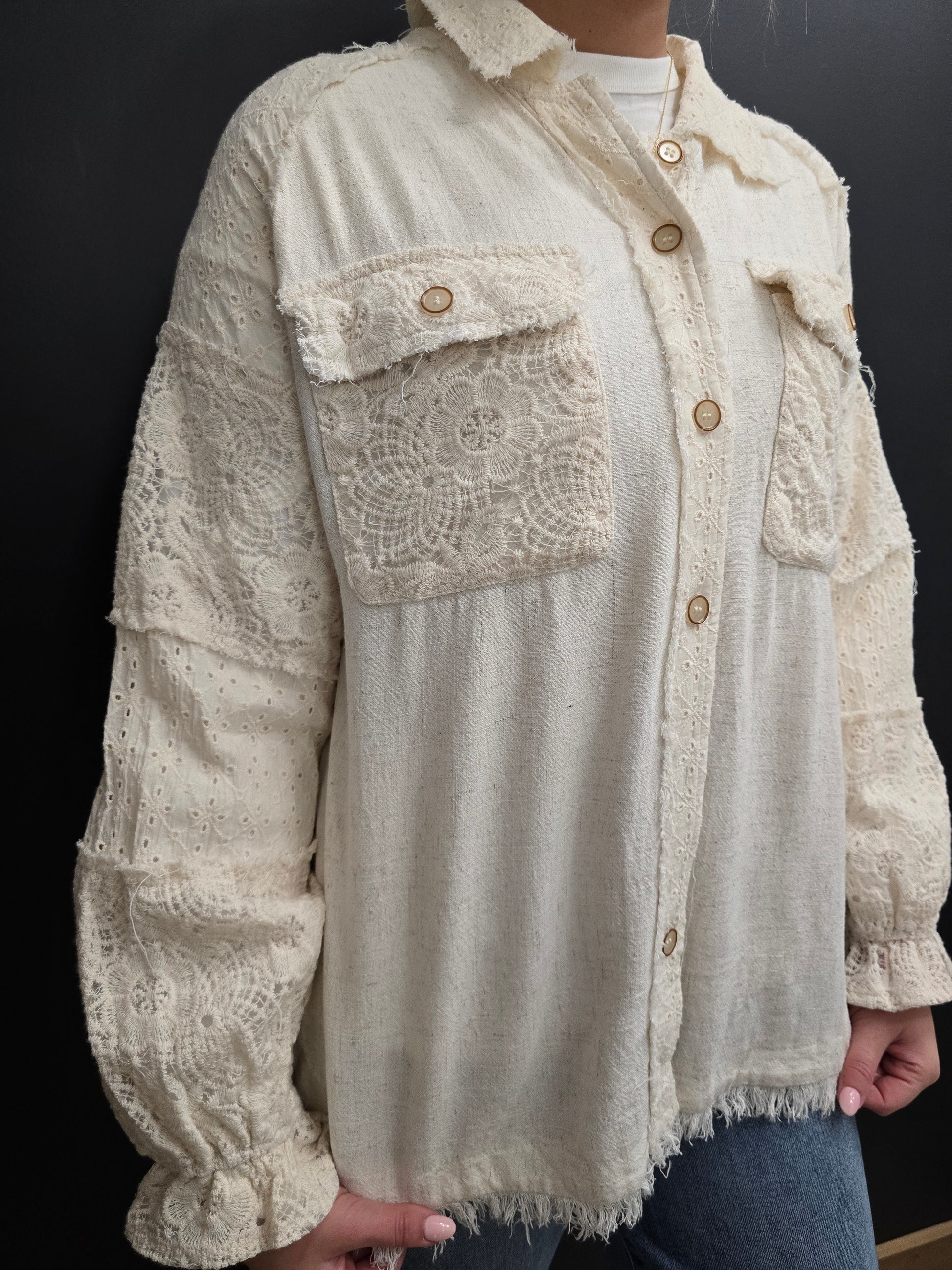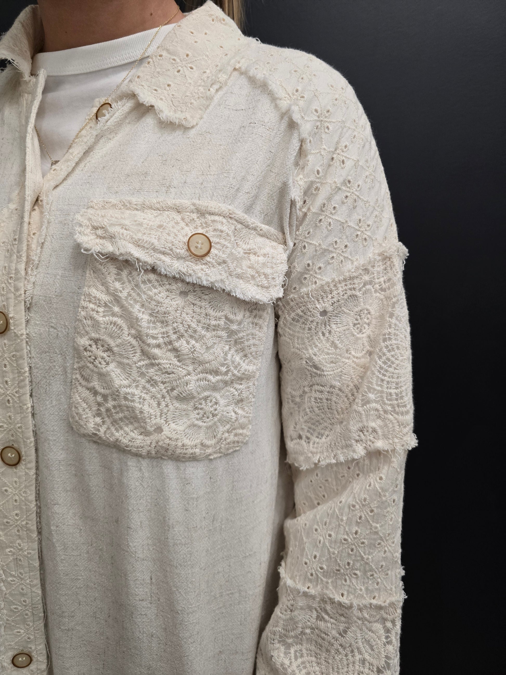 Elevate your wardrobe with this stunning linen button-down jacket in Oatmeal that seamlessly blends texture and style. Featuring eye-catching lace mixed media detailing, cuffed sleeves, and a trendy frayed hem, this piece delivers effortless sophistication. Practical chest pockets keep essentials within reach while adding functional appeal. Perfect for layering over dresses or pairing with your favorite jeans, this versatile jacket transitions beautifully from casual outings to weekend gatherings. The breathable linen fabric ensures comfort all season long, making it an essential addition to any fashion-forward closet.