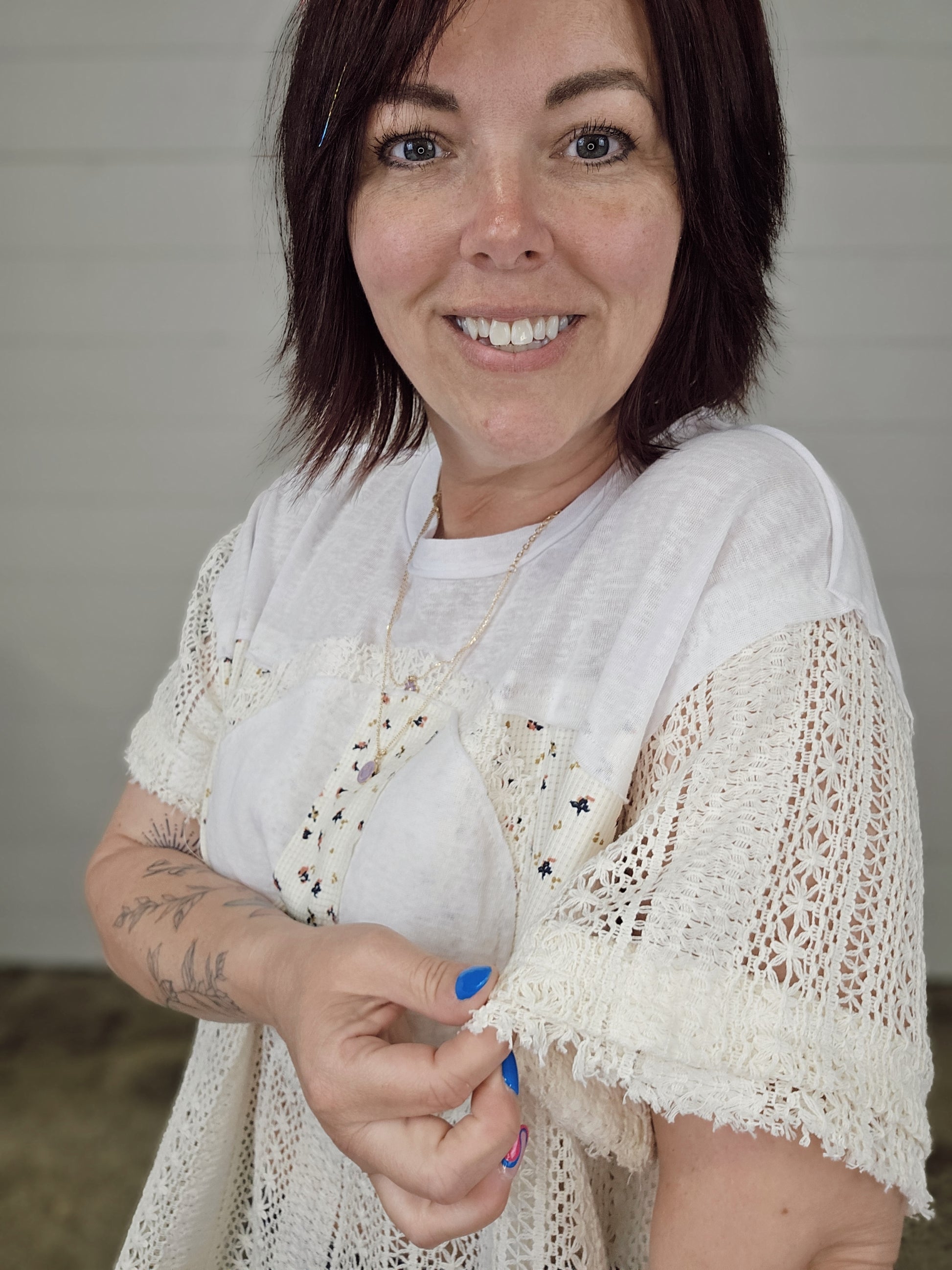 Add a touch of bohemian chic to your wardrobe with our round neckline oversized knit top. Made with a unique blend of cotton slub, crochet, and printed thermal for a comfortable and stylish fit. The peace mark patch on the front and frayed edges give this top a unique and edgy look. Runs generous.