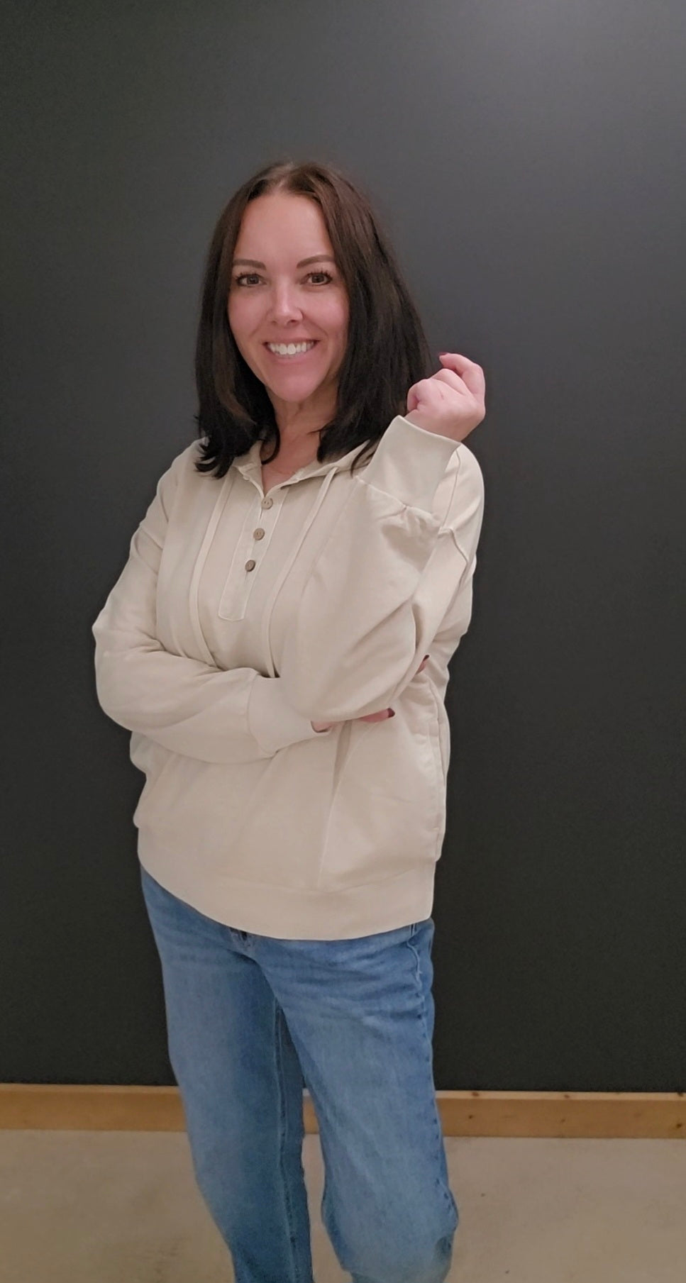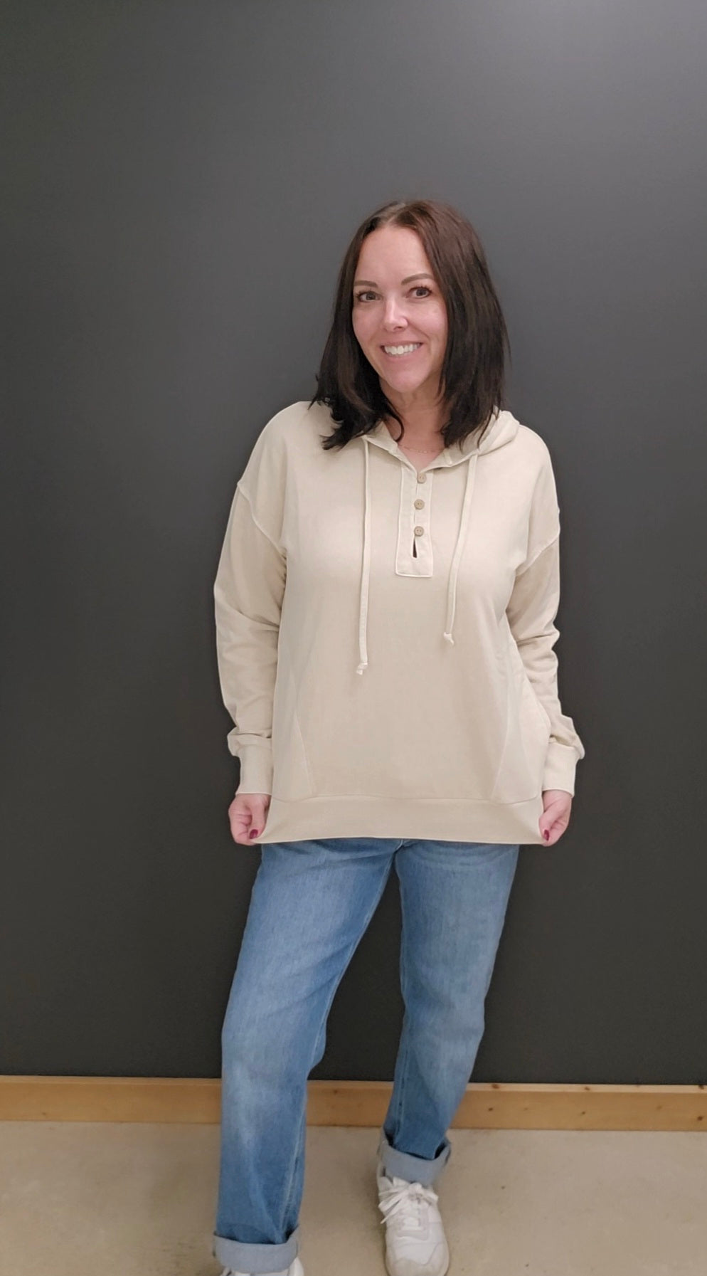 Elevate your casual wardrobe with this washed hooded henley knit sweater—a versatile essential that effortlessly transitions from relaxed weekends to laid-back outings. Featuring a half button-down design, drawstring hood, and drop shoulder silhouette, it delivers contemporary style with comfort-first construction. The ribbed detailing adds refined texture, while the acid-washed finish creates unique character in every piece. Crafted from a breathable cotton-polyester blend with spandex contrast for gentle stretch, this relaxed-fit sweatshirt moves with you throughout your day. Perfect for layering or wearing solo, it's the go-to piece you'll reach for again and again.