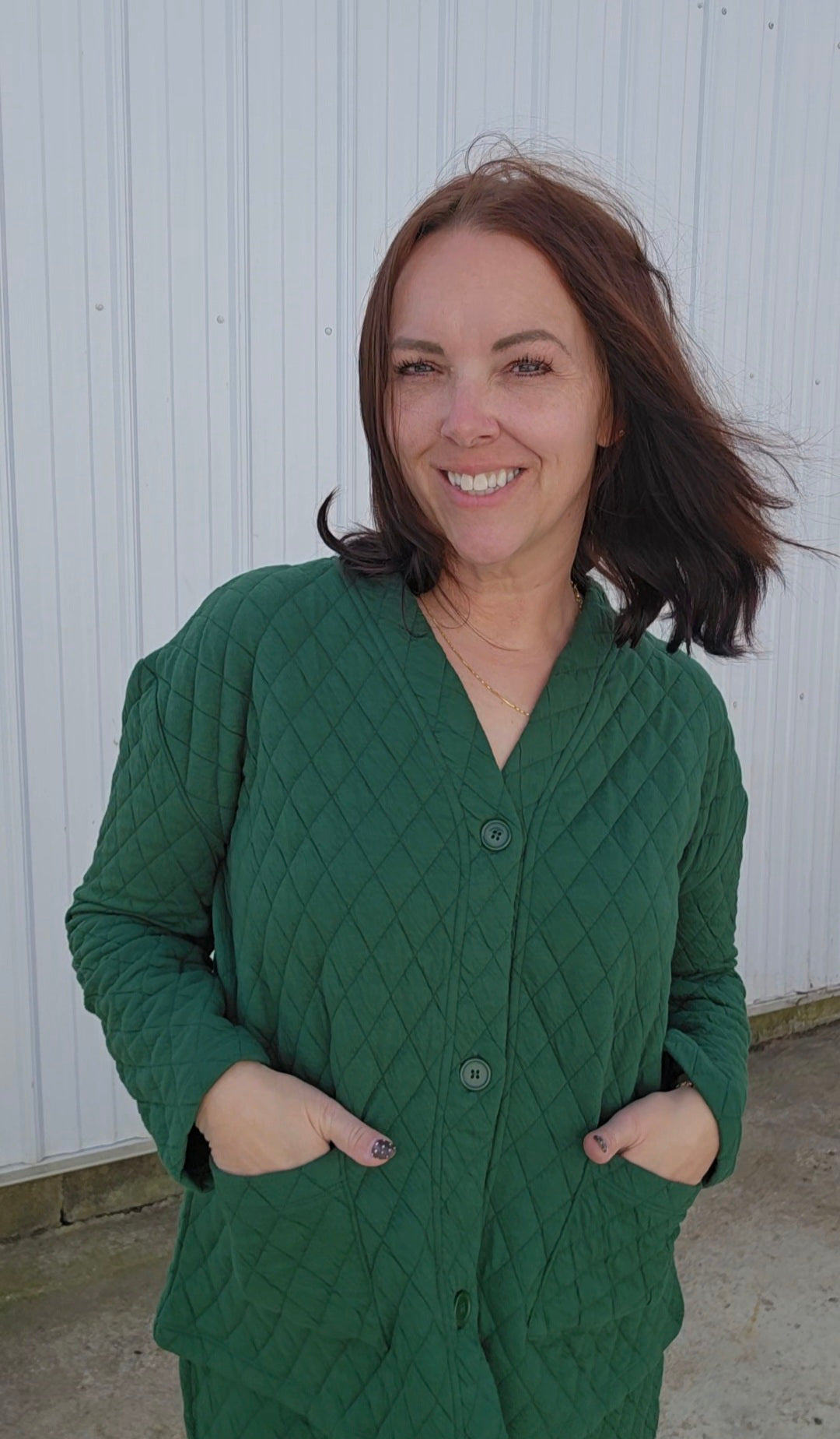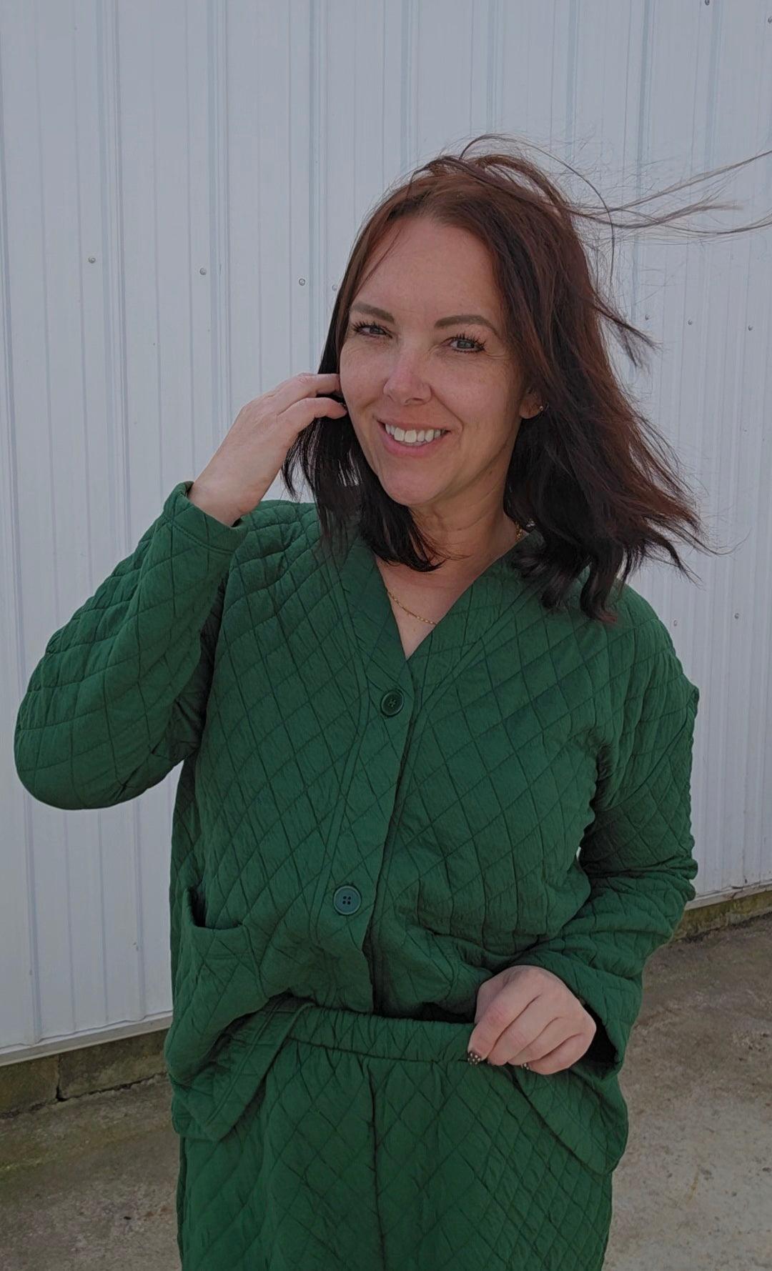 Stay effortlessly stylish and cozy with this Quilted Jacket and Pants Set in a gorgeous Dark Green. Designed for warmth and comfort, the lightweight quilted fabric provides insulation without bulk, making it perfect for daily wear or outdoor adventures. The matching set delivers a polished, put-together look while allowing freedom of movement, ideal for those who want to blend fashion with function. Elevate your wardrobe with this versatile ensemble that keeps you comfortable no matter the season.