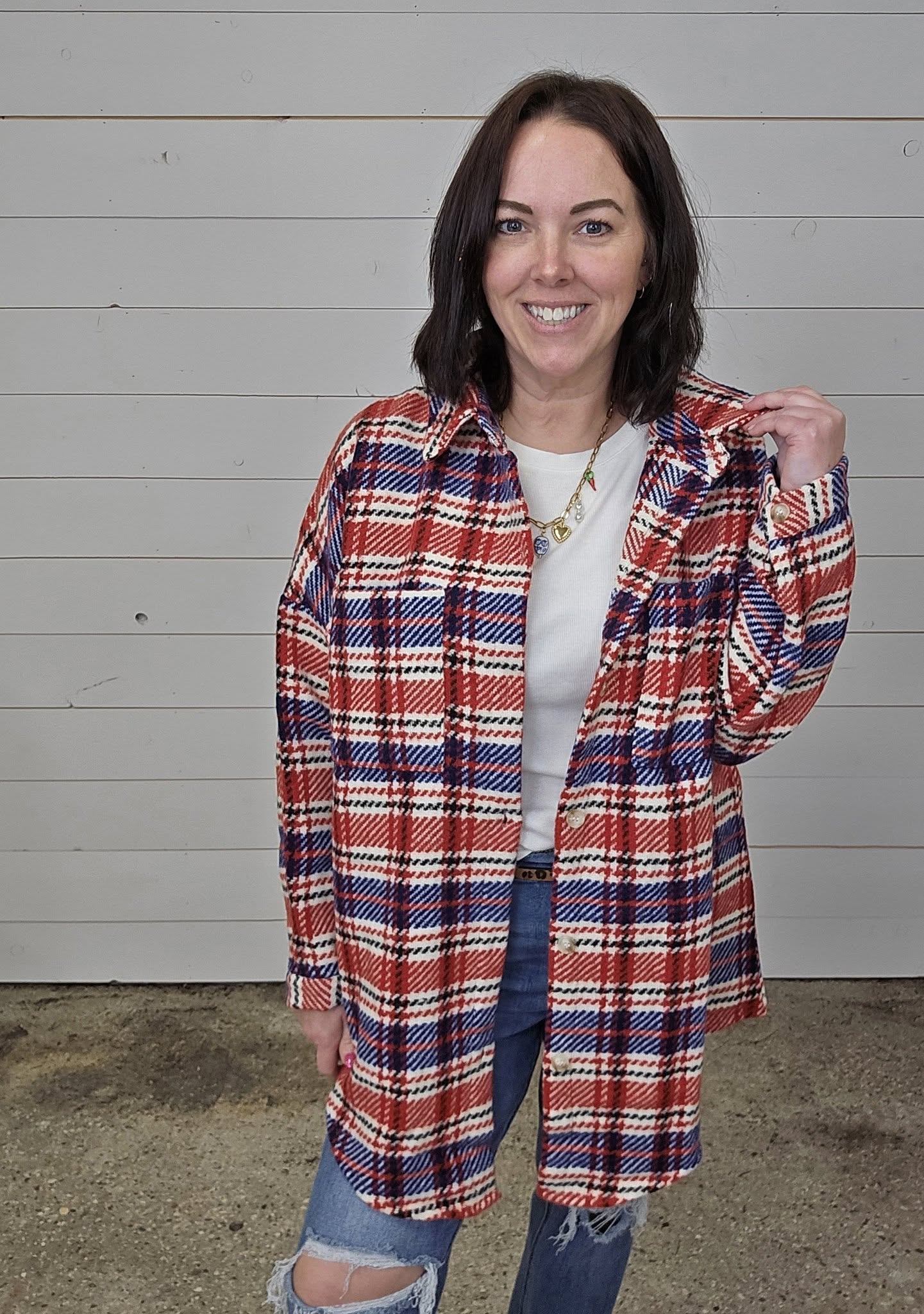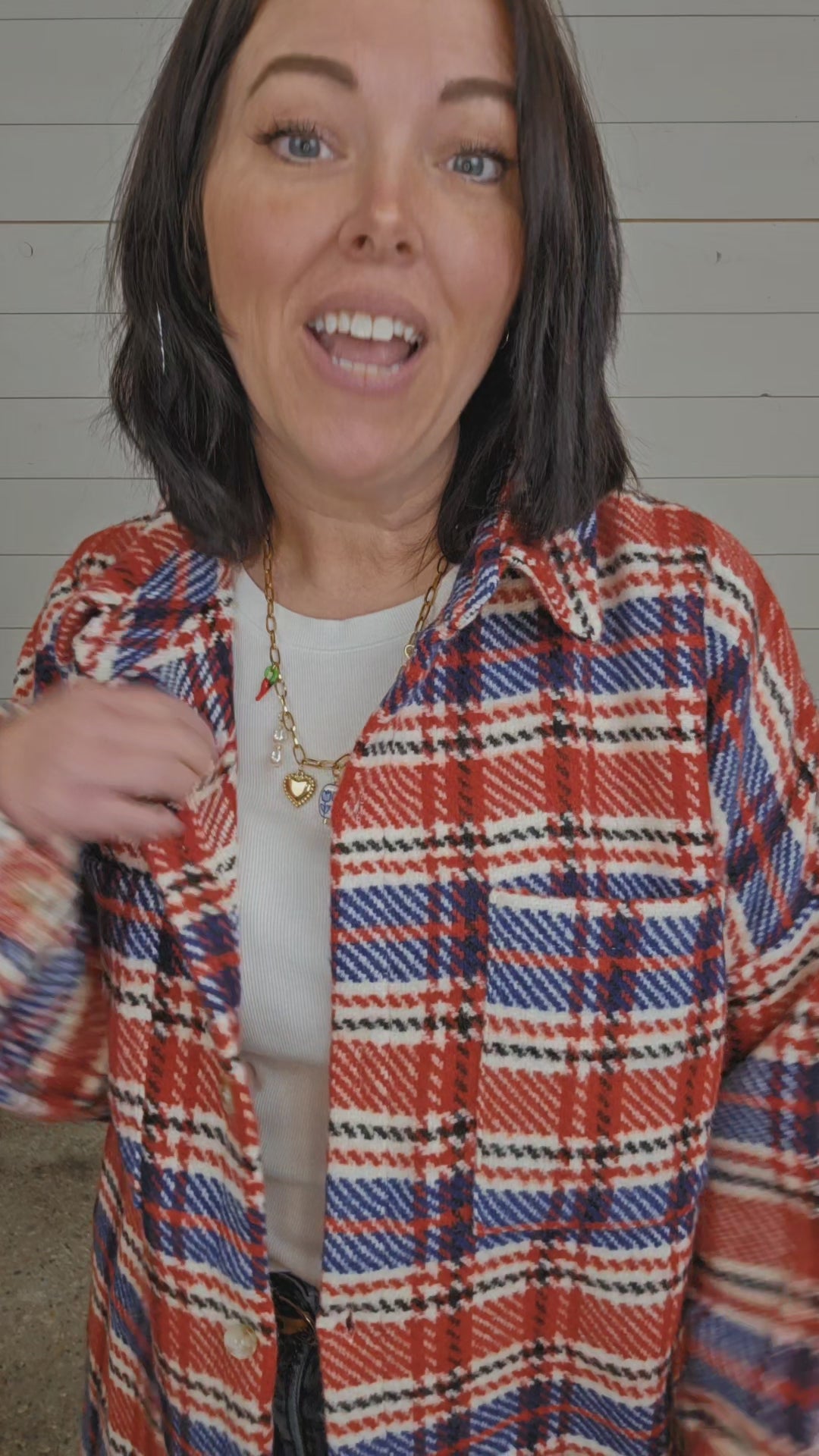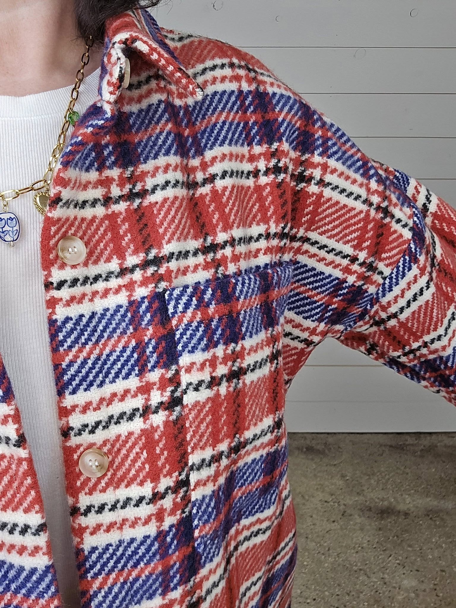 Snag this plaid button down for a laid-back look. Designed with a chest pocket, long sleeves, and a loose fit, this jacket shirt, or "shacket", offers a comfortable and stylish option. Drop shoulder detailing adds a unique touch. Perfect for the fashion-forward, yet casual individual. Runs generous.