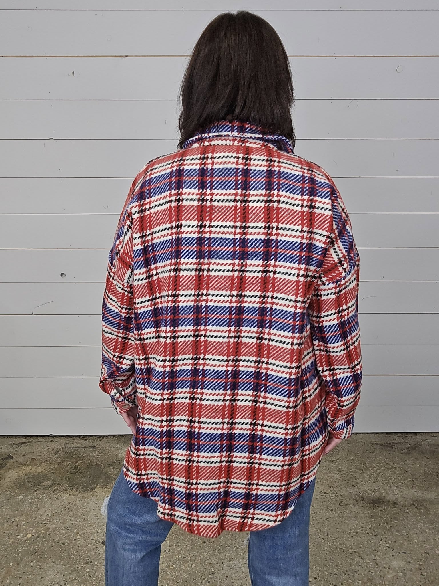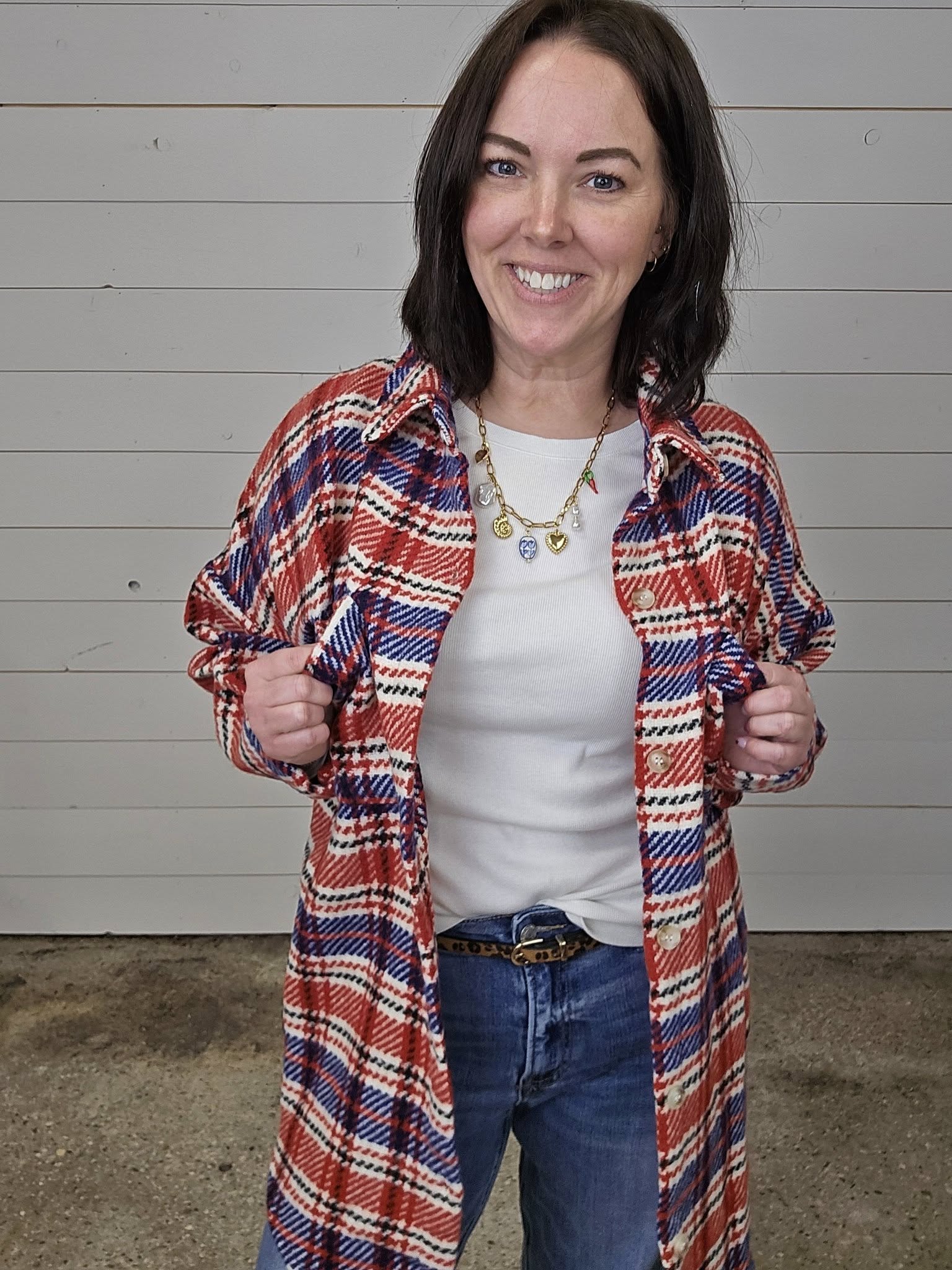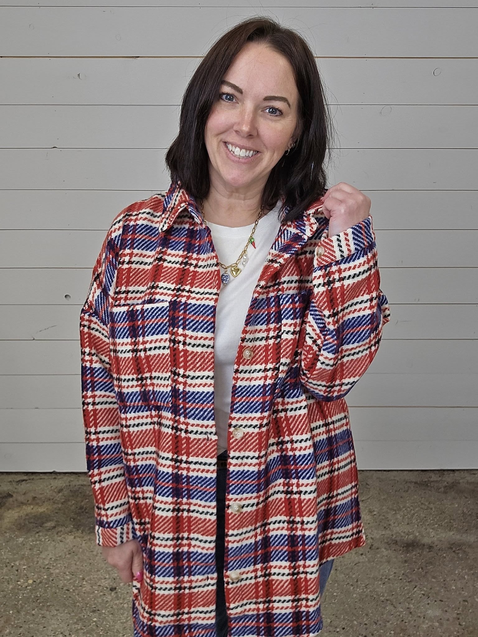 Snag this plaid button down for a laid-back look. Designed with a chest pocket, long sleeves, and a loose fit, this jacket shirt, or "shacket", offers a comfortable and stylish option. Drop shoulder detailing adds a unique touch. Perfect for the fashion-forward, yet casual individual. Runs generous.