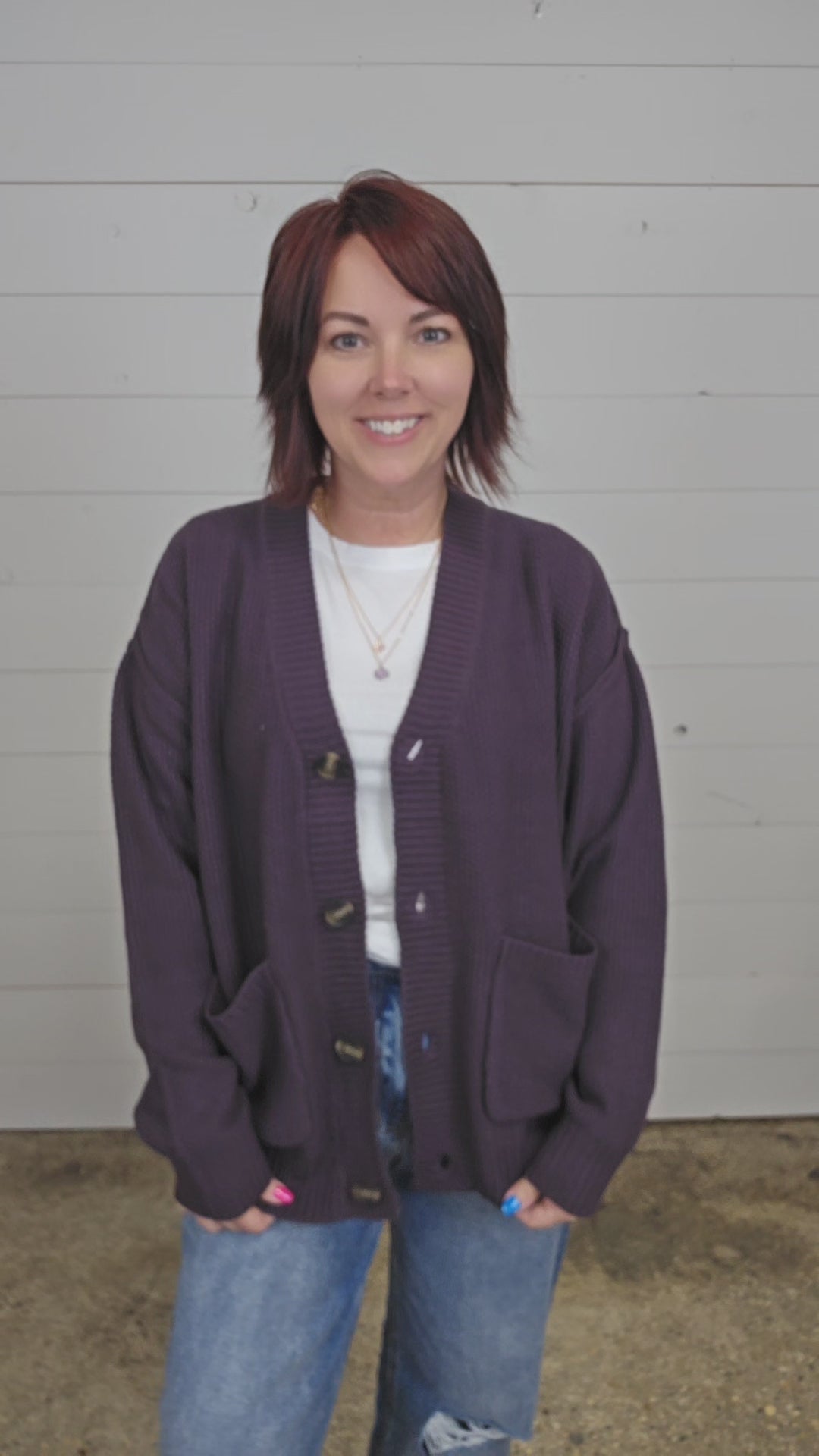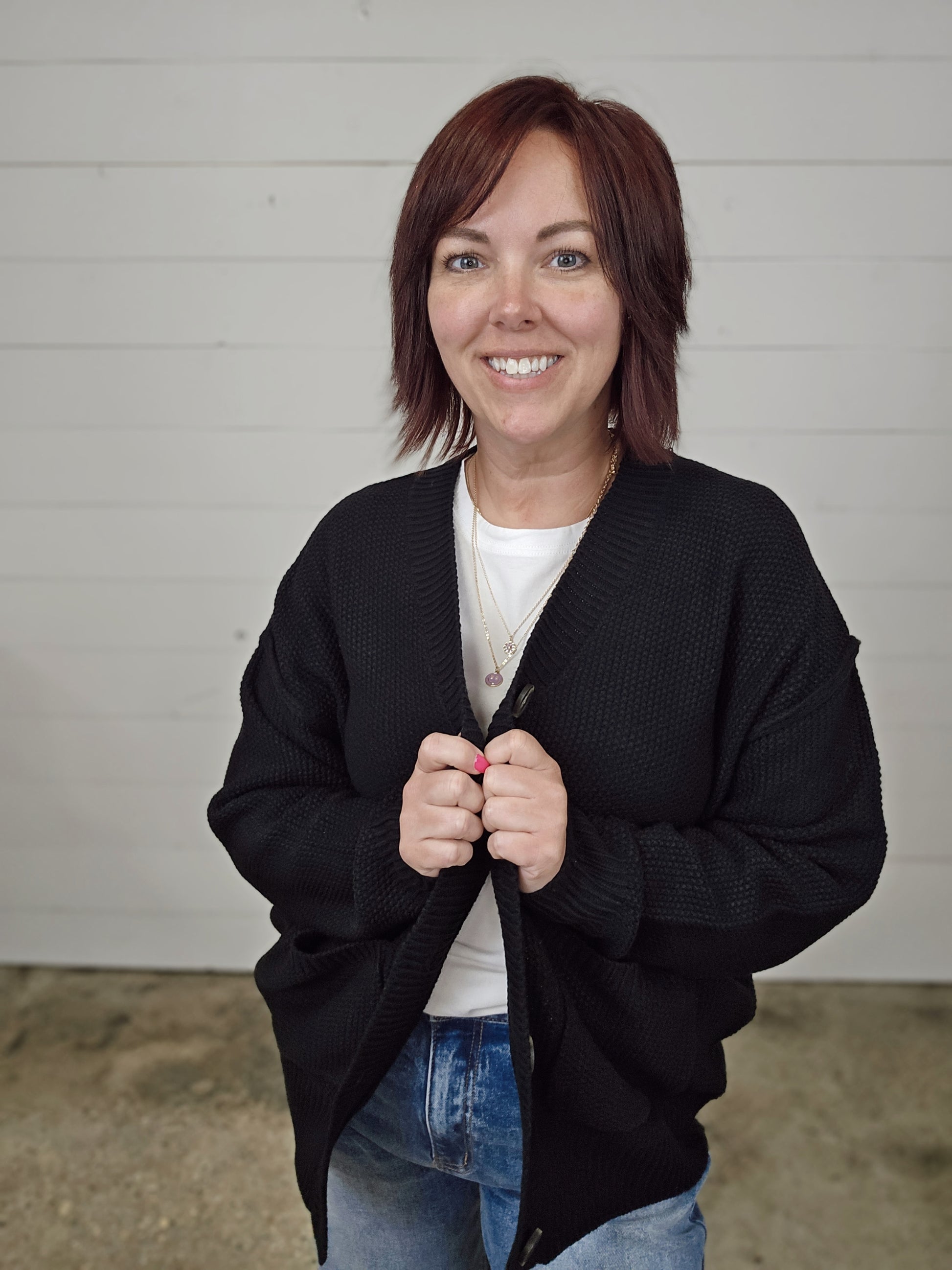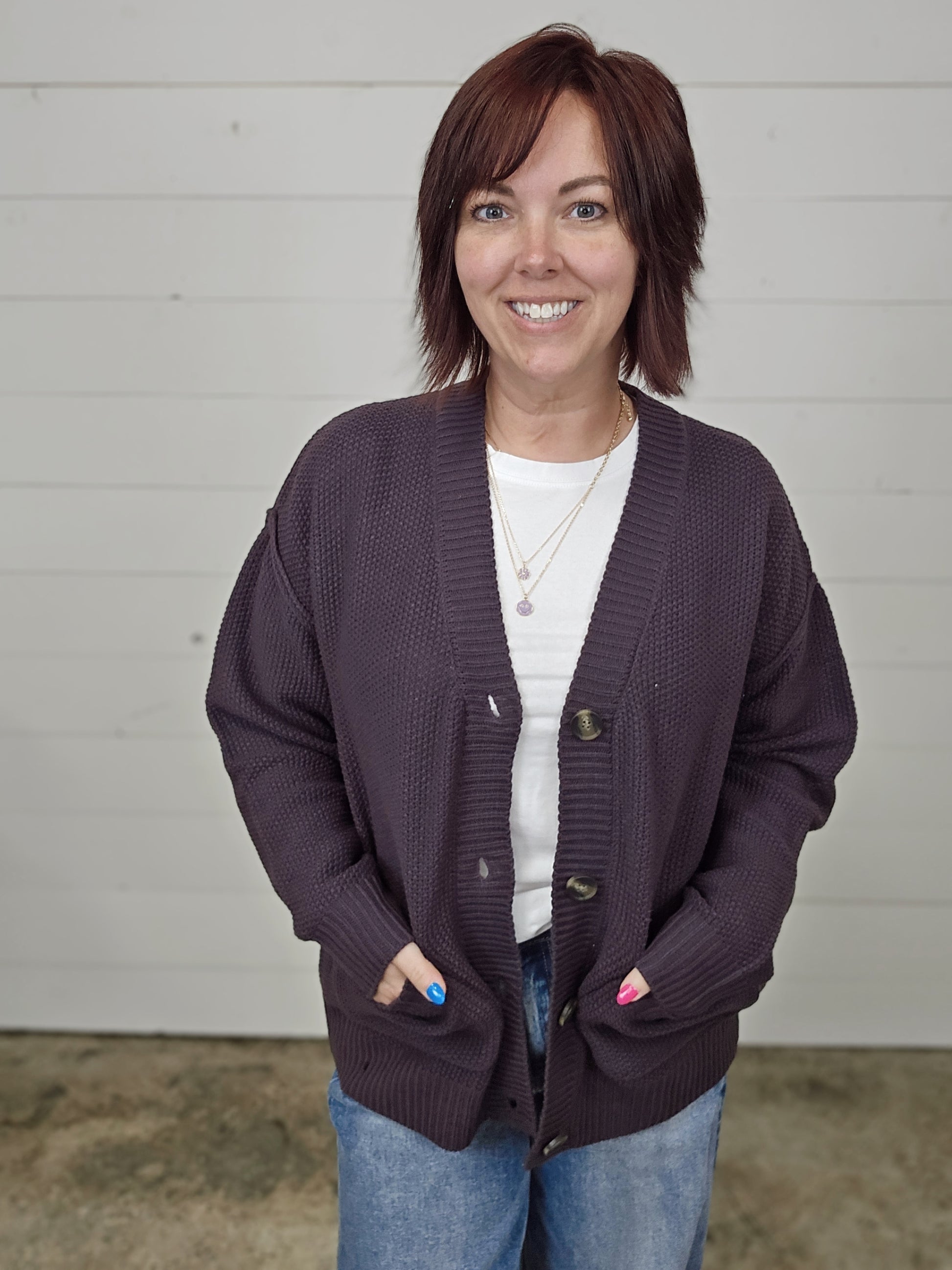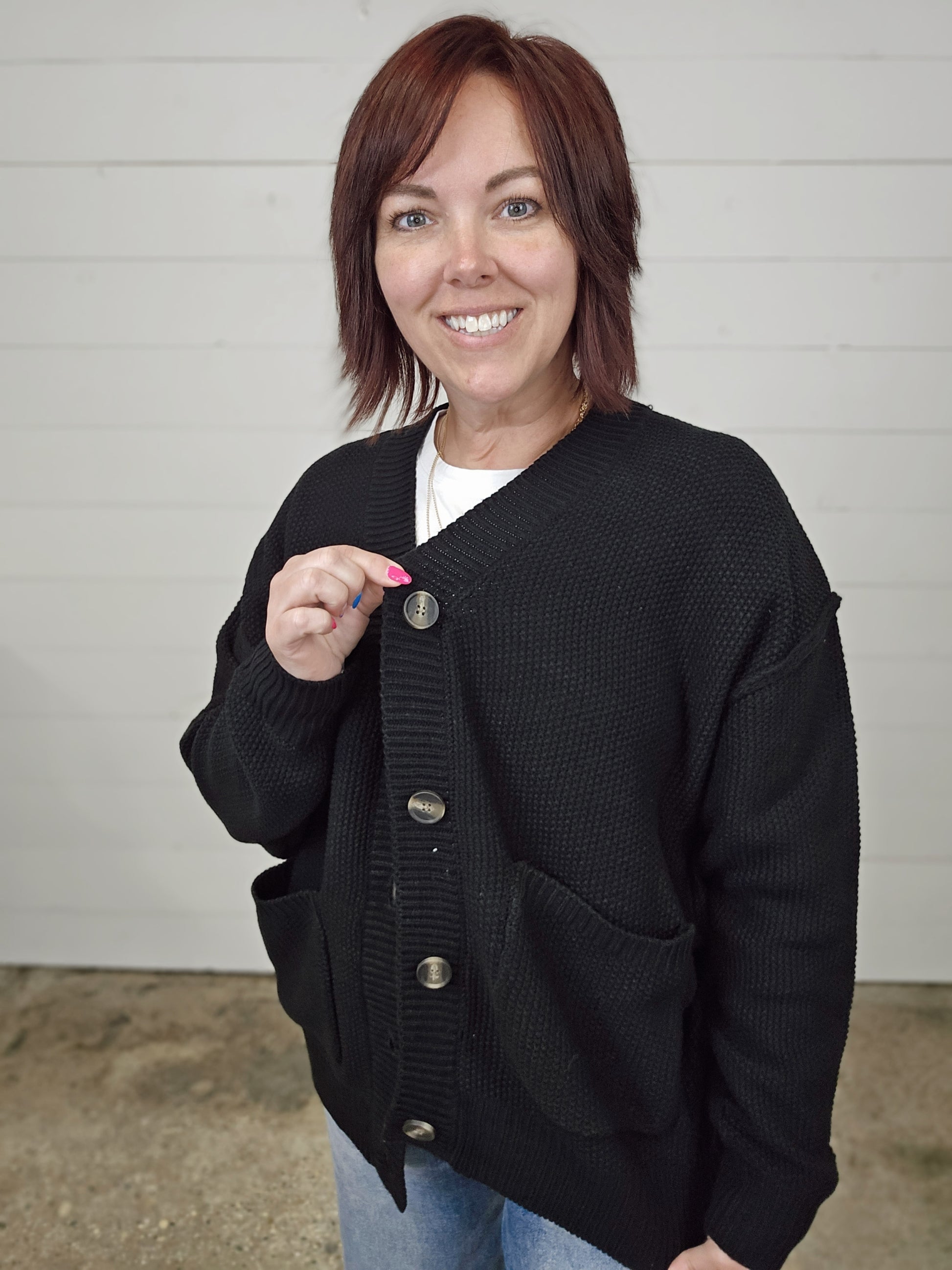 Stay cozy and stylish with our oversized button-up cardigan. The relaxed fit and large pockets offer both functionality and fashion. The thick knit texture provides warmth and comfort, while the large buttons add a fun touch. Perfect for layering over casual outfits or lounge wear. A must-have for staying warm and trendy this season!