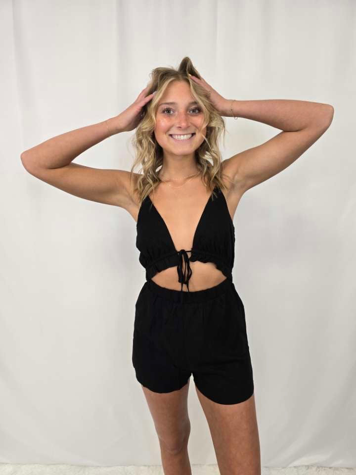 This linen romper will kick off your summer with style. The plunging V-neckline, ruffled trim, and cutout detailing give it a flirty and playful look. The relaxed silhouette of the attached short legs make it perfect for a day out in the sun.