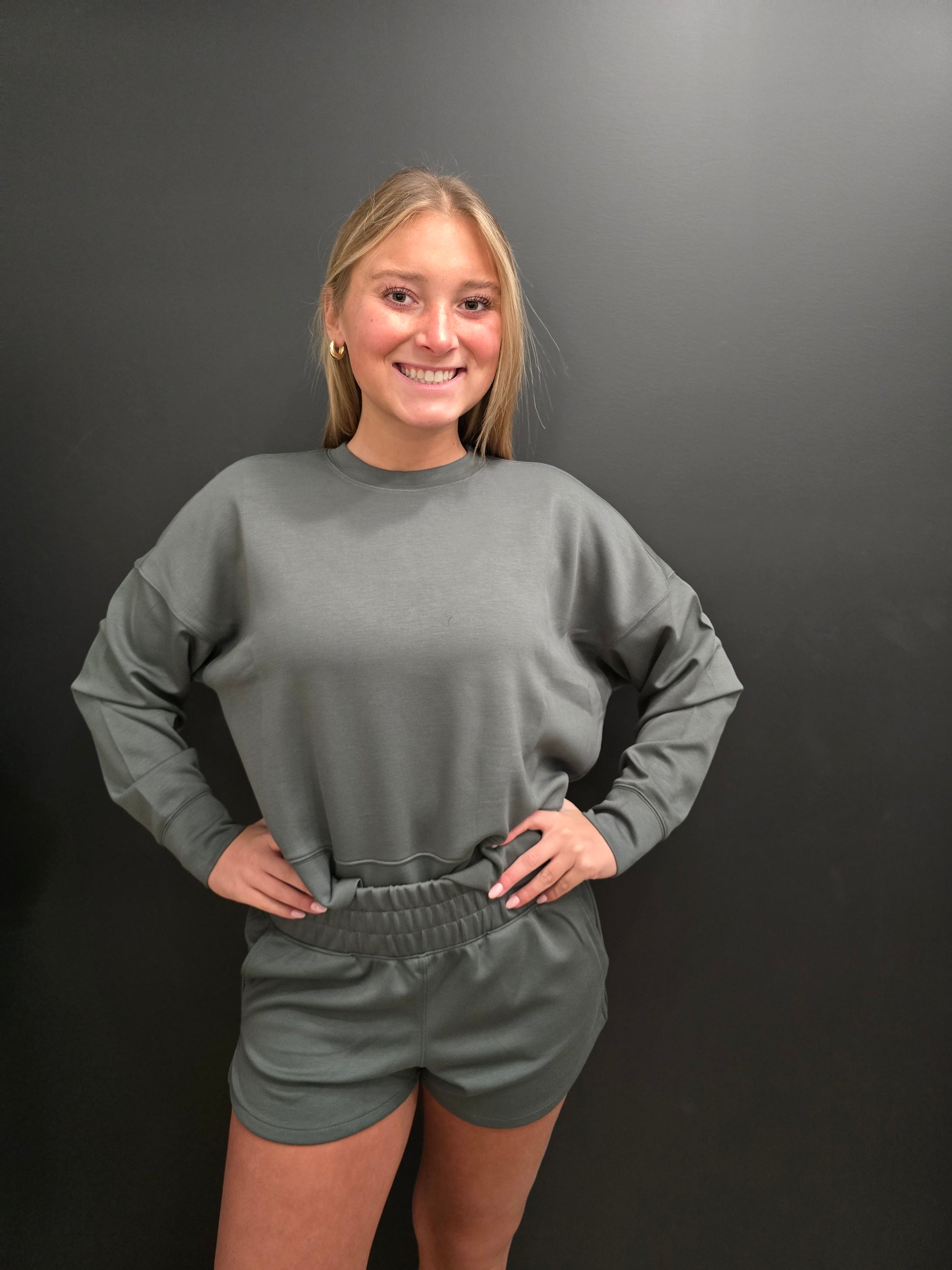 Dive into comfort with this versatile SCUBA set, featuring a long sleeve sweatshirt paired with elastic waistband shorts in dark forest. The shorts include practical side pockets for everyday convenience. Crafted from a premium blend of 50% polyester, 45% rayon, and 5% spandex, this fabric combination delivers exceptional softness, breathability, and gentle stretch for all-day wear. Perfect for lounging, casual outings, or layering. The rayon component adds a luxurious drape while the spandex ensures lasting shape retention through repeated wear and washing.