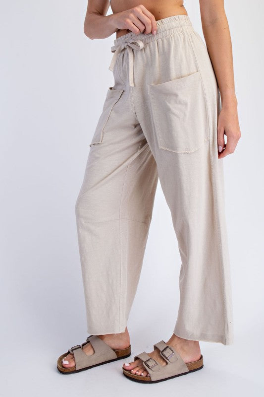 Crafted from breathable cotton slub fabric, these barrel pants in Sand Beige deliver a refined yet relaxed aesthetic perfect for contemporary wardrobes. The cropped silhouette pairs seamlessly with sneakers or flats, while patched front pockets introduce subtle utility styling. Strategic dart detailing at the inner knees provides structure and shape, ensuring a polished fit through the leg. An adjustable elastic waistband accommodates all-day comfort without compromising the elevated silhouette. Lightweight and naturally textured, this versatile piece transitions effortlessly from casual outings to laid-back professional settings.