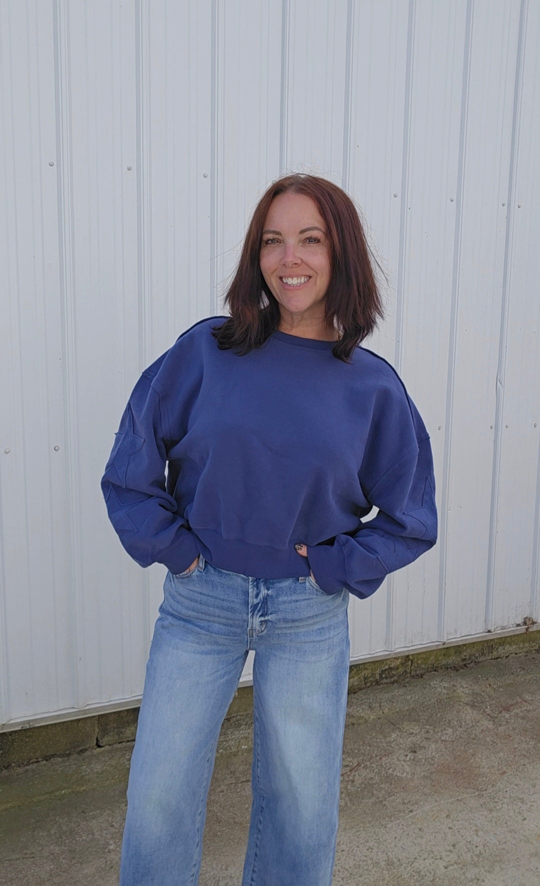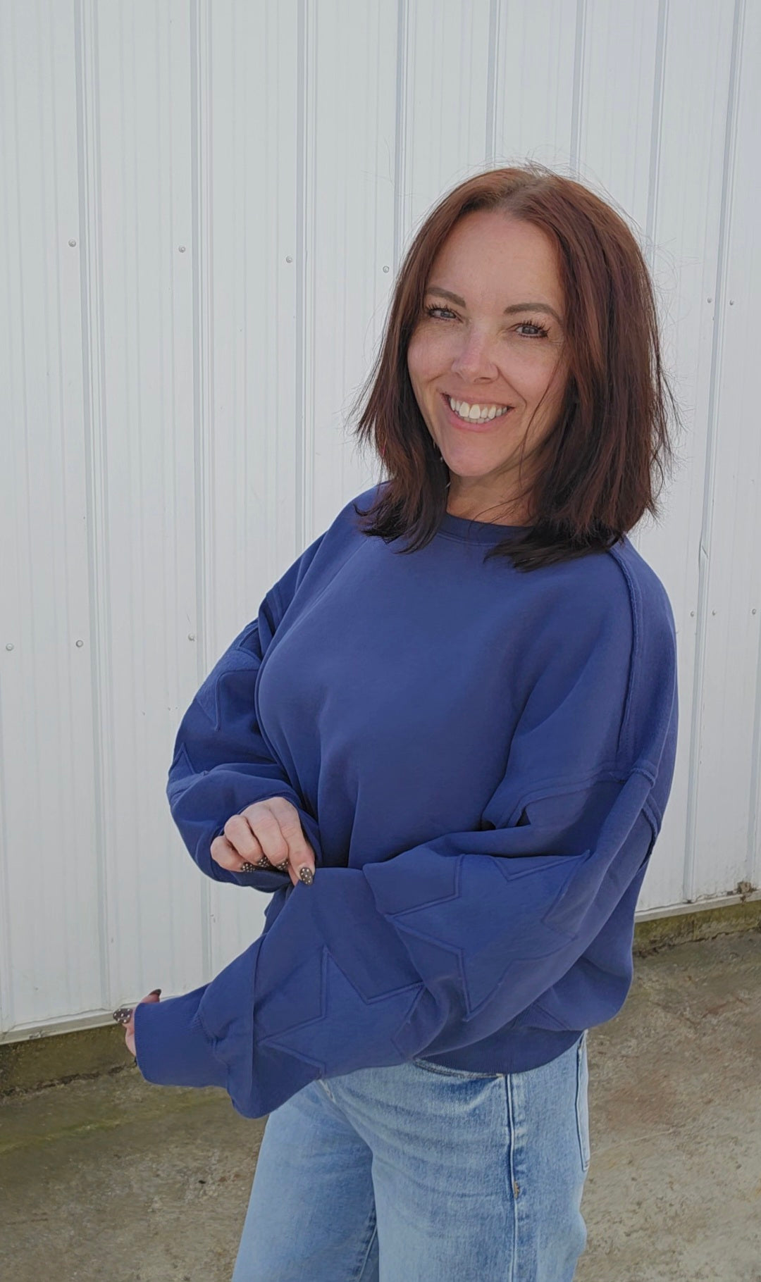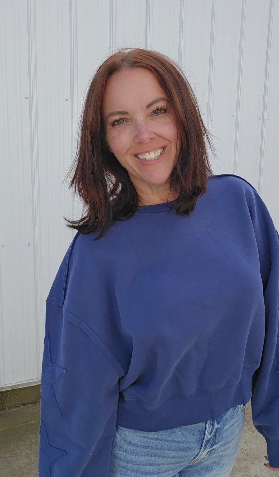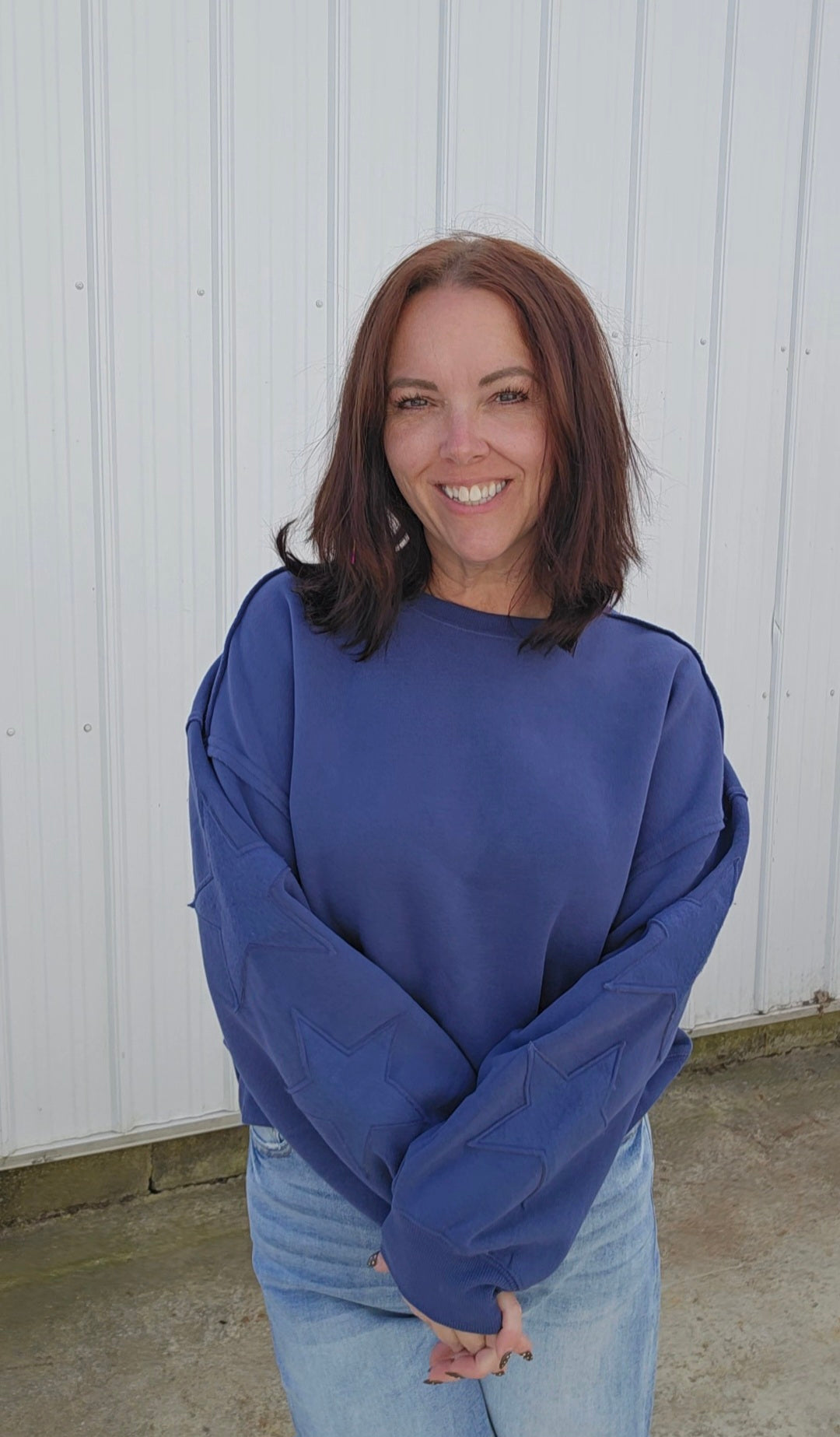 Elevate your casual style with this distinctive crewneck sweatshirt featuring charming star patches on the sleeves. Its relaxed fit ensures all-day comfort, perfect for laid-back days or cozy nights in. Versatile enough to pair with denim or wear layered under a jacket, it effortlessly enhances your wardrobe while keeping you ready for changing seasons. Experience the perfect blend of comfort and style in one unique piece.