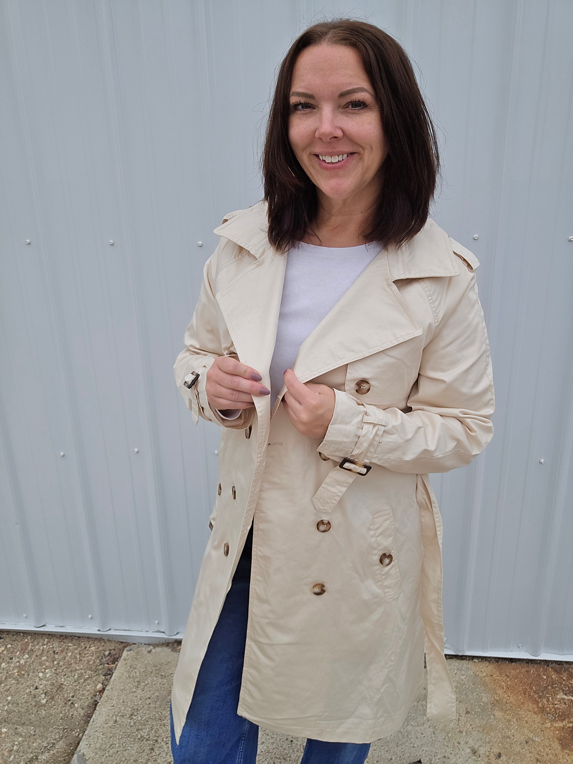 This chic coat features a notched lapel collar and a double-breasted button closure for a classic yet fun twist. Buttoned cuff sleeves and a detachable buckle belt let you play with your look, while the cut-out storm flap detail at the yoke adds a dash of unexpected flair. With handy side pockets and an above-knee length, its longline silhouette keeps you stylishly cozy wherever you go.