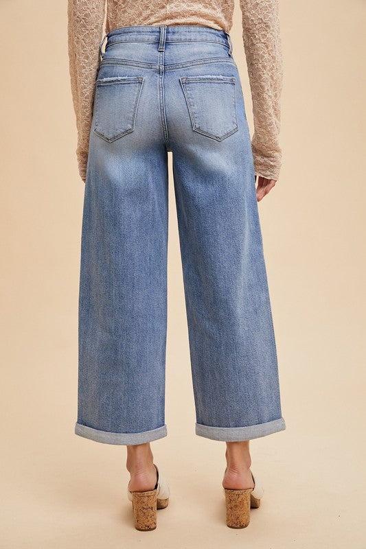 These high-rise wide-leg jeans offer a flattering fit with comfortable stretch denim. Featuring a double roll-up cuff and cropped 28" inseam, they effortlessly blend style and ease. The breathable cotton blend with polyester and spandex ensures durability and flexibility for all-day wear. Perfect for a chic, relaxed look that moves with you.
