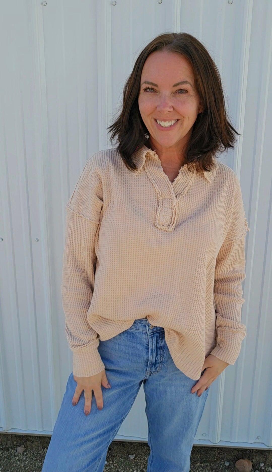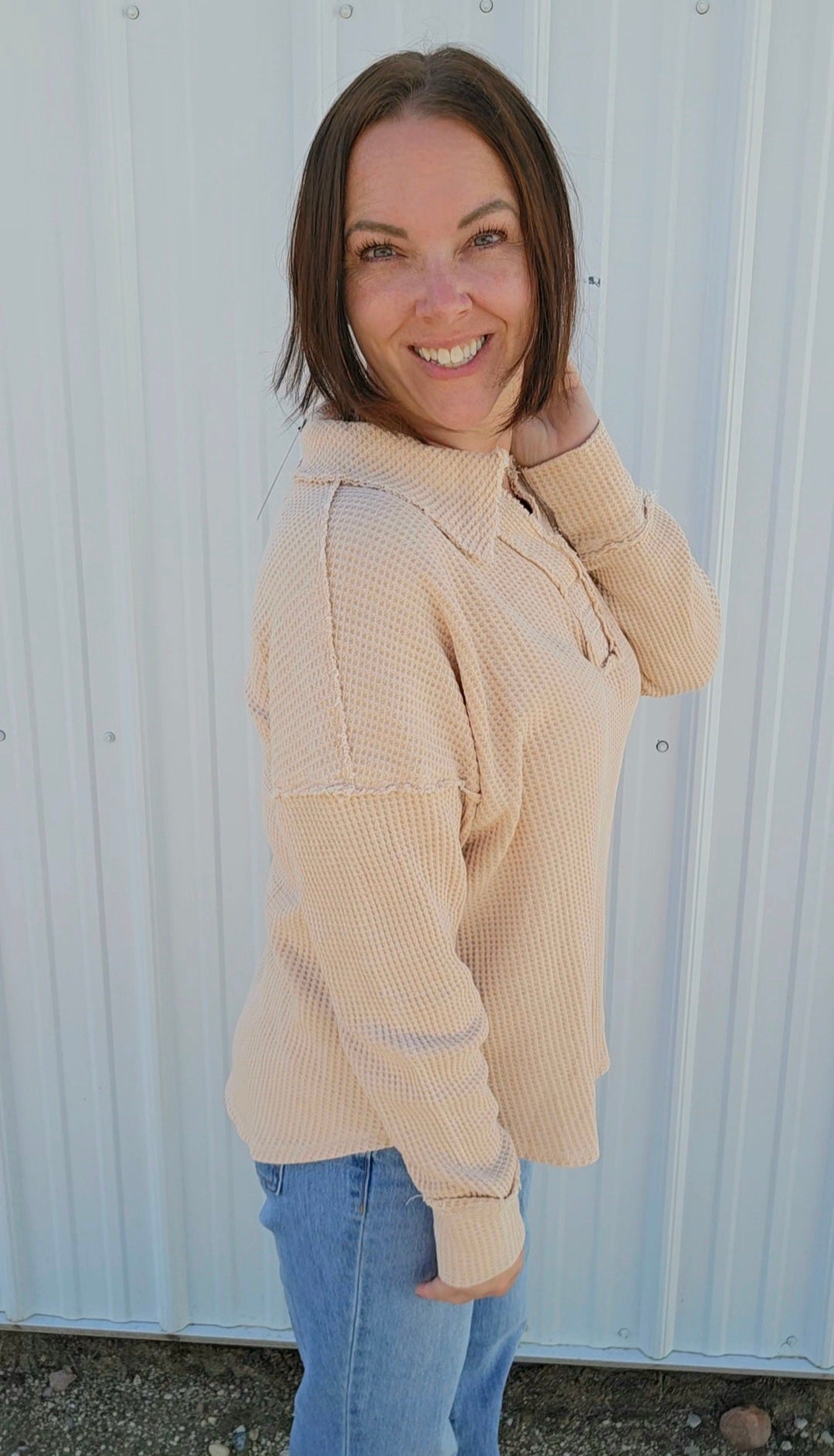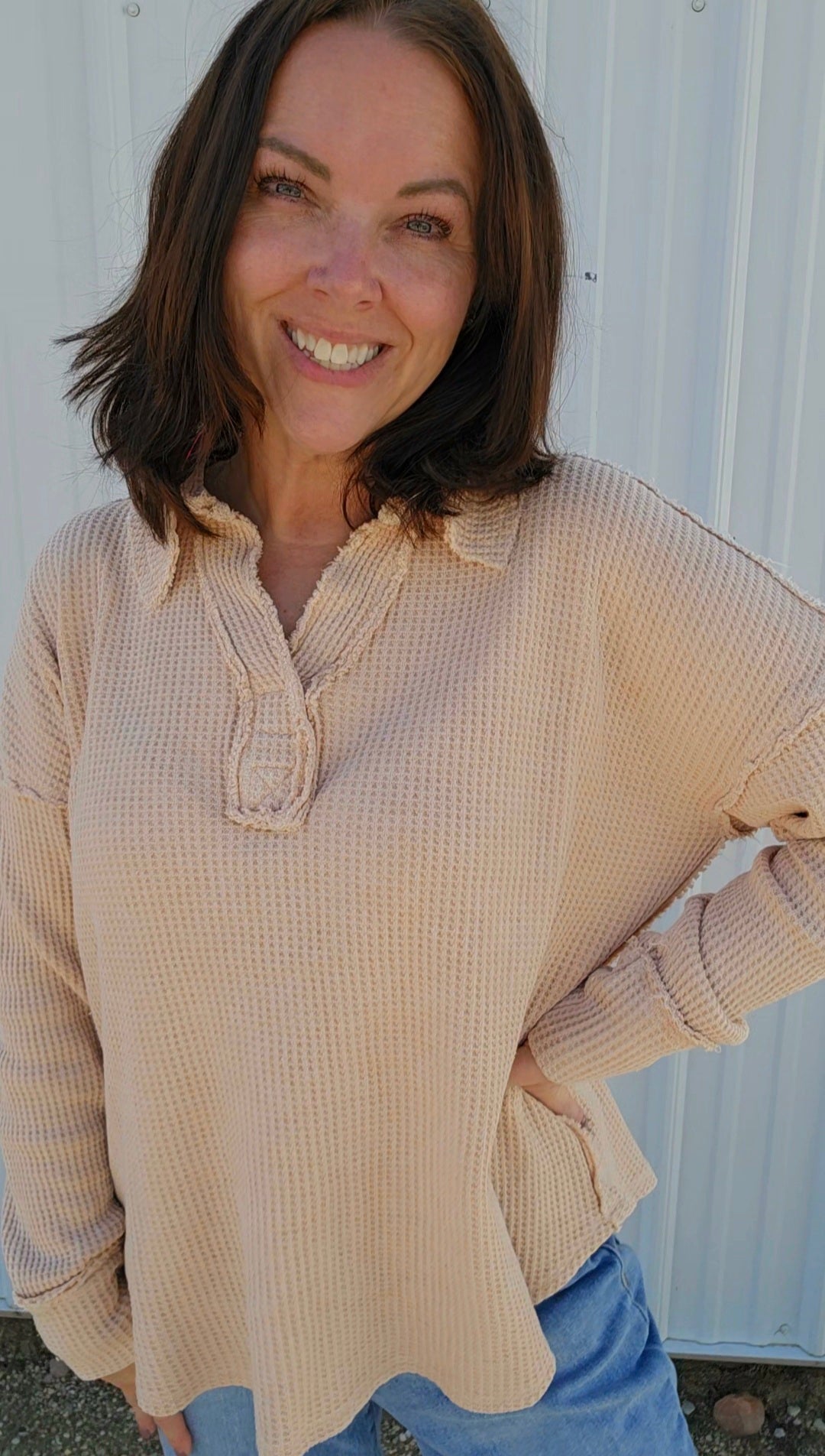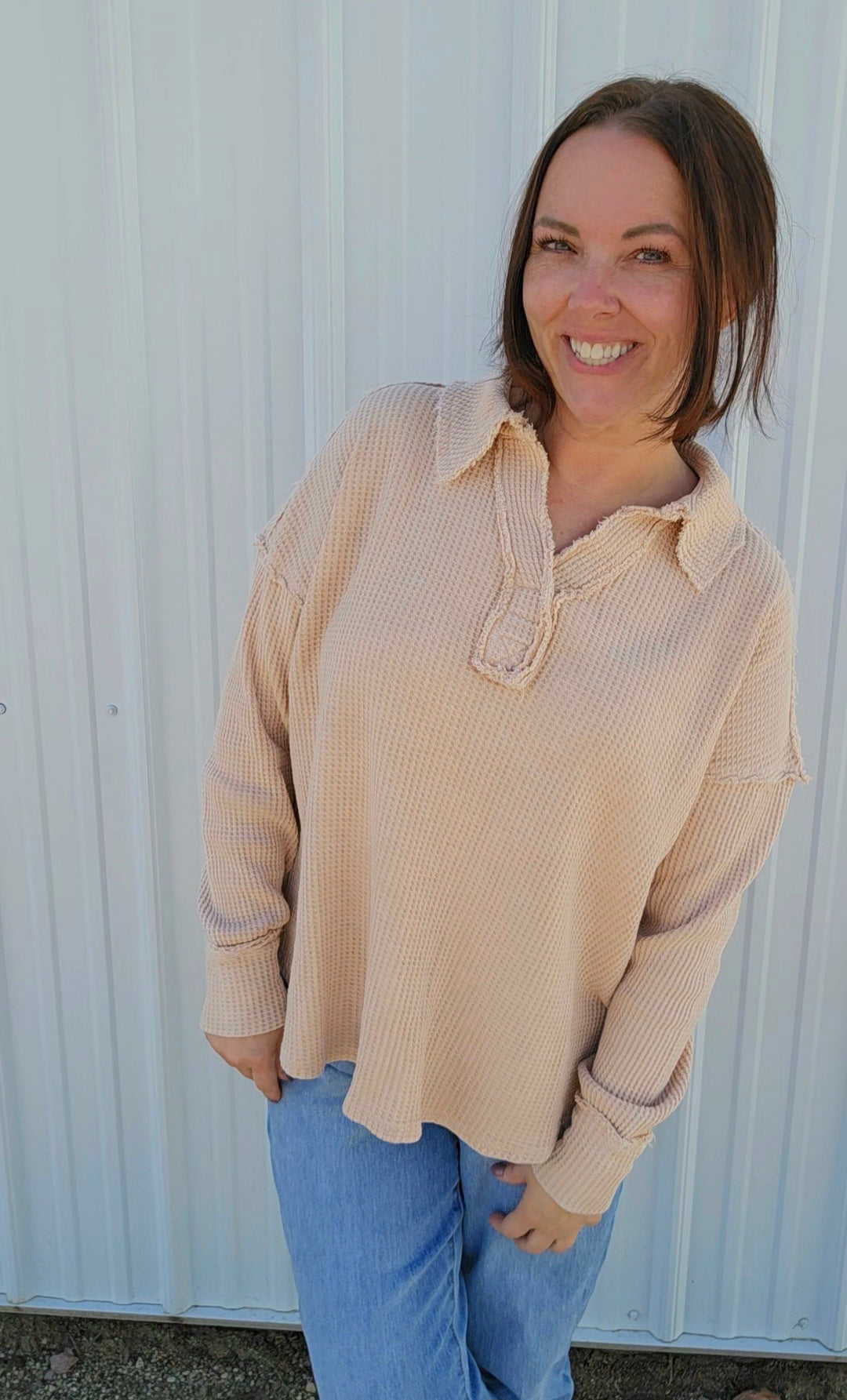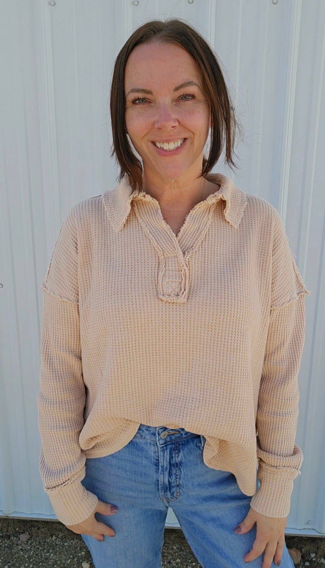 Wrap yourself in cozy charm with this mineral-washed sweatshirt, in Oatmeal, made from soft Textured Cotton Waffle fabric. Its relaxed fit and open polo neckline keep things breezy yet warm, while playful raw seaming details add a dash of personality. Perfect for those days when comfort meets style effortlessly!