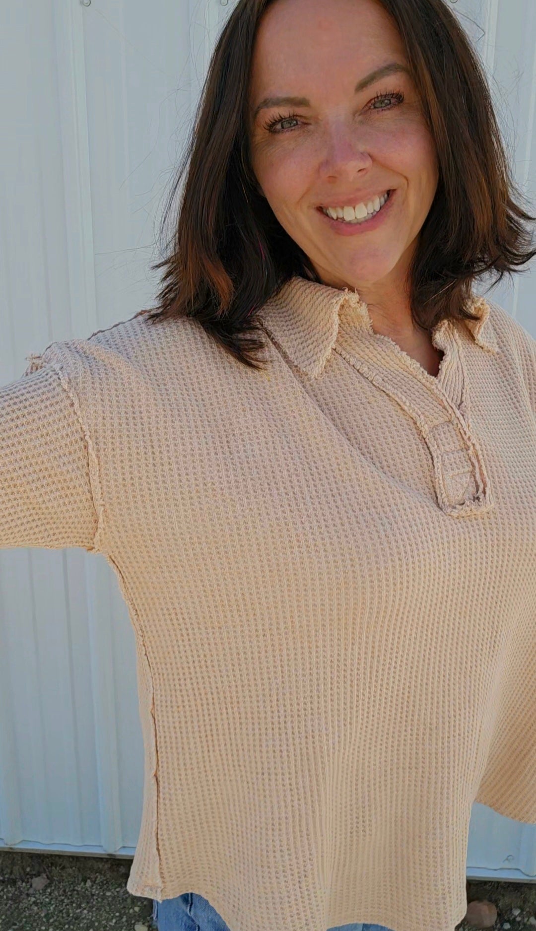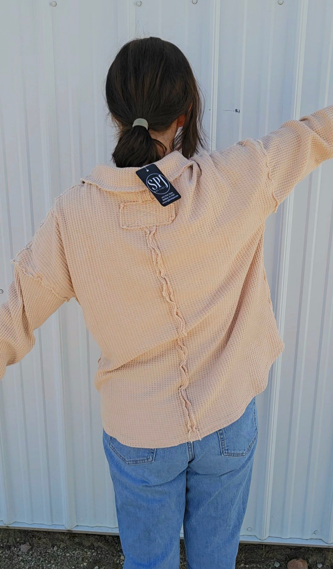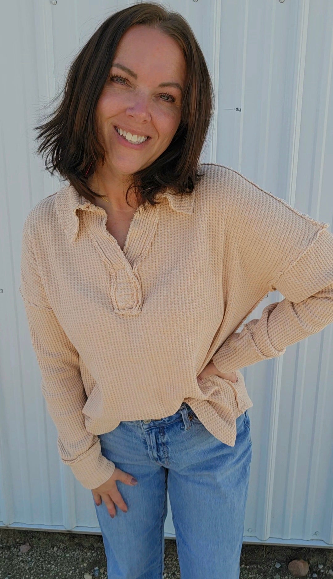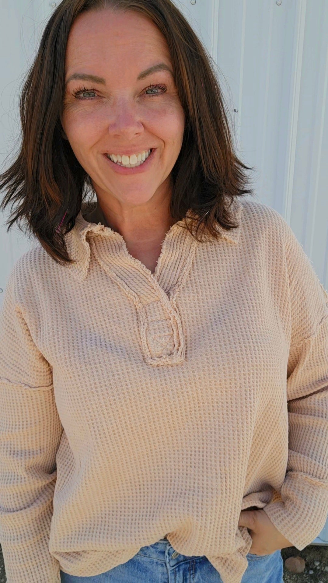 Wrap yourself in cozy charm with this mineral-washed sweatshirt, in Oatmeal, made from soft Textured Cotton Waffle fabric. Its relaxed fit and open polo neckline keep things breezy yet warm, while playful raw seaming details add a dash of personality. Perfect for those days when comfort meets style effortlessly!