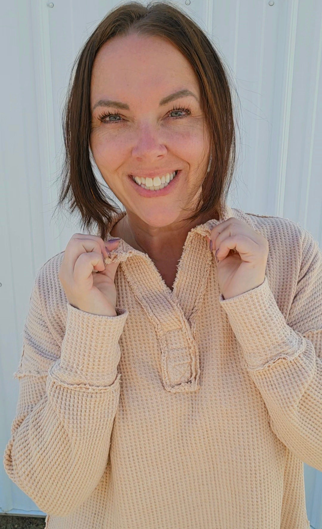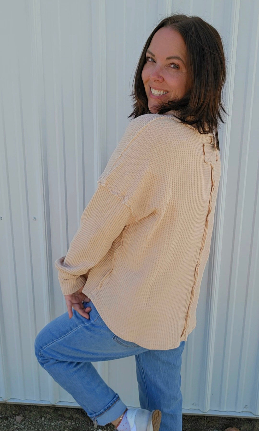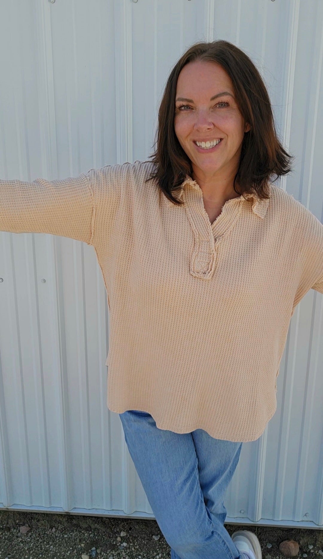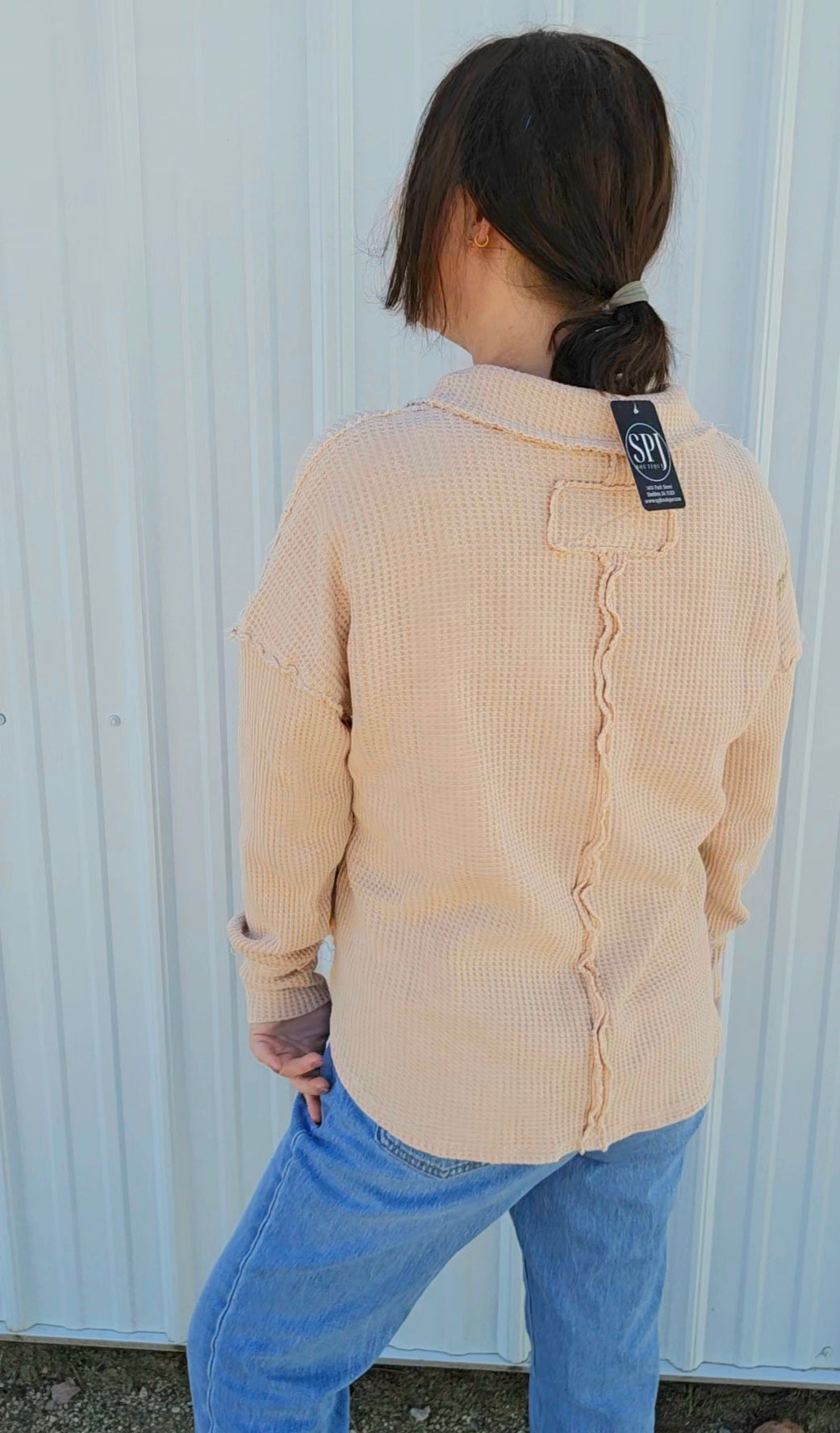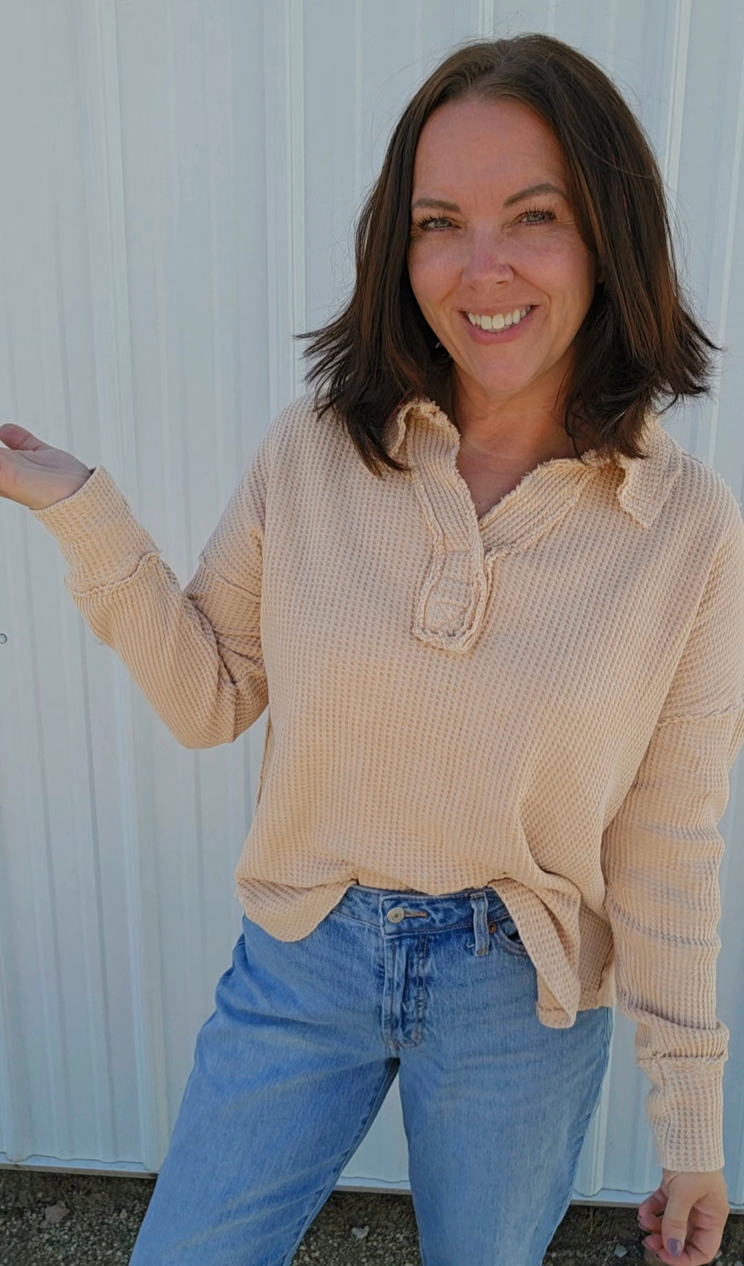 Wrap yourself in cozy charm with this mineral-washed sweatshirt, in Oatmeal, made from soft Textured Cotton Waffle fabric. Its relaxed fit and open polo neckline keep things breezy yet warm, while playful raw seaming details add a dash of personality. Perfect for those days when comfort meets style effortlessly!